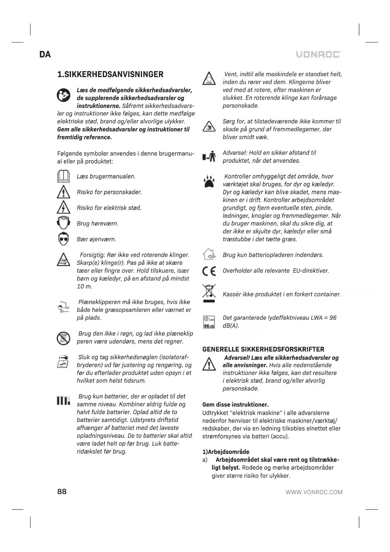 Læs de medfølgende sikkerhedsadvarsler, de supplerende sikkerhedsadvarsler og instruktionerne. Såfremt sikkerhedsadvars- ler og instruktioner ikke følges, kan dette medfølge elektriske stød, brand og/eller alvorlige ulykker. Gem alle sikkerhedsadvarsler og instruktioner til fremtidig reference. Følgende symboler anvendes idenne brugermanu- al eller på produktet: Læs brugermanualen. Risiko for personskader. Risiko for elektrisk stød. Brug høreværn. Bær øjenværn. Forsigtig: Rør ikke ved roterende klinger. Skarp(e) klinge(r). Pas på ikke at skære tæer eller fingre over. Hold tilskuere, især børn og kæledyr, på en afstand på mindst 10 m. Plæneklipperen må ikke bruges, hvis ikke både hele græsopsamleren eller værnet er på plads. Brug den ikke iregn, og lad ikke plæneklip peren være udendørs, mens det regner. Sluk og tag sikkerhedsnøglen (isolatoraf- bryderen) ud før justering og rengøring, og før du efterlader produktet uden opsyn iet hvilket som helst tidsrum. Brug kun batterier, der er opladet til det samme niveau. Kombiner aldrig fulde og halvt fulde batterier. Oplad altid de to batterier samtidigt. Udstyrets driftstid afhænger af batteriet med det laveste opladningsniveau. De to batterier skal altid være ladet helt op før brug. Luk batte- ridækslet før brug. Vent, indtil alle maskindele er standset helt, inden du rører ved dem. Klingerne bliver ved med at rotere, efter maskinen er slukket. En roterende klinge kan forårsage personskade. Sørg for, at tilstedeværende ikke kommer til skade på grund af fremmedlegemer, der bliver smidt væk. Advarsel: Hold en sikker afstand til produktet, når det anvendes. Kontroller omhyggeligt det område, hvor værktøjet skal bruges, for dyr og kæledyr. Dyr og kæledyr kan blive skadet, mens mas- kinen er idrift. Kontroller arbejdsområdet grundigt, og fjern eventuelle sten, pinde, ledninger, knogler og fremmedlegemer. Når du bruger maskinen, skal du sikre dig, at der ikke er skjulte dyr, kæledyr eller små træstubbe idet tætte græs. Brug kun batteriopladeren indendørs. Overholder alle relevante EU-direktiver. Kassér ikke produktet ien forkert container. Det garanterede lydeffektniveau LWA = 96 dB(A). GENERELLE SIKKERHEDSFORSKRIFTER Advarsel! Læs alle sikkerhedsadvarsler og alle anvisninger. Hvis alle nedenstående instruktioner ikke følges, kan det resultere ielektrisk stød, brand og/eller alvorlig personskade. Gem disse instruktioner. Udtrykket “elektrisk maskine” ialle advarslerne nedenfor henviser til elektriske maskiner/værktøj/ redskaber, der via en ledning tilkobles elnettet eller strømforsynes via batteri (accu).