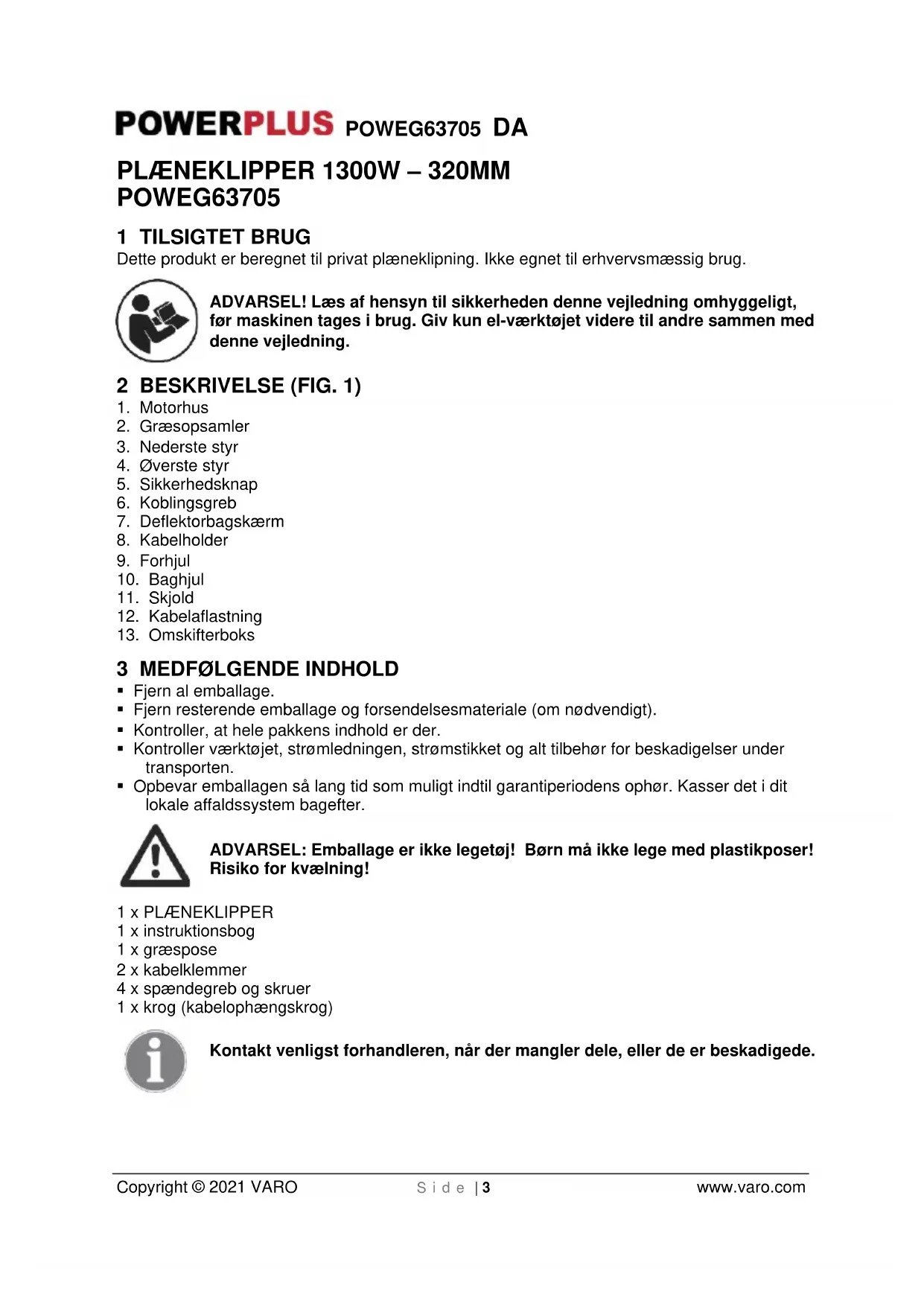- Opbevar emballagen så lang tid som muligt indtil garantiperiodens ophør. Kasser det i dit lokale affaldssystem bagefter. ADVARSEL: Emballage er ikke legetøj! Børn må ikke lege med plastikposer! Risiko for kvælning! 1 x PLÆNEKLIPPER 1 x instruktionsbog 1 x græspose 2 x kabelklemmer 4 x spændegreb og skruer 1 x krog (kabelophængskrog) Kontakt venligst forhandleren, når der mangler dele, eller de er beskadigede.POWEG63705 DA Copyright © 2021 VARO S i d e | 4 www.varo.com 4 SYMBOLER I denne brugervejledning og/eller på maskinen anvendes der følgende piktogrammer: