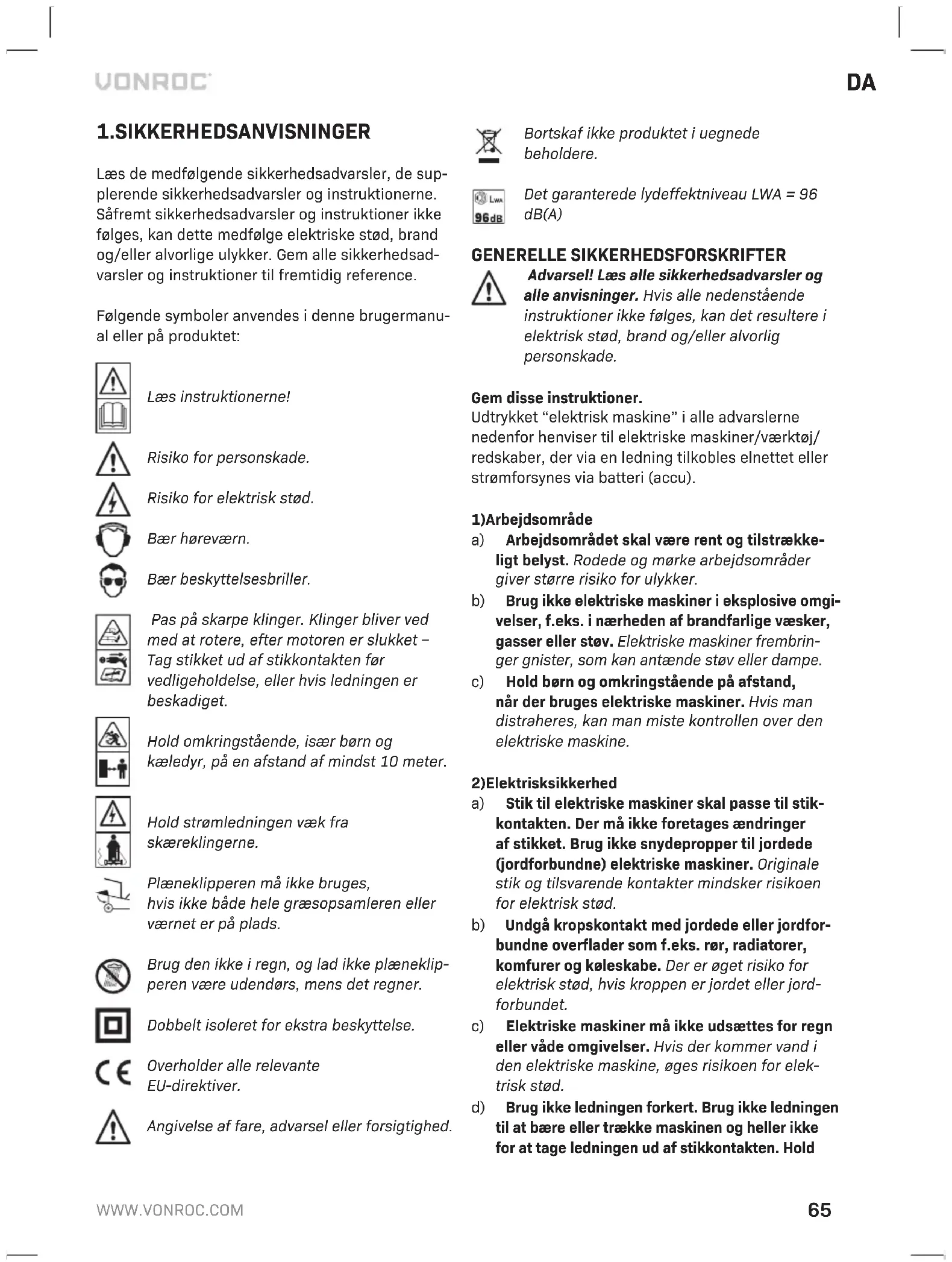 Læs de medfølgende sikkerhedsadvarsler, de sup- plerende sikkerhedsadvarsler og instruktionerne. Såfremt sikkerhedsadvarsler og instruktioner ikke følges, kan dette medfølge elektriske stød, brand og/eller alvorlige ulykker. Gem alle sikkerhedsad- varsler og instruktioner til fremtidig reference. Følgende symboler anvendes i denne brugermanu- al eller på produktet: Læs instruktionerne! Risiko for personskade. Risiko for elektrisk stød. Bær høreværn. Bær beskyttelsesbriller. Pas på skarpe klinger. Klinger bliver ved med at rotere, efter motoren er slukket – Tag stikket ud af stikkontakten før vedligeholdelse, eller hvis ledningen er beskadiget. Hold omkringstående, især børn og kæledyr, på en afstand af mindst 10 meter. Hold strømledningen væk fra skæreklingerne. Plæneklipperen må ikke bruges, hvis ikke både hele græsopsamleren eller værnet er på plads. Brug den ikke i regn, og lad ikke plæneklip- peren være udendørs, mens det regner. Dobbelt isoleret for ekstra beskyttelse. Overholder alle relevante EU-direktiver. Angivelse af fare, advarsel eller forsigtighed. Bortskaf ikke produktet i uegnede beholdere. Det garanterede lydeffektniveau LWA = 96 dB(A) GENERELLE SIKKERHEDSFORSKRIFTER Advarsel! Læs alle sikkerhedsadvarsler og alle anvisninger. Hvis alle nedenstående instruktioner ikke følges, kan det resultere i elektrisk stød, brand og/eller alvorlig personskade. Gem disse instruktioner. Udtrykket “elektrisk maskine” i alle advarslerne nedenfor henviser til elektriske maskiner/værktøj/ redskaber, der via en ledning tilkobles elnettet eller strømforsynes via batteri (accu).