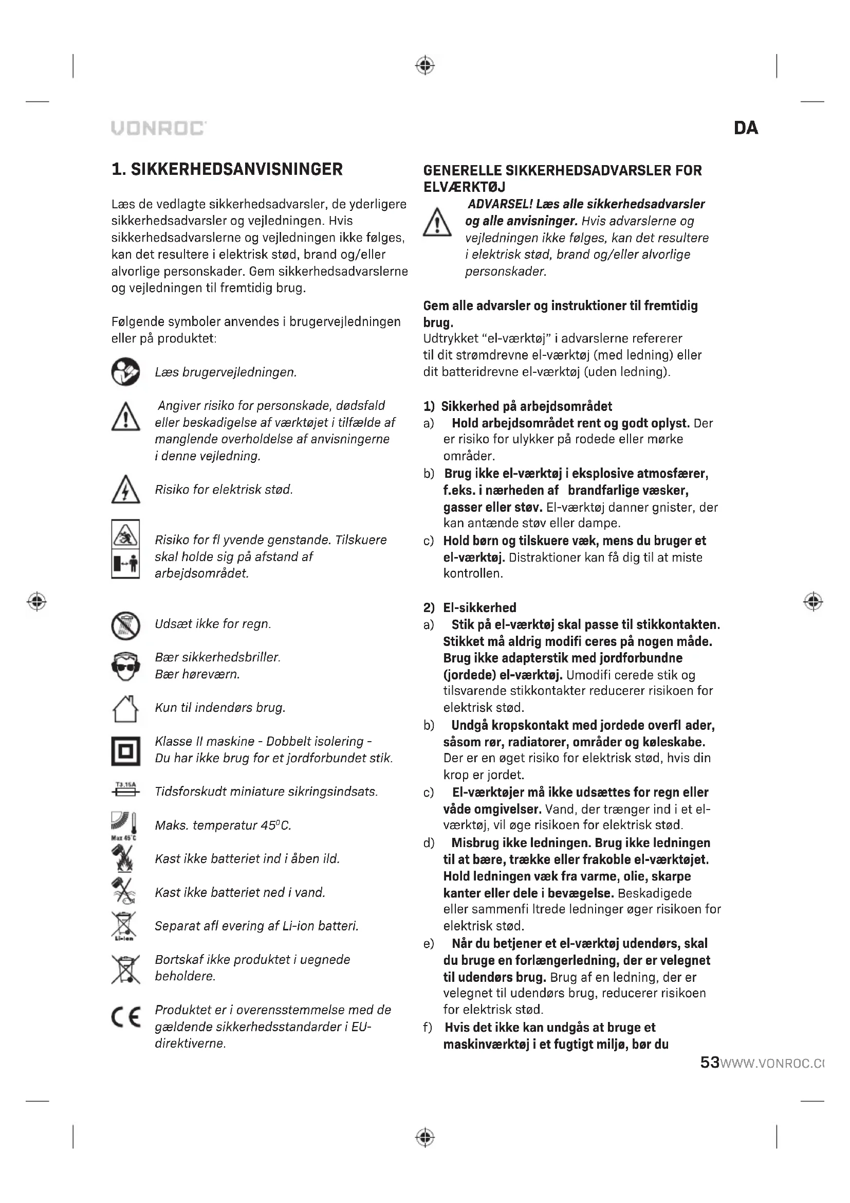 - Der er anvendt ikke-originale reservedele. Dette udgør den eneste garanti, virksomheden har givet, enten udtrykt eller underforstået. Der er ingen andre garantier, udtrykt eller underforstået, som strækker sig ud over denne, herunder de underforståede garantier for salgbarhed og egnethed til et bestemt formål. Under ingen omstændigheder skal VONROC holdes ansvarlig for tilfældige skader eller følgeskader. Forhandlerens retsmidler skal være begrænset til reparation eller udskiftning af enheder eller dele, der ikke overholder kravene. Produktet og brugervejledningen er genstand for ændringer. Specifi kationer kan ændres uden yderligere varsel.60