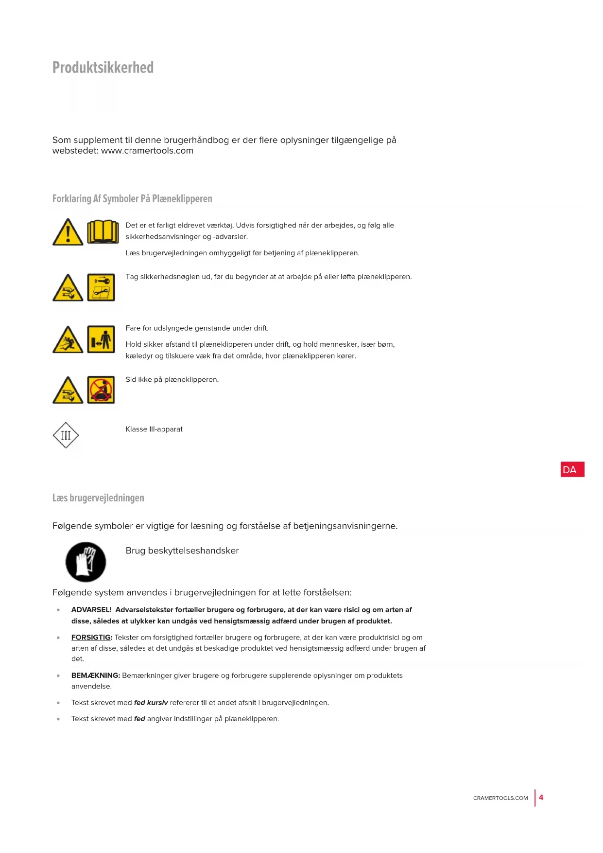 Forklaring Af Symboler På Plæneklipperen Det er et farligt eldrevet værktøj. Udvis forsigtighed når der arbejdes, og følg alle sikkerhedsanvisninger og -advarsler. Læs brugervejledningen omhyggeligt før betjening af plæneklipperen. Tag sikkerhedsnøglen ud, før du begynder at at arbejde på eller løfte plæneklipperen. Fare for udslyngede genstande under drift. Hold sikker afstand til plæneklipperen under drift, og hold mennesker, især børn, kæledyr og tilskuere væk fra det område, hvor plæneklipperen kører. Sid ikke på plæneklipperen. Klasse III-apparat Som supplement til denne brugerhåndbog er der flere oplysninger tilgængelige på webstedet: www.cramertools.com Læs brugervejledningen Følgende symboler er vigtige for læsning og forståelse af betjeningsanvisningerne. Brug beskyttelseshandsker Følgende system anvendes i brugervejledningen for at lette forståelsen: