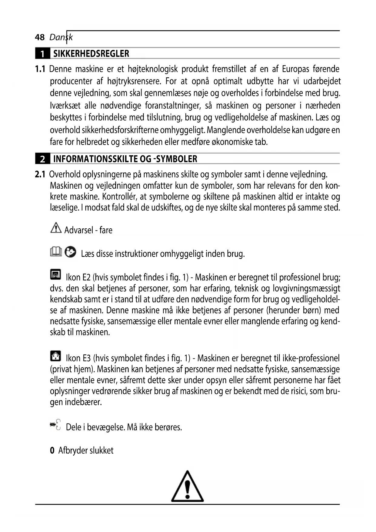 krete maskine. Kontrollér, at symbolerne og skiltene på maskinen altid er intakte og læselige. I modsat fald skal de udskiftes, og de nye skilte skal monteres på samme sted. Advarsel - fare Læs disse instruktioner omhyggeligt inden brug. Ikon E2 (hvis symbolet findes i fig. 1) - Maskinen er beregnet til professionel brug; dvs. den skal betjenes af personer, som har erfaring, teknisk og lovgivningsmæssigt kendskab samt er i stand til at udføre den nødvendige form for brug og vedligeholdel