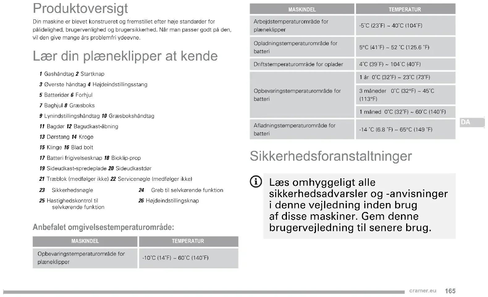 Produktoversigt Din maskine er blevet konstrueret og fremstillet efter høje standarder for pålidelighed, brugervenlighed og brugersikkerhed. Når man passer godt på den, vil den give mange års problemfri ydeevne. Lær din plæneklipper at kende 1 Gashåndtag 2 Startknap3 Øverste håndtag 4 Højdeindstillingsstang5 Batteridør 6 Forhjul7 Baghjul 8 Græsboks9 Lynindstillingshåndtag 10 Græsbokshåndtag11 Bagdør 12 Bagudkast-åbning13 Dørstang 14 Kroge15 Klinge 16 Blad bolt17 Batteri frigivelsesknap 18 Bioklip-prop19 Sideudkast-spredeplade 20 Sideudkastdør21 Træblok (medfølger ikke) 22 Servicenøgle (medfølger ikke) 23 Sikkerhedsnøgle 24 Greb til selvkørende funktion 25 Hastighedskontrol til selvkørende funktion26 Højdeindstillingsknap Anbefalet omgivelsestemperaturområde: MASKINDEL TEMPERATUR Opbevaringstemperaturområde for plæneklipper-10˚C (14˚F) ~ 60˚C (140˚F) MASKINDEL TEMPERATUR Arbejdstemperaturområde for plæneklipper-5˚C (23˚F) ~ 40˚C (104˚F) Opladningstemperaturområde for batteri 5°C (41˚F) ~ 52 ˚C (125.6 ˚F)Driftstemperaturområde for oplader 4˚C (39˚F) ~ 104˚C (40˚F) Opbevaringstemperaturområde for batteri 1 år 0˚C (32˚F) ~ 23˚C (73˚F) 3 måneder 0˚C (32°F) ~ 45˚C (113°F) 1 måned 0˚C (32˚F) ~ 60˚C (140˚F)Afladningstemperaturområde for batteri -14 ˚C (6.8 ˚F) ~ 65°C (149 ˚F) Sikkerhedsforanstaltninger Læs omhyggeligt alle sikkerhedsadvarsler og -anvisninger i denne vejledning inden brug af disse maskiner. Gem denne brugervejledning til senere brug.166 cramer.eu