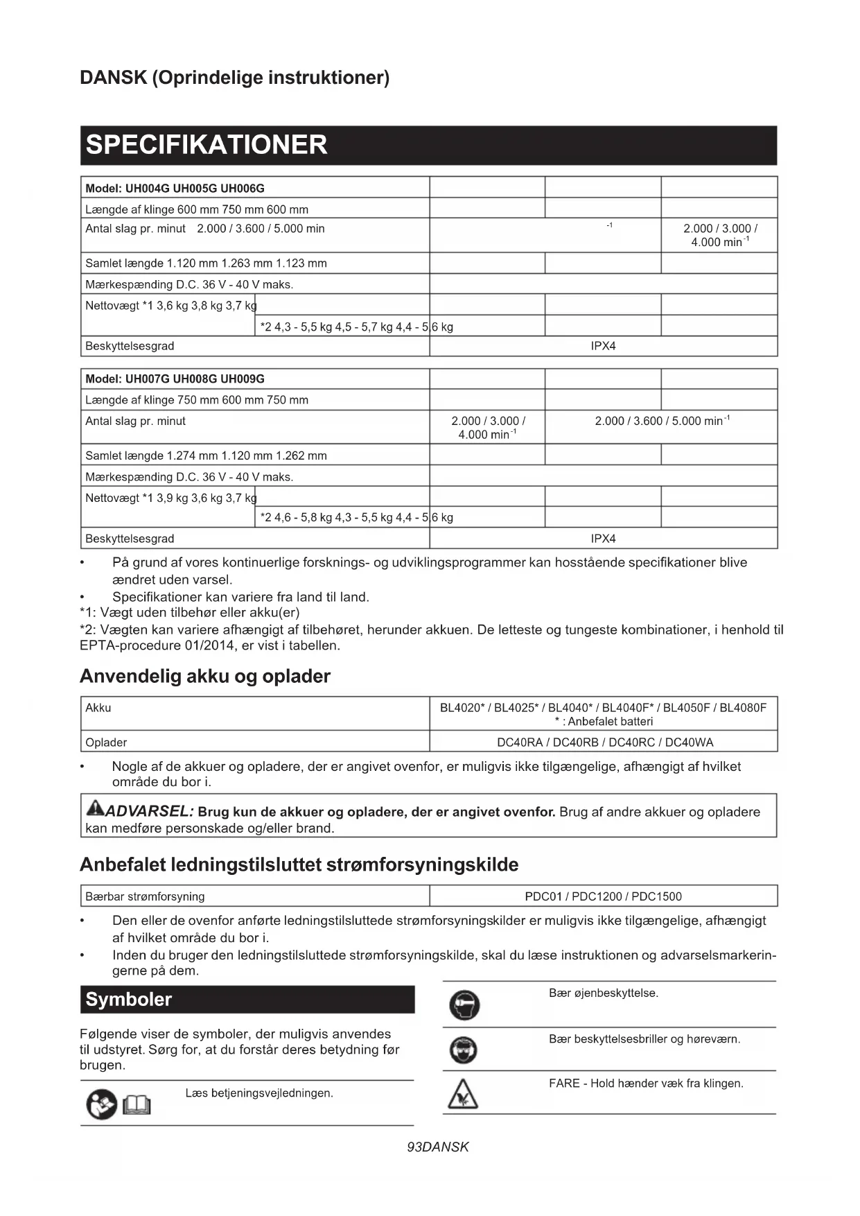 Samlet længde 1.120 mm 1.263 mm 1.123 mm Mærkespænding D.C. 36 V - 40 V maks. Nettovægt *1 3,6 kg 3,8 kg 3,7 kg *2 4,3 - 5,5 kg 4,5 - 5,7 kg 4,4 - 5,6 kg Beskyttelsesgrad IPX4 Model: UH007G UH008G UH009G Længde af klinge 750 mm 600 mm 750 mm Antalslagpr.minut 2.000 / 3.000 /