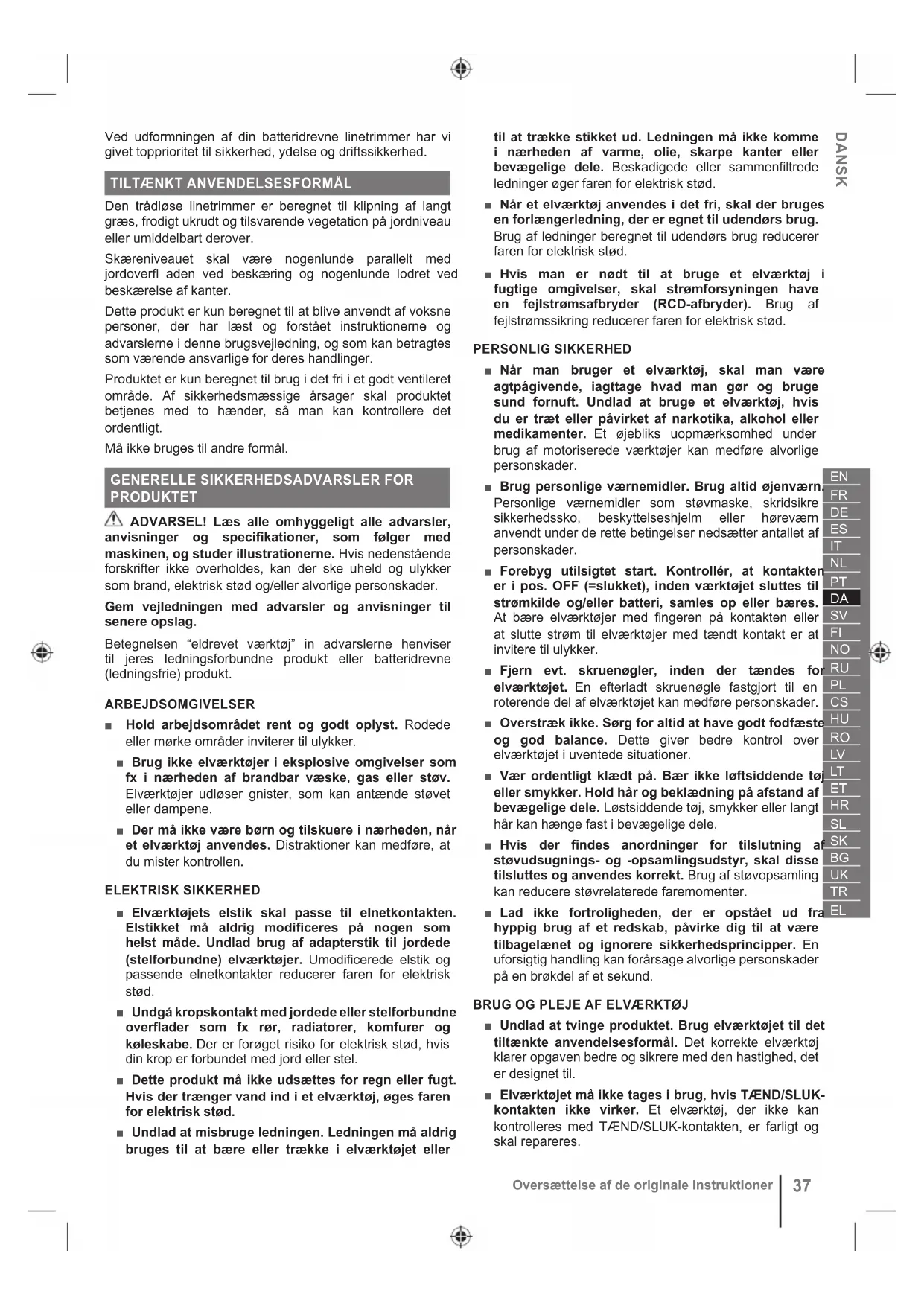 ■ Sørg for altid at have et godt fodfæste, og betjen kun maskinen, når du står på jorden. Glatte eller ustabile overflader kan forårsage tab af balance eller kontrol over maskinen. ■ Betjen ikke maskinen på meget stejle skråninger. Dette reducerer risikoen for at miste kontrollen, glide og falde, hvilket kan resultere i personskade. ■ Når du arbejder på skråninger, skal du altid sikre dig et godt fodfæste, altid arbejde på tværs af skråninger, aldrig op eller ned og udvise ekstrem forsigtighed, når du skifter retning. Dette reducerer risikoen for at miste kontrollen, glide og falde, hvilket kan resultere i personskade. ■ Hold alle kropsdele på afstand af klingen, når maskinen er i drift. Før du starter maskinen, skal du sørge for, at skæret, linen eller klingen ikke kommer i berøring med noget. Et øjebliks uopmærksomhed under betjening af maskinen kan resultere i skade på dig selv eller andre. ■ Betjen ikke maskinen over livhøjde. Dette hjælper med at forhindre utilsigtet kontakt med skæret eller klingen og muliggør bedre kontrol af maskinen i uventede situationer. ■ Vær opmærksom på tilbageslag ved klipning af buske eller ungtræer, der er under spænding. Når spændingen i træfibrene udløses, kan busken eller ungtræet ramme operatøren og/eller slå maskinen ud af kontrol. ■ Vær ekstremt forsigtig ved savning af buske og unge træer. Det tynde materiale kan fange klingen og blive pisket mod dig eller trække dig ud af balance. ■ Bevar kontrollen over maskinen, og berør ikke skær, ledninger eller klinger og andre farlige bevægelige dele, mens de stadig er i bevægelse. Dette reducerer risikoen for personskade fra bevægelige dele. ■ Bær maskinen, mens den er slukket og væk fra din krop. Korrekt håndtering af maskinen vil reducere sandsynligheden for utilsigtet kontakt med et bevægeligt skær, line eller klinge. ■ Brug kun udskiftningsskær, -linjer, -skærehoveder og -klinger, der er specificeret af producenten. Ukorrekte reservedele kan øge risikoen for brud og personskade. ■ Når du fjerner fastklemt materiale eller servicerer maskinen, skal du sørge for, at alle afbrydere er slukket, og at batteripakken er fjernet. Uventet start af motorsaven, under fjernelse af fastklemt materiale eller servicering, kan medføre alvorlig personskade. EKSTRA SIKKERHEDSADVARSLER ■ Inden ibrugtagning og efter enhver ydre påvirkning skal man kontrollere, at der ikke findes beskadigede dele. En defekt kontakt eller en del, som er blevet beskadiget eller slidt, skal repareres ordentligt eller udskiftes på et autoriseret serviceværksted. ■ Den lille klinge, der sidder fast på sikkerhedsafskærmningen, er beregnet til at afskære den fornyligt forlængede line til den korrekte længde af hensyn til sikkerheden og bedst mulige resultat. Kniven er meget skarp. Berør ikke kniven, især ikke når du rengører produktet. ■ Brug kun udskiftningstråd fra producenten. Der må ikke bruges andet skærende udstyr. ■ Kontrollér, at klippeudstyret er monteret korrekt og ordentligt fastgjort. ■ Produktet må aldrig benyttes, før alle skærme, deflektorer og håndtag er fastgjort ordentligt og sikkert. ■ Sørg for, at afklipningsklingen i sikkerhedsafskærmningen er korrekt placeret og fastgjort før hver brug. ■ Hold hovedtilbehøret under livniveau. ■ Sluk med det samme, og fjern batteripakken i tilfælde af en ulykke eller et nedbrud. Betjen ikke produktet igen, før det er blevet kontrolleret fuldstændigt af et godkendt servicecenter. ■ Sluk altid for produktet, fjern batteripakken og lad begge dele køle af for at reducere risikoen for personskader ved kontakt med bevægelige dele. Kontrollér, at alle bevægelige dele er standset fuldstændigt: ● før betjening ● før rydning af en blokering ● inden kontrol, rengøring eller arbejde på produktet ● før der skiftes tilbehør ● efter at have ramt et fremmedelement ● når produktet efterlades uden opsyn ● under vedligeholdelse ● hvis produktet begynder at vibrere unormalt ■ Sørg for, at alle afskærmninger og håndtag er korrekt monteret og i god stand. ■ Hold produktet i de hertil indrettede håndtag, og begræns arbejdstiden og eksponeringen. ■ Pas på bortslyngede objekter fra klippeudstyr. Fjern affald som små sten, ral og andre fremmedlegemer fra arbejdsområdet, inden arbejdets start. Ledninger og snore kan blive viklet ind i klippeudstyret. ■ Sørg altid for, at ventilationsåbningerne er fri for affald. ■ Længere tids brug af et værktøj kan forårsage - eller forværre - personskader. Når du bruger produktet i længere perioder, skal du sørge for at tage regelmæssige pauser. ■ Brug kun produktet ved temperaturer mellem 0° C og 40° C. ■ Opbevar produktet et sted, hvor omgivelsestemperaturen er mellem 0° C og 40° C.
