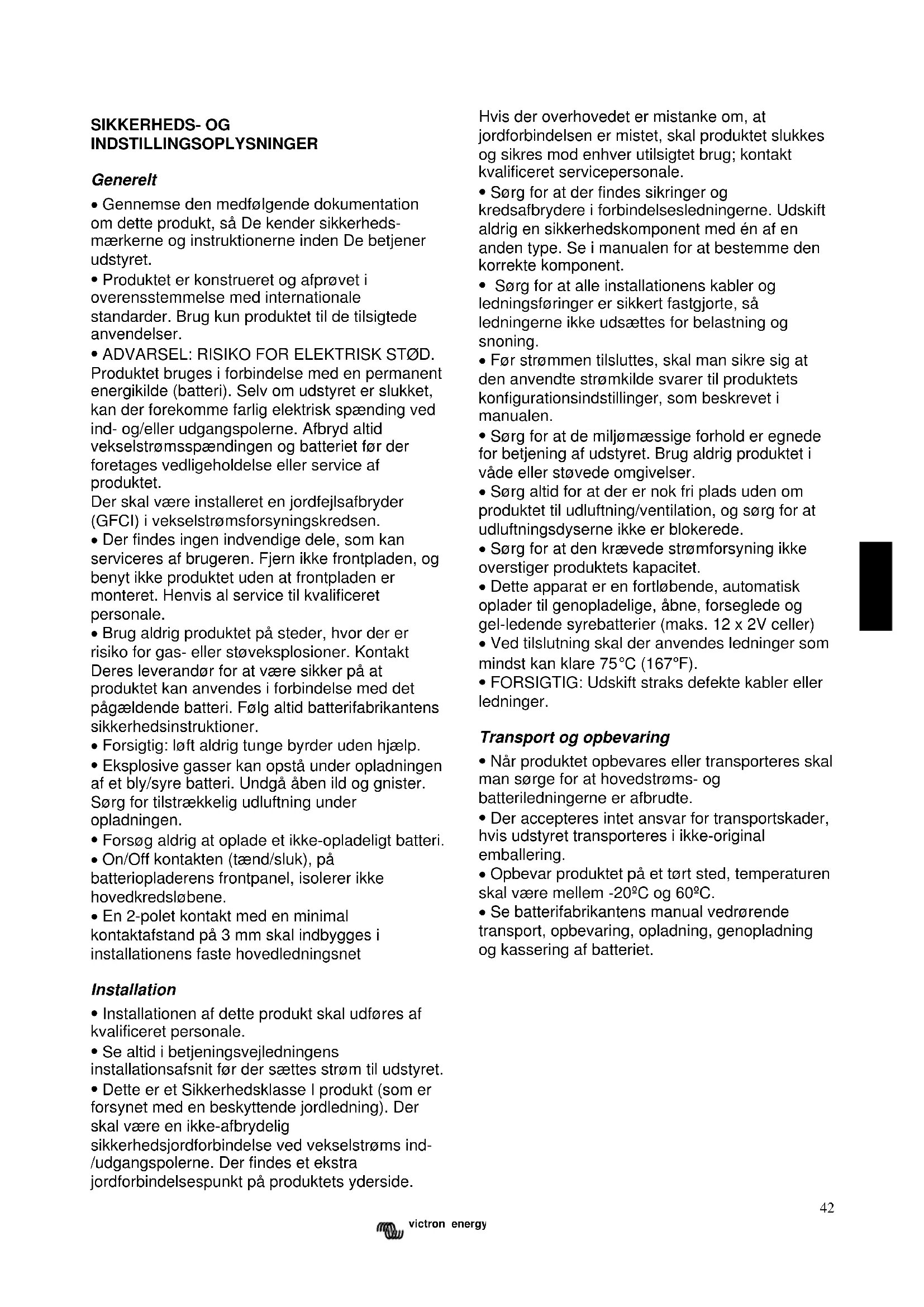 Se batterifabrikantens manual vedrørende transport, opbevaring, opladning, genopladning og kassering af batteriet.43 victron energy BESKRIVELSE Teknologi Phoenix Opladeren er en heltigennem høj- frekvens batterioplader. Inputtet bliver elektronisk korrigeret af en kraftfaktor ved første kraftniveau. Næste niveau sørger for galvanisk isolation og en perfekt jævnstrømsspænding ved udgangspolerne. Der kan garanteres et meget nøjagtigt batteri- opladningsniveau, fordi opladningsprocessen reguleres af en mikrokontroller. De indvendige elektroniske komponenter er beskyttet mod fugt og snavs ved hjælp af en særlig overfladebehandling, som sikrer en lang levetid for Deres batterioplader. Der kan oplades to høj-kapacitets batterier og et ekstra lav-kapacitets batteri med denne oplader. Tilpasset opladning Den nye Phoenix Oplader anvender tilpasset opladningskarakteristik. Tilpasset opladnings- karakteristik adskiller sig fra andre opladnings- karakteristikker på flere områder. De 3 hoved- områder er Hurtigopladning, Batterisikkerheds- modus og Alle Årstider modus. Sagt på en anden måde betyder det, at Phoenix Opladeren tilpasser sig de tilsluttede batterier. Hurtigopladning I begyndelsen af opladningscyklusen, hovedopladningsfasen, vil batterierne blive opladet med højere strøm end ved traditionelle opladningsmetoder. Hovedopladningsfasen stopper når batteriets spænding er 14,4V eller 28,8V. Herefter starter absorptionsfasen. Absorptionstidens længde bliver beregnet ud fra den målte hovedopladningstid. For at kunne gøre dette, overvåges flere af batteriets parametre af opladerens mikro-kontroller. Batterisikkerhedsmodus Men hvad nu hvis Deres batteri behøver en højere absorptionsspænding? Opladeren vil så gradvist øge den tilførte spænding til batteriet, indtil den fastsatte absorptionsspænding er nået. Denne fase kalder vi Batterisikkerheds-modus. Den beskytter Deres batteri mod ødelæggelse ved overopladning. Phoenix Opladeren er temperaturkompenseret. Opladeren vil genberegne forskellige værdier baseret på batteriets temperatur. Alle Årstider modus I perioder hvor De ikke bruger Deres batteri, og hovednettet er tilsluttet opladeren, vil Phoenix Opladeren reducere den løbende spænding. Ved at gøre dette reducerer vi gasdannelsen i batterierne, så de ikke løber tør efter længere tid uden brug. For at holde batterierne i form, vil Phoenix Opladeren øge den tilførte spænding en gang om ugen. Dette kalder vi gentaget absorption. Betjening Batteriopladeren oplader batteriet med en 4-trins tilpasset opladningskarakteristik, se specifikationerne i slutningen, vedrørende detaljer. Den kan være tilsluttet til batteriet hele tiden, uden at der dannes flere gasser på grund af overopladning. Opladeren kan anvendes til forskellige typer batterier, men standardindstillingerne er opsat til Sonnenschein A200 dryfit gel batterier. Se specifikationerne vedrørende andre for-indstillede batterityper. Ved brug i forbindelse med andre batterityper, bedes De kontakte batterifabrikanten for at få oplysninger om korrekt opladningsspænding. Hvis det er nødvendigt bør De få Phoenix Opladeren genjusteret. Den fulde opladningsstrøm for Phoenix Opladeren er delt i to hovedudgange. Der er yderligere mulighed for en udgang med begrænset kapacitet, f.eks. til opladning af et startbatteri. Opladeren er beskyttet mod kortslutning ved udgangene og for høje omgivelsestemperaturer. Temperaturføler Phoenix Opladeren bliver fra fabrikkens side leveret med en temperaturføler. Dens funktion er at måle batteriets temperatur og justere ladespændingen i overensstemmelse hermed. Det betyder at der opnås en enestående god opladning samtidig med at batteriet sikres en længere levetid. Spændingsføling Brug af spændingsfølings-forbindelsen kompenserer for spændingstab i batteriets kabler.44 GB NL F D I DK ΕΛ N P E S Specs