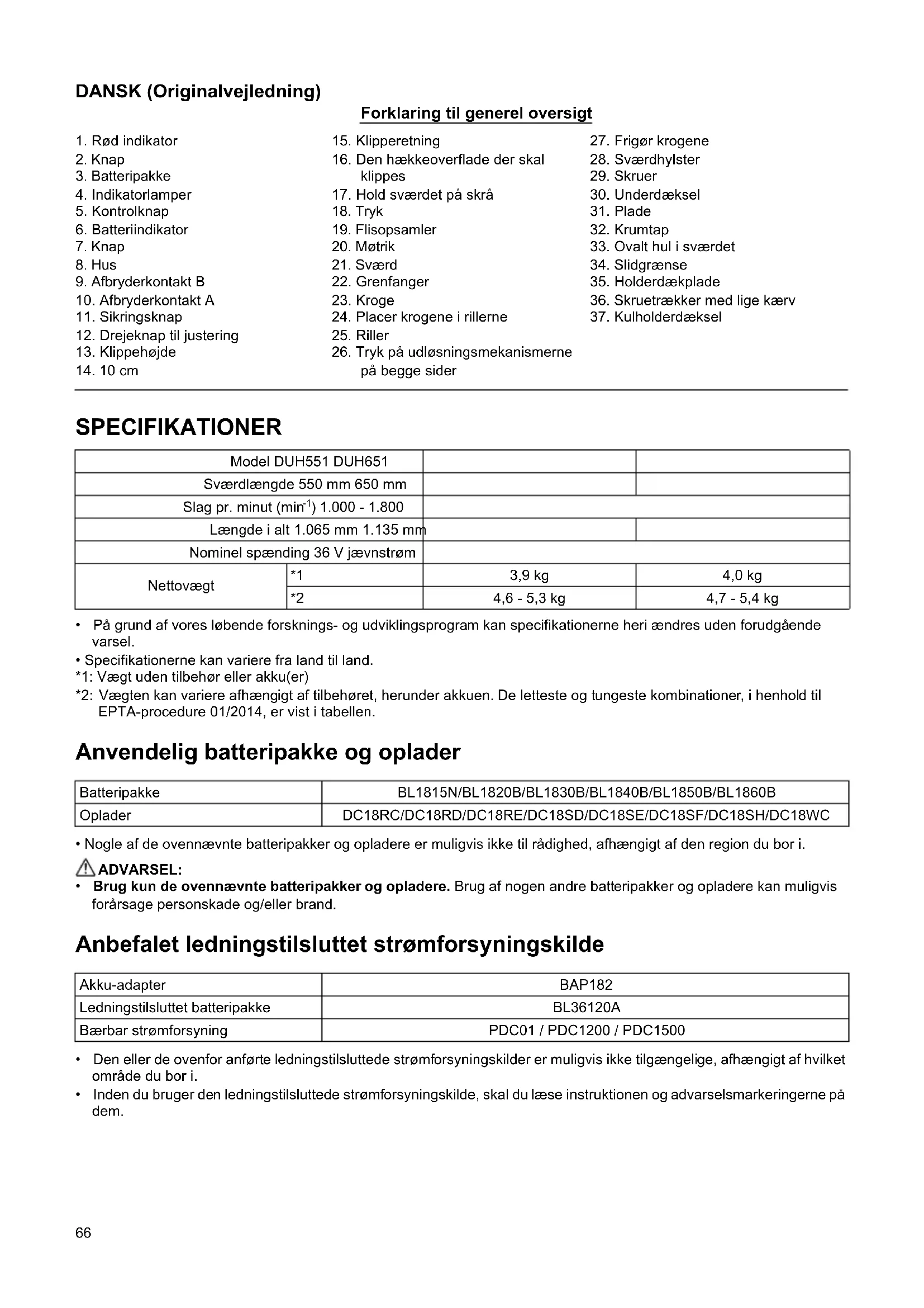 Model DUH551 DUH651 Sværdlængde 550 mm 650 mm Slag pr. minut (min