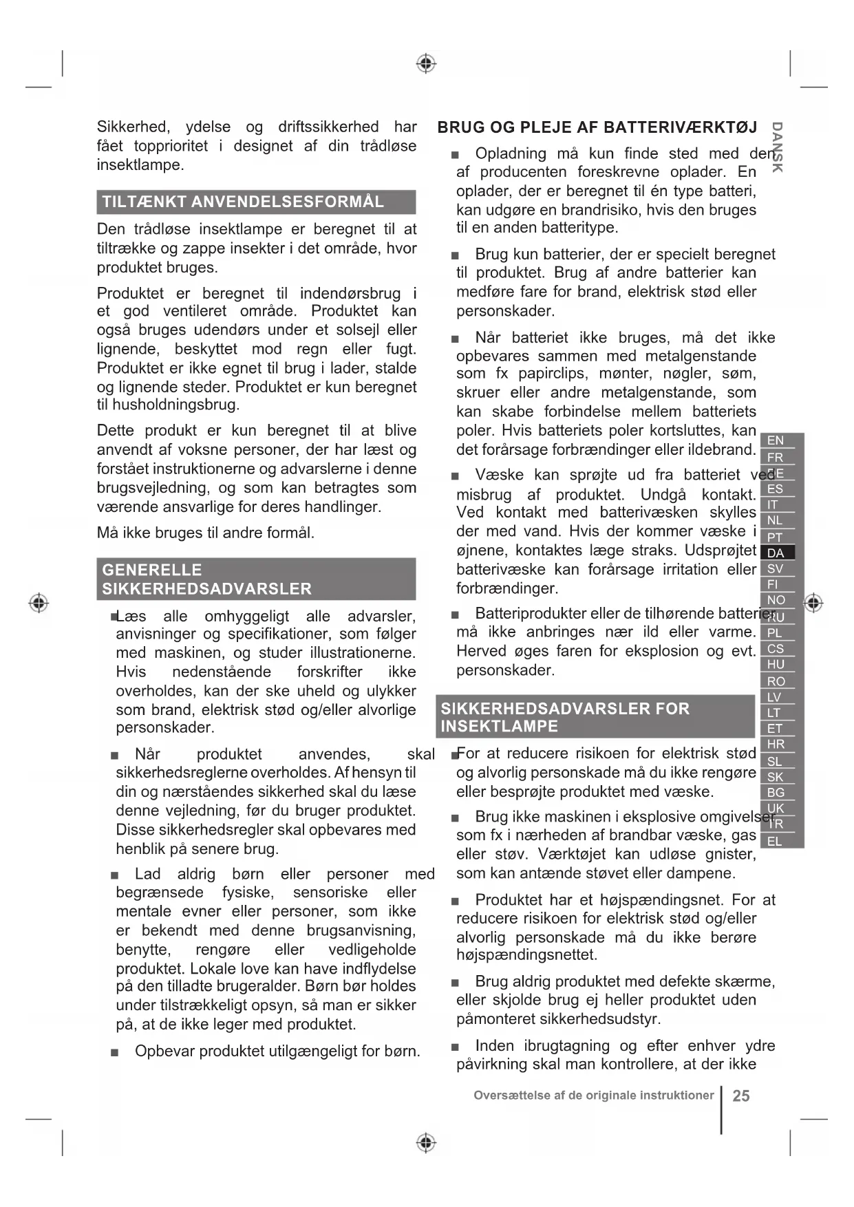 Læs alle omhyggeligt alle advarsler, anvisninger og specifikationer, som følger med maskinen, og studer illustrationerne. Hvis nedenstående forskrifter ikke overholdes, kan der ske uheld og ulykker som brand, elektrisk stød og/eller alvorlige personskader. ■ Når produktet anvendes, skal sikkerhedsreglerne overholdes. Af hensyn til din og nærståendes sikkerhed skal du læse denne vejledning, før du bruger produktet. Disse sikkerhedsregler skal opbevares med henblik på senere brug. ■ Lad aldrig børn eller personer med begrænsede fysiske, sensoriske eller mentale evner eller personer, som ikke er bekendt med denne brugsanvisning, benytte, rengøre eller vedligeholde produktet. Lokale love kan have indflydelse på den tilladte brugeralder. Børn bør holdes under tilstrækkeligt opsyn, så man er sikker på, at de ikke leger med produktet. ■ Opbevar produktet utilgængeligt for børn. BRUG OG PLEJE AF BATTERIVÆRKTØJ ■ Opladning må kun finde sted med den af producenten foreskrevne oplader. En oplader, der er beregnet til én type batteri, kan udgøre en brandrisiko, hvis den bruges til en anden batteritype. ■ Brug kun batterier, der er specielt beregnet til produktet. Brug af andre batterier kan medføre fare for brand, elektrisk stød eller personskader. ■ Når batteriet ikke bruges, må det ikke opbevares sammen med metalgenstande som fx papirclips, mønter, nøgler, søm, skruer eller andre metalgenstande, som kan skabe forbindelse mellem batteriets poler. Hvis batteriets poler kortsluttes, kan det forårsage forbrændinger eller ildebrand. ■ Væske kan sprøjte ud fra batteriet ved misbrug af produktet. Undgå kontakt. Ved kontakt med batterivæsken skylles der med vand. Hvis der kommer væske i øjnene, kontaktes læge straks. Udsprøjtet batterivæske kan forårsage irritation eller forbrændinger. ■ Batteriprodukter eller de tilhørende batterier må ikke anbringes nær ild eller varme. Herved øges faren for eksplosion og evt. personskader. SIKKERHEDSADVARSLER FOR INSEKTLAMPE