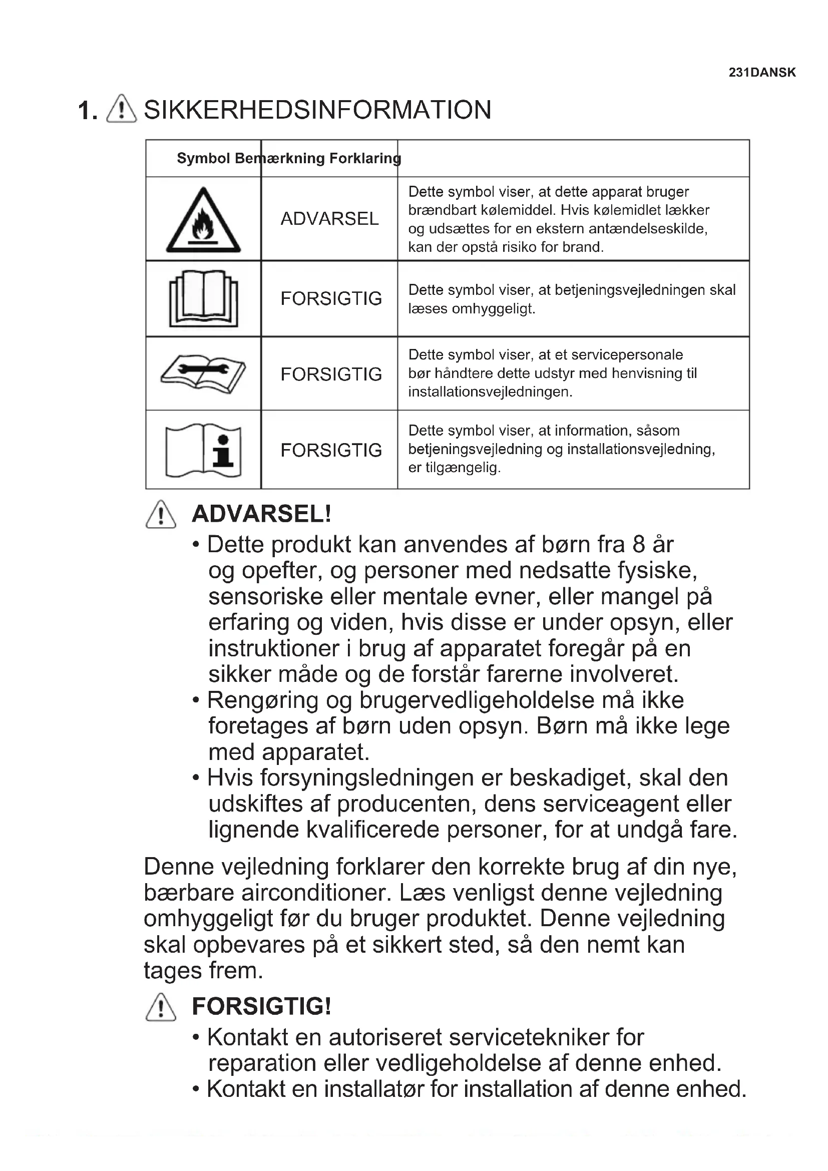 - Kontakt en installatør for installation af denne enhed. Symbol Bemærkning Forklaring ADVARSEL Dette symbol viser, at dette apparat bruger brændbart kølemiddel. Hvis kølemidlet lækker og udsættes for en ekstern antændelseskilde, kan der opstå risiko for brand. FORSIGTIG Dette symbol viser, at betjeningsvejledningen skal læses omhyggeligt. FORSIGTIG Dette symbol viser, at et servicepersonale bør håndtere dette udstyr med henvisning til installationsvejledningen. FORSIGTIG Dette symbol viser, at information, såsom betjeningsvejledning og installationsvejledning, er tilgængelig.232 www.electrolux.com FORSIGTIG! Advarsler før brug