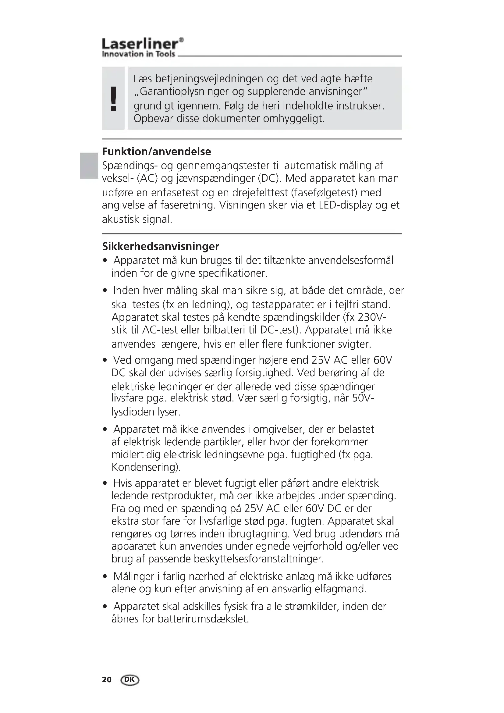 lInden hver måling skal man sikre sig, at både det område, der skal testes (fx en ledning), og testapparatet er i fejlfri stand. Apparatet skal testes på kendte spændingskilder (fx 230V- stik til AC-test eller bilbatteri til DC-test). Apparatet må ikke anvendes længere, hvis en eller flere funktioner svigter. l5DCNLF@MFLDCROMCHMFDQG¾IDQDDMC5 "DKKDQ5