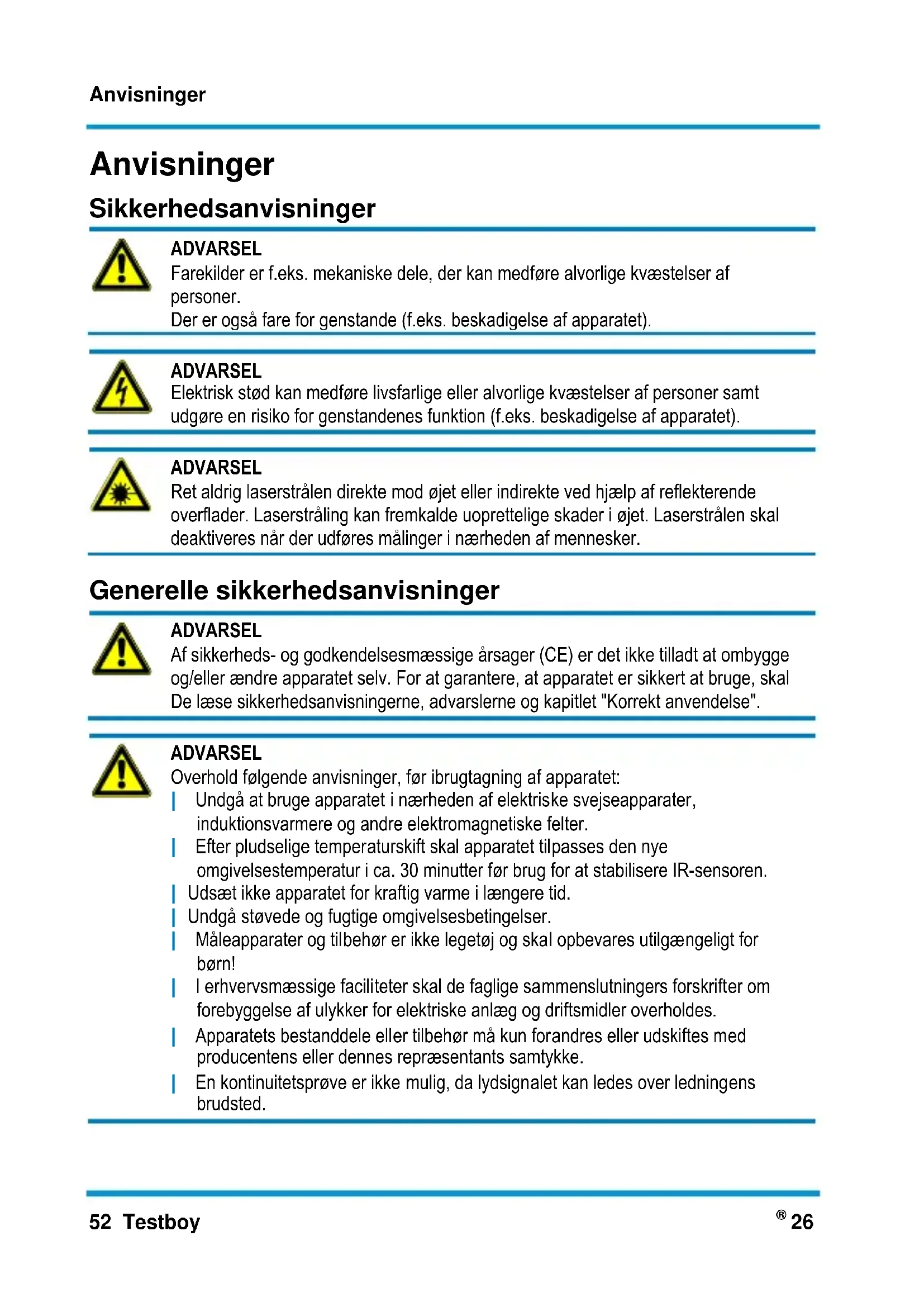 ADVARSEL Overhold følgende anvisninger, før ibrugtagning af apparatet: | Undgå at bruge apparatet i nærheden af elektriske svejseapparater, induktionsvarmere og andre elektromagnetiske felter. | Efter pludselige temperaturskift skal apparatet tilpasses den nye omgivelsestemperatur i ca. 30 minutter før brug for at stabilisere IR-sensoren. | Udsæt ikke apparatet for kraftig varme i længere tid. | Undgå støvede og fugtige omgivelsesbetingelser. | Måleapparater og tilbehør er ikke legetøj og skal opbevares utilgængeligt for børn! | I erhvervsmæssige faciliteter skal de faglige sammenslutningers forskrifter om forebyggelse af ulykker for elektriske anlæg og driftsmidler overholdes. | Apparatets bestanddele eller tilbehør må kun forandres eller udskiftes med producentens eller dennes repræsentants samtykke. | En kontinuitetsprøve er ikke mulig, da lydsignalet kan ledes over ledningens brudsted.Anvisninger Testboy