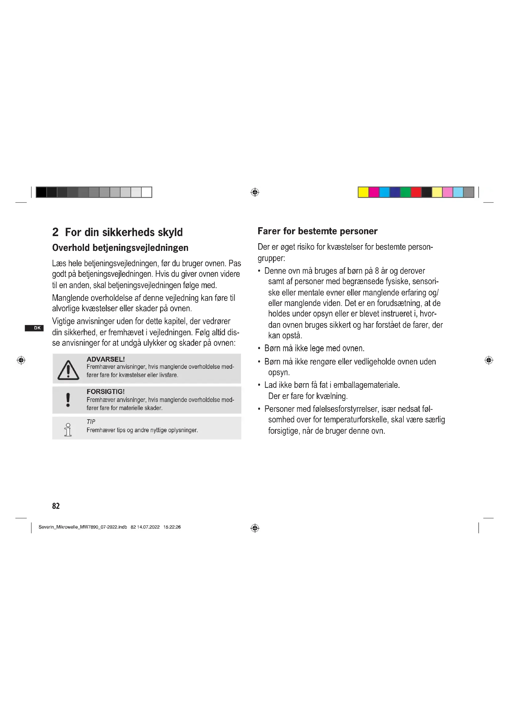 9 Opbevaring og bortskaffelse ................................... 92 Severin_Mikrowelle_MW7890_07-2022.indb 81 14.07.2022 15:22:2682 DK DK 2 For din sikkerheds skyld Overhold betjeningsvejledningen Læs hele betjeningsvejledningen, før du bruger ovnen. Pas godt på betjeningsvejledningen. Hvis du giver ovnen videre til en anden, skal betjeningsvejledningen følge med. Manglende overholdelse af denne vejledning kan føre til alvorlige kvæstelser eller skader på ovnen. Vigtige anvisninger uden for dette kapitel, der vedrører din sikkerhed, er fremhævet i vejledningen. Følg altid dis- se anvisninger for at undgå ulykker og skader på ovnen: ADVARSEL! Fremhæver anvisninger, hvis manglende overholdelse med- fører fare for kvæstelser eller livsfare. FORSIGTIG! Fremhæver anvisninger, hvis manglende overholdelse med- fører fare for materielle skader. TIP Fremhæver tips og andre nyttige oplysninger. Farer for bestemte personer Der er øget risiko for kvæstelser for bestemte person- grupper: