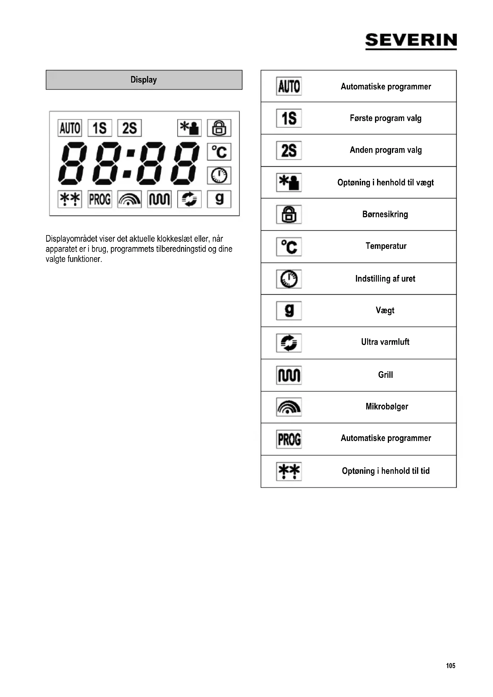 DK104 142 x 208 mm Kontrolpanelets funktioner Knap Funktion Kvik-start og Børnesikring Favorit retter & ur Pizza program / Tastelyd Mikrobølger Grill Ultra varmluft Afbryd / Stop Drejeknap Funktion Tryk Start Drej Tidsindstilling &Automatisk tilberedningsprogram105 142 x 208 mm Display Displayområdet viser det aktuelle klokkeslæt eller, når apparatet er i brug, programmets tilberedningstid og dine valgte funktioner. Automatiske programmer Første program valg Anden program valg Optøning i henhold til vægt Børnesikring Temperatur Indstilling af uret Vægt Ultra varmluft Grill Mikrobølger Automatiske programmer Optøning i henhold til tid106 142 x 208 mm Sikkerhedsforskrifter Vigtige sikkerhedsforskrifter Læs venligst brugsanvisningen omhyggeligt igennem og gem den til senere reference Tilslutning til lysnettet Mikrobølgeovnen bør kun tilsluttes til et stik med jordforbindelse, der er installeret i overensstemmelse med el-regulativet. Spændingen på typeskiltet skal svare til spændingen i el-installationen. Dette produkt overholder direktiverne, som gælder for CE-mærkning. Placering af mikrobølgeovnen ∙ Placer altid mikrobølgeovnen på en stabil, plan og varmefast overade og sørg for at den ikke udsættes for andre varmekilder eller meget høj fugtighed. ∙ Benyt ikke apparatet udendørs. ∙ Fødderne under ovnen må ikke fjernes. Ligeledes må du ikke fjerne nogen afstandsholdere, hvis de er installeret. ∙ Der skal altid være tilstrækkelig ventilation. Placer ikke andre ting ovenpå mikrobølgeovnen, og sørg for at overholde følgende minimumsafstande mellem ovn og vægge eller andre genstande: Siderne: 7,5 cm Bagpå: 7,5 cm Top: 30,0 cm Apparatet må ikke installeres inde i et skab; når mikrobølgeovnen skal placeres bør man også sikre sig at den ikke står tæt op under et skab eller noget tilsvarende. Vigtige noter ∙ Advarsel: Nogle typer af fødevarer er letantændelige. Lad aldrig under nogen omstændigheder ovnen være uden opsyn, når mikrobølge - , grill - , varmluft – eller kombinationsfunktionerne er i brug. ∙ Denne mikrobølgeovn er kun beregnet til optøning, opvarmning eller tilberedning af mad. Advarsel: Forsøg aldrig på at tørre mad eller tøj, eller på at opvarme varmepuder, hjemmesko, svampe, våde rengøringsklude el. lign., da dette kan forårsage tilskadekomst, brandsår eller brand. ∙ Ansvar accepteres ikke, hvis ødelæggelse skyldes ukorrekt brug, eller hvis denne brugsanvisning ikke er fulgt. ∙ Benyt kun køkkenudstyr som er egnet til brug i mikrobølgeovne. Brug aldrig metalbeholdere ved opvarmning af mad eller drikkevarer ved hjælp af107 142 x 208 mm mikrobølgefunktionen. For detaljeret information, se venligst afsnittet ’Benyt altid velegnede køkkenredskaber’. ∙ Apparatet er ikke beregnet til brug ved hjælp af en ekstern timer eller et separat fjernstyringssystem. ∙ Dette apparat kan benyttes af børn (som er mindst 8 år) og af personer med reducerede fysiske, sensoriske eller mentale evner, eller mangel på erfaring eller viden, såfremt de har fået vejledning og instruktion i brugen af dette apparat og fuldt ud forstår alle farer og forholdsregler vedrørende sikkerheden som brug af apparatet medfører. ∙ Børn må aldrig få lov til at lege med apparatet. ∙ Børn må aldrig få lov til at udføre rengørings- eller vedligeholdelsesarbejde på dette apparat, medmindre de er under opsyn og mindst 8 år gamle. ∙ Apparatet og dets ledning må altid holdes væk fra børn som er yngre en 8 år. ∙ For at undgå elektrisk stød bør apparatet ikke rengøres med vand og heller ikke nedsænkes i vand. ∙ Advarsel: Som følge af de høje temperaturer der opstår ved brug af grill- og/eller varmluftsfunktionerne, må børn ikke benytte apparatet medmindre de er under nøje opsyn af en voksen. ∙ Når kombinationsfunktionerne eller grill- og/eller varmluftsfunktionerne benyttes, skal man være ekstra påpasselig med ikke at berøre de indvendige varmeelementer. ∙ Brug heller aldrig dampapparater til rengøringen. ∙ Sluk altid apparatet og tag stikket ud af stikkontakten: - inden rengøring, - tilfælde af fejlfunktion. - efter brug. ∙ Træk aldrig i selve ledningen, når ledningen tages ud af stikkontakten; tag altid fat i selve stikket.