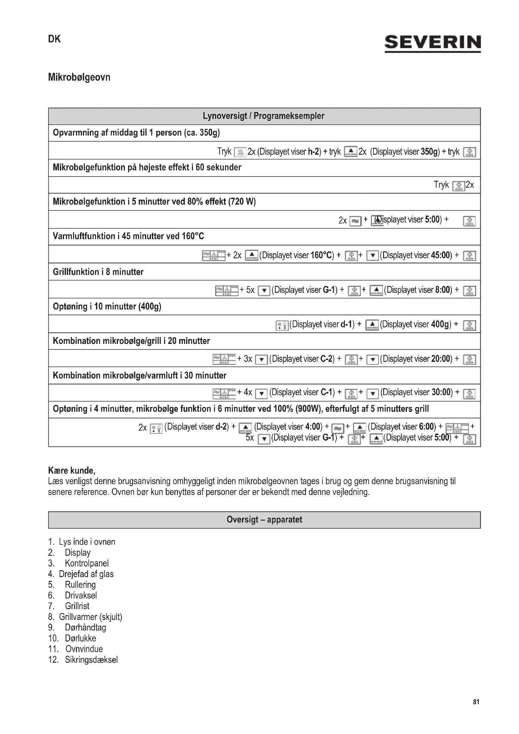 (Displayet viser d-2) + (Displayet viser 4:00) + + (Displayet viser 6:00) + + 5x (Displayet viser G-1) + + (Displayet viser 5:00) + Kære kunde, Læs venligst denne brugsanvisning omhyggeligt inden mikrobølgeovnen tages i brug og gem denne brugsanvisning til senere reference. Ovnen bør kun benyttes af personer der er bekendt med denne vejledning. Oversigt – apparatet