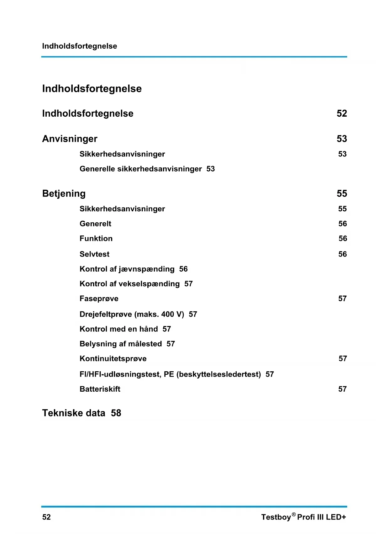 Profi III LED+ Indholdsfortegnelse Indholdsfortegnelse 52 Anvisninger 53 Sikkerhedsanvisninger 53 Generelle sikkerhedsanvisninger 53 Betjening 55 Sikkerhedsanvisninger 55 Generelt 56 Funktion 56 Selvtest 56 Kontrol af jævnspænding 56 Kontrol af vekselspænding 57 Faseprøve 57 Drejefeltprøve (maks. 400 V) 57 Kontrol med en hånd 57 Belysning af målested 57 Kontinuitetsprøve 57 FI/HFI-udløsningstest, PE (beskyttelsesledertest) 57 Batteriskift 57 Tekniske data 58Anvisninger Testboy