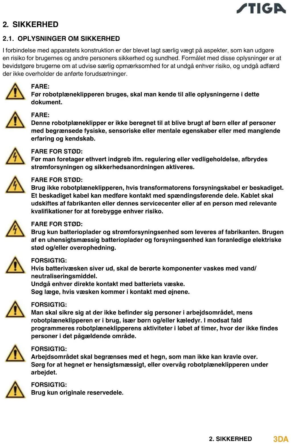 I forbindelse med apparatets konstruktion er der blevet lagt særlig vægt på aspekter, som kan udgøre en risiko for brugernes og andre personers sikkerhed og sundhed. Formålet med disse oplysninger er at bevidstgøre brugerne om at udvise særlig opmærksomhed for at undgå enhver risiko, og undgå adfærd der ikke overholder de anførte forudsætninger. FARE: Før robotplæneklipperen bruges, skal man kende til alle oplysningerne i dette dokument. FARE: Denne robotplæneklipper er ikke beregnet til at blive brugt af børn eller af personer med begrænsede fysiske, sensoriske eller mentale egenskaber eller med manglende erfaring og kendskab. FARE FOR STØD: Før man foretager ethvert indgreb ifm. regulering eller vedligeholdelse, afbrydes strømforsyningen og sikkerhedsanordningen aktiveres. FARE FOR STØD: Brug ikke robotplæneklipperen, hvis transformatorens forsyningskabel er beskadiget. Et beskadiget kabel kan medføre kontakt med spændingsførende dele. Kablet skal udskiftes af fabrikanten eller dennes servicecenter eller af en person med relevante kvalikationerforatforebyggeenhverrisiko. FARE FOR STØD: Brug kun batterioplader og strømforsyningsenhed som leveres af fabrikanten. Brugen af en uhensigtsmæssig batterioplader og forsyningsenhed kan foranledige elektriske stødog/elleroverophedning. FORSIGTIG: Hvisbatterivæskensiverud,skaldeberørtekomponentervaskesmedvand/ neutraliseringsmiddel. Undgå enhver direkte kontakt med batteriets væske. Søg læge, hvis væsken kommer i kontakt med øjnene. FORSIGTIG: Manskalsikresigatderikkebendersigpersoneriarbejdsområdet,mens robotplæneklippereneribrug,isærbørnog/ellerkæledyr.Imodsatfald programmeresrobotplæneklipperensaktiviteteriløbetaftimer,hvorderikkendes personer i det pågældende område. FORSIGTIG: Arbejdsområdet skal begrænses med et hegn, som man ikke kan kravle over. Sørg for at hegnet er hensigtsmæssigt, eller overvåg robotplæneklipperen under arbejdet. FORSIGTIG: Brug kun originale reservedele.4 DA