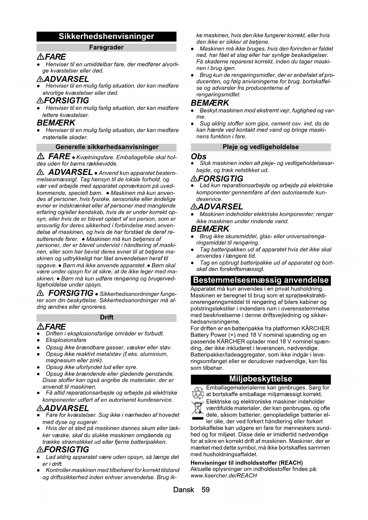 - Tekniske data Dansk 59 Sikkerhedshenvisninger Faregrader FARE ● Henviser til en umiddelbar fare, der medfører alvorli- ge kvæstelser eller død. 몇 ADVARSEL ● Henviser til en mulig farlig situation, der kan medføre alvorlige kvæstelser eller død. 몇 FORSIGTIG ● Henviser til en mulig farlig situation, der kan medføre lettere kvæstelser. BEMÆRK ● Henviser til en mulig farlig situation, der kan medføre materielle skader. Generelle sikkerhedsanvisninger FARE ● Kvælningsfare. Emballagefolie skal hol- des uden for børns rækkevidde. 몇 ADVARSEL ● Anvend kun apparatet bestem- melsesmæssigt. Tag hensyn til de lokale forhold, og vær ved arbejde med apparatet opmærksom på uved- kommende, specielt børn. ● Maskinen må kun anven- des af personer, hvis fysiske, sensoriske eller åndelige evner er indskrænket eller af personer med manglende erfaring og/eller kendskab, hvis de er under korrekt op- syn, eller hvis de er blevet oplært af en person, som er ansvarlig for deres sikkerhed i forbindelse med anven- delse af maskinen, og hvis de har forstået de deraf re- sulterende farer. ● Maskinen må kun betjenes af personer, der er blevet undervist i håndtering af maski- nen, eller som har bevist deres evner til at betjene ma- skinen og udtrykkeligt har fået anvendelsen heraf til opgave. ● Børn må ikke anvende apparatet. ● Børn skal være under opsyn for at sikre, at de ikke leger med ma- skinen. ● Børn må kun udføre rengøring og brugerved- ligeholdelse under opsyn. 몇 FORSIGTIG ● Sikkerhedsanordninger funge- rer som din beskyttelse. Sikkerhedsanordninger må al- drig ændres eller ignoreres. Drift FARE ● Driften i eksplosionsfarlige områder er forbudt. ● Eksplosionsfare ● Opsug ikke brændbare gasser, væsker eller støv. ● Opsug ikke reaktivt metalstøv (f.eks. aluminium, magnesium eller zink). ● Opsug ikke ufortyndet lud eller syre. ● Opsug ikke brændende eller glødende genstande. Disse stoffer kan også angribe de materialer, der er anvendt til maskinen. ● Få altid reparationsarbejde og arbejde på elektriske komponenter udført af en autoriseret kundeservice. 몇 ADVARSEL ● Fare for kvæstelser. Sug ikke i nærheden af hovedet med dyse og sugerør. ● Hvis der et sted på maskinen dannes skum eller læk- ker væske, skal du slukke maskinen omgående og trække strømstikket ud eller fjerne batteripakken. 몇 FORSIGTIG ● Lad aldrig apparatet være uden opsyn, så længe det er i drift. ● Kontroller maskinen med tilbehøret for korrekt tilstand og driftssikkerhed inden enhver anvendelse. Brug ik- ke maskinen, hvis den ikke fungerer korrekt, eller hvis den ikke er sikker at betjene. ● Maskinen må ikke bruges, hvis den forinden er faldet ned, har fået et slag eller har synlige beskadigelser. Få skaderne repareret korrekt, inden du tager maski- nen i brug igen. ● Brug kun de rengøringsmidler, der er anbefalet af pro- ducenten, og følg anvisningerne for brug, bortskaffel- se og advarsler fra producenterne af rengøringsmidlet. BEMÆRK ● Beskyt maskinen mod ekstremt vejr, fugtighed og var- me. ● Sug aldrig stoffer som gips, cement osv. ind, da de kan hærde ved kontakt med vand og bringe maski- nens funktion i fare. Pleje og vedligeholdelse Obs ● Sluk maskinen inden alt pleje- og vedligeholdelsesar- bejde, og træk netstikket ud. 몇 FORSIGTIG ● Lad kun reparationsarbejde og arbejde på elektriske komponenter gennemføre af den autoriserede kun- deservice. 몇 ADVARSEL ● Maskinen indeholder elektriske komponenter; rengør ikke maskinen under rindende vand. BEMÆRK ● Brug ikke skuremiddel, glas- eller universalrengø- ringsmiddel til rengøring. ● Tag batteripakken ud af apparatet hvis det ikke skal anvendes i længere tid. ● Tag en opbrugt batteripakke ud af apparatet og bort- skaf den forskriftsmæssigt. Bestemmelsesmæssig anvendelse Apparatet må kun anvendes i en privat husholdning. Maskinen er beregnet til brug som et sprøjteekstrakti- onsrengøringsmiddel til rengøring af bilers kabiner og polstringstekstiler i indendørs rum i overensstemmelse med beskrivelserne i denne driftsvejledning og sikker- hedsanvisningerne. For driften er en batteripakke fra platformen KÄRCHER Battery Power (+) med 18 V nominel spænding og en passende KÄRCHER oplader med 18 V nominel spæn- ding, der ikke inkluderet i leverancen, nødvendige. Batteripakker/ladeaggregater, som ikke indgår i leve- ringsomfanget eller er derudover nødvendige, kan fås som tilbehør. Miljøbeskyttelse Emballagematerialerne kan genbruges. Sørg for at bortskaffe emballage miljømæssigt korrekt. Elektriske og elektroniske maskiner indeholder værdifulde materialer, der kan genbruges, og ofte dele, såsom batterier, genopladelige batterier el- ler olie, der ved forkert håndtering eller forkert bortskaffelse kan udgøre en fare for menneskers sund- hed og for miljøet. Disse dele er imidlertid nødvendige for at sikre en korrekt drift af maskinen. Maskiner, der er mærket med dette symbol, må ikke bortskaffes sammen med husholdningsaffaldet. Henvisninger til indholdsstoffer (REACH) Aktuelle oplysninger om indholdsstoffer findes på: www.kaercher.de/REACH60 Dansk Kundeservice Vores KÄRCHER-filial hjælper dig gerne videre i tilfæl- de af spørgsmål eller fejl. Tilbehør og reservedele Anvend kun originaltilbehør og -reservedele. De er en garanti for en sikker og fejlfri drift af maskinen. Informationer om tilbehør og reservedele findes på www.kaercher.com. Leveringsomfang Maskinens leveringsomfang er vist på emballagen. Kontroller ved udpakningen, om indholdet er komplet. Kontakt venligst forhandleren, hvis der mangler tilbehør eller ved transportskader. Garanti I det enkelte lande gælder de garantibetingelser, der er fastsat af vore salgsselskab. Eventuelle fejl ved maski- nen udbedres gratis inden for garantien, såfremt fejlen kan tilskrives en materiale- eller produktionsfejl. Hvis du ønsker at gøre garantien gældende, b