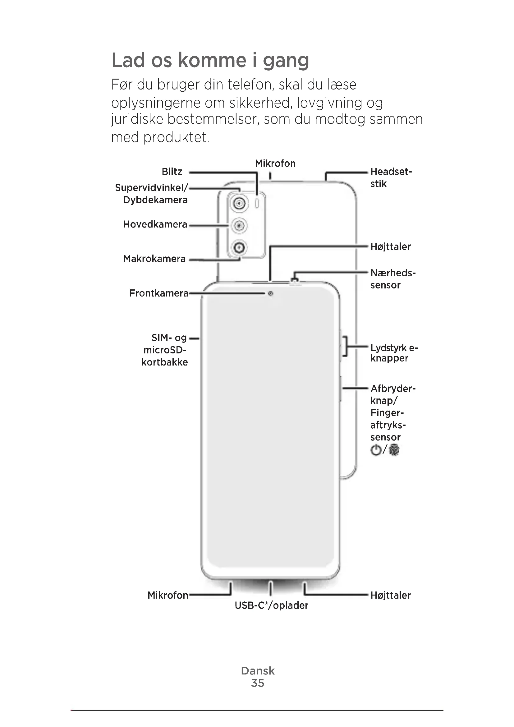Mikrofon Højttaler Dansk36 Indsæt kortene og tænd Nano-SIM 1 Indsæt SIM-værktøjet i hullet ved siden af bakken for at trække den ud. Sørg for, at du bruger den korrekte størrelse SIM-kort, og klip ikke i SIM-kortet. SIM SIM1 SIM2 Model med ét SIM-kort Model med to SIM-kort 2 Indsæt SIM-kortet/ -kortene med guldkontakterne vendende nedad, og skub forsigtigt bakken ind i åbningen. Tilføj et microSD- kort (valgfrit, sælges separat) for at få ekstra lagerplads. 3 Tryk på afbryderknappen, og hold den nede, og følg anvisningerne for at komme i gang.37 Hjælp og mere Få svar, opdateringer og oplysninger: