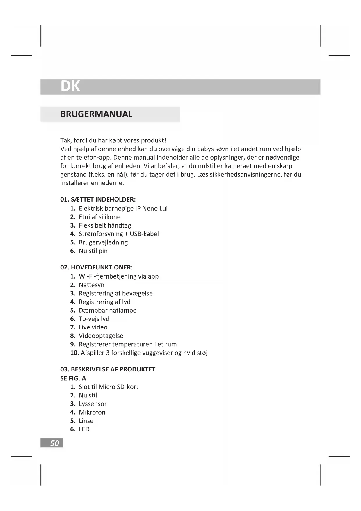BRUGERMANUAL Tak, fordi du har købt vores produkt! Ved hjælp af denne enhed kan du overvåge din babys søvn i et andet rum ved hjælp af en telefon-app. Denne manual indeholder alle de oplysninger, der er nødvendige for korrekt brug af enheden. Vi anbefaler, at du nulsller kameraet med en skarp genstand (f.eks. en nål), før du tager det i brug. Læs sikkerhedsanvisningerne, før du installerer enhederne.