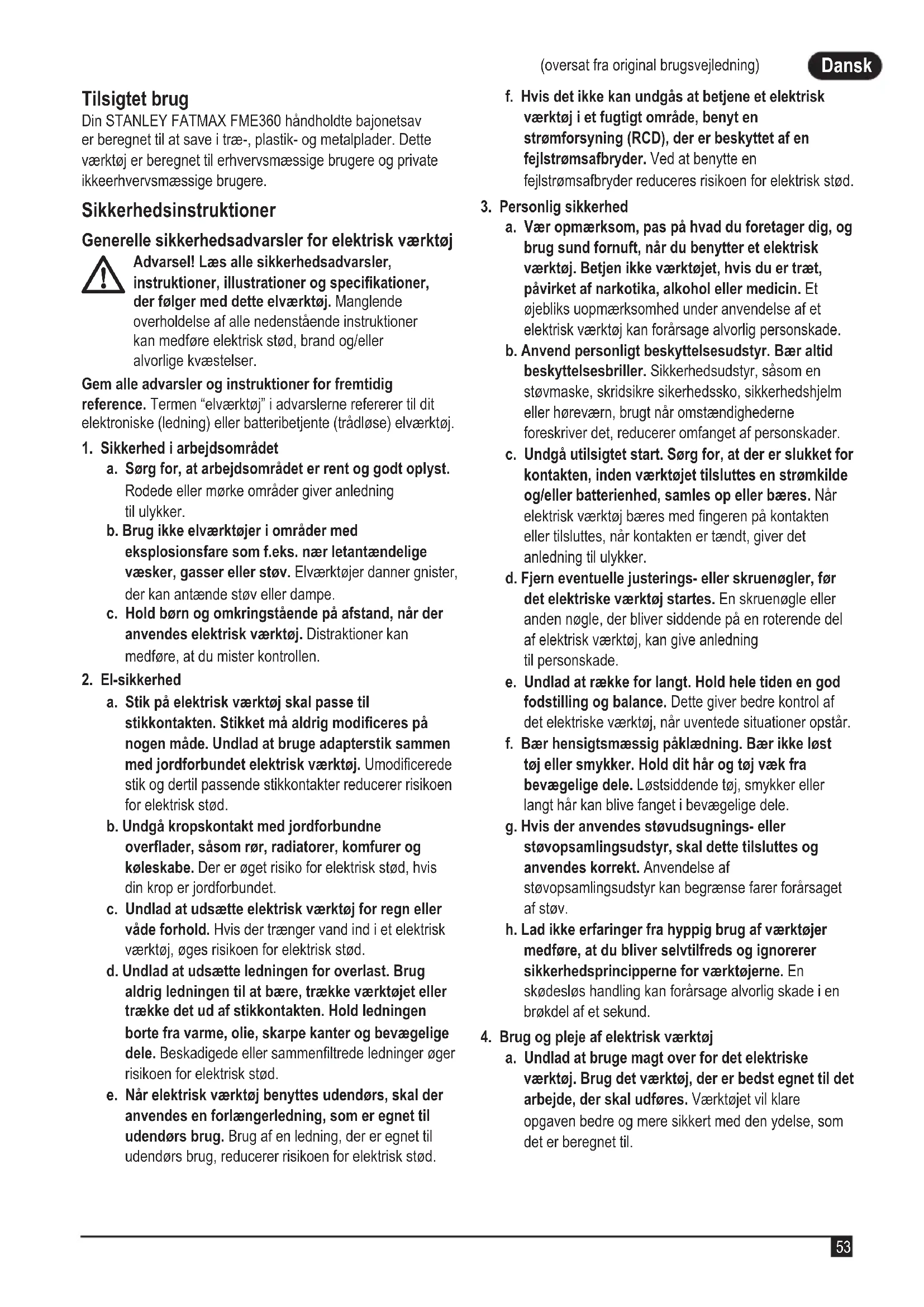 (oversat fra original brugsvejledning) Dansk (oversat fra original brugsvejledning) Tilsigtet brug Din STANLEY FATMAX FME360 håndholdte bajonetsav er beregnet til at save i træ-, plastik- og metalplader. Dette værktøj er beregnet til erhvervsmæssige brugere og private ikkeerhvervsmæssige brugere. Sikkerhedsinstruktioner Generelle sikkerhedsadvarsler for elektrisk værktøj