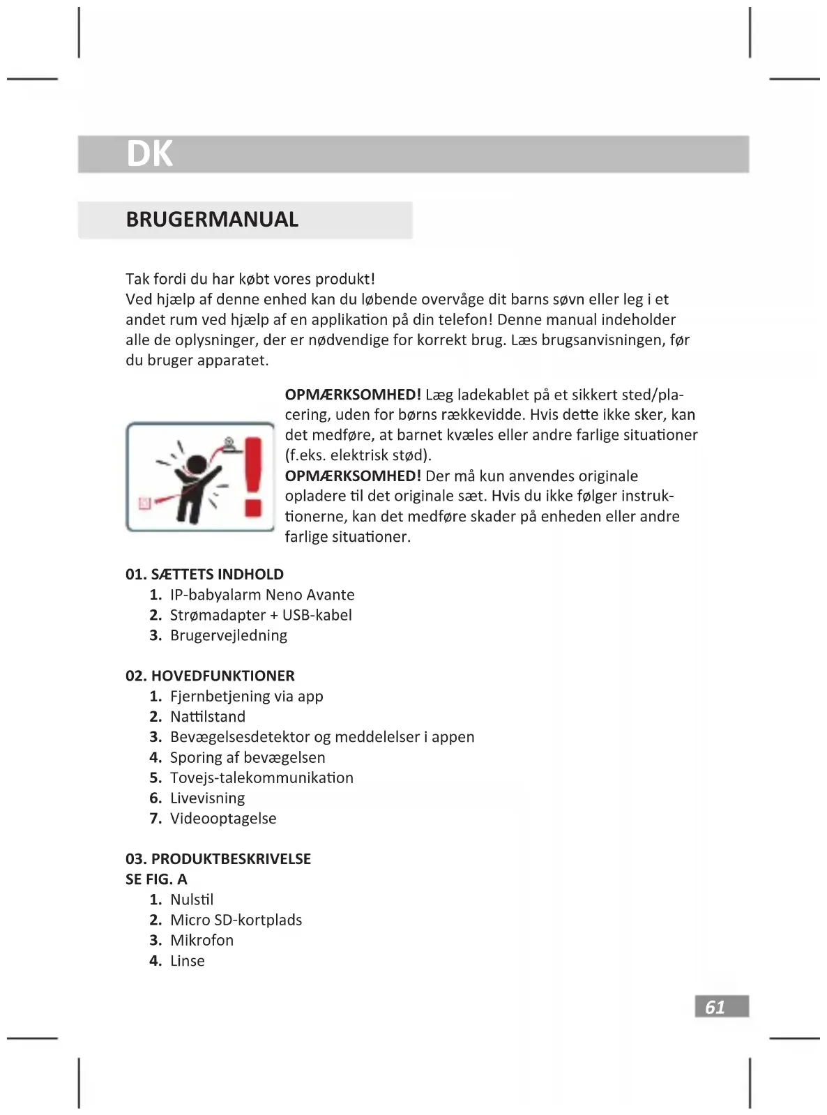 BRUGERMANUAL Tak fordi du har købt vores produkt! Ved hjælp af denne enhed kan du løbende overvåge dit barns søvn eller leg i et andet rum ved hjælp af en applikaon på din telefon! Denne manual indeholder alle de oplysninger, der er nødvendige for korrekt brug. Læs brugsanvisningen, før du bruger apparatet.