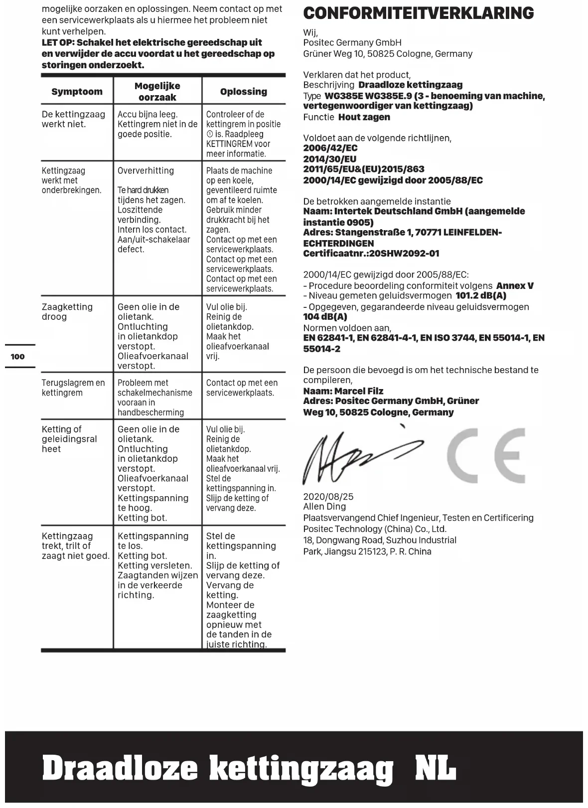 trække kæden med hånden indtil den usmurte bagside af tandhjulet er på linje med smørehullet. Gentag denne procedure for smøring. TIL BATTERIREDSKABER Værktøj og batteri bør kun anvendes og opbevares i omgivelsestemperaturområdet 0C- 45C. Det anbefalede omgivelsestemperaturområde for opladningssystemet under opladningen er 0C-40C. MILJØBESKYTTELSE Affald af elektriske produkter må ikke bortskaffes sammen med husholdningsaffald. Indlever så vidt muligt produktet til genbrug. Kontakt de lokale myndigheder eller forhandleren, hvis du er i tvivl. FEJLFINDING Efterfølgende tabel indeholder fejlsymptomer, den mulige årsag samt den korrekte afhjælpning, hvis el-værktøjet ikke fungerer som det skal. Hvis du ikke kan finde/løse problemet hermed, bedes du kontakte serviceforhandleren. ADVARSEL: Sluk for værktøjet og tag batteriet ud, før du begynder at lede efter fejlen.112 Batteridreven motorsav DK Symptom Mulig årsag Afhjælpning Kædesaven fungerer ikke. Lav batterispænding. Kædebremse ikke I korrekt position. Udskift begge batterier Kontrollér om kædebremsen er I position . Se KÆDEBREMSE, for yderligere detaljer. Kædesaven tænder og slukker hele tiden. Overopvarmning Der presses meget under skæring. Ekstern løs forbindelse. Intern løs forbindelse. Start-stop-kontakten er defekt. Anbring maskinen på et køligt, ventileret sted for at afkøle den. Pres relativt mindre under skæring. Kontakt et autoriseret værksted. Kontakt et autoriseret værksted. Kontakt et autoriseret værksted. Savekæden er tør. Olietanken er tom. Ventilationsåbningen i olietankdækslet er tilstoppet. Olieudløbskanalen er tilstoppet. Fyld tanken op med olie. Rengør olietankdækslet. Rens olieudløbskanalen. Tilbageslags- bremse/ udløbsb- remse Problemer med koblingsmekanismen. Kontakt et auto- riseret værksted. Kæden/ styreskin- nen er varm. Olietanken er tom. Ventilationsåbningen i olietankdækslet er tilstoppet. Olieudløbskanalen er tilstoppet. Kædespændingen er for høj. Kæden er uskarp. Fyld tanken op med olie. Rengør olietankdæk- slet. Rens olieudløbska- nalen. Indstil kædespændin- gen. Slib eller udskift kæden. Kædesaven hopper, vibrerer eller saver ikke rigtigt. Kædespændingen er for løs. Kæden er uskarp. Kæden er slidt. Savetænderne peger i den forkerte retning.