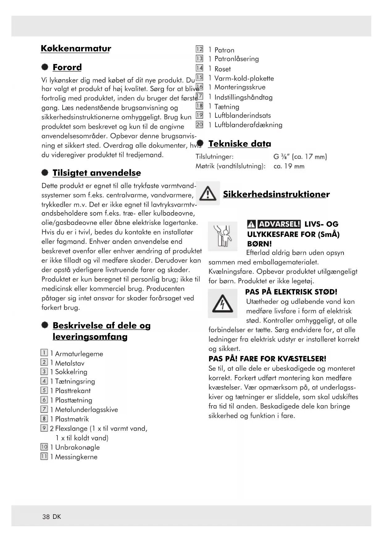 Efterlad aldrig børn uden opsyn sammen med emballagematerialet. Kvælningsfare. Opbevar produktet utilgængeligt for børn. Produktet er ikke legetøj.GIV AGT! FARE FOR MATERIELLE SKADER! Få monteringen udført af fagfolk. Utætheder og udløbende vand kan medføre betydelige materielle skader på bygning eller husholdningsartikler. Kontroller i den forbindelse omhyggeligt, at alle forbindelser er tætte. Sørg for, at alle tætninger sidder ordentligt for at forhindre udløbende vand gennem utætheder. Drej tuden i den ønskede position. Sørg for, at tuden peger mod vasken. Ellers kan udløbende vand forårsage betragtelige vandskader på bygningen. PAS PÅ! SKOLDNINGSFARE! Når du indstiller varmt vand, skal du sørge for, at vandets temperatur ikke er for høj. Inden installationen skal du gøre dig fortrolig med alle lokale forhold, f.eks. vandtilslutning og afspærringsanordning. Gennemlæs omhyggeligt denne betjeningsvejle- dning før montering og brug. Gem alle sikkerh- edsinstrukser og brugsanvisninger til fremtidig brug! Montering Installation af armaturet Luk for hovedvandtilførslen for at forhindre, at der løber vand ud pga. utætheder. Lad det resterende ledningsvand løbe af. Installer armaturet som vist i fig. A‒E. PAS PÅ! Flexslangerne må ikke bøjes eller sættes under spænding. Ellers er der fare for materielle skader. Betjening Ibrugtagning Bemærk: Hvis armaturet ikke har været brugt i lang tid, skal du først skylle ledningerne grundigt for at opløse drikkevandsstagnation og rester. Åbn for hovedvandtilførslen. Løft indstillingshåndtaget 17, og drej det til højre eller venstre for at regulere vandstrømningens styrke eller temperatur. Vedligeholdelse og rengøring Vær opmærksom på, at sanitære armaturer kræver særlige pleje. Derfor skal følgende instruktioner følges: Brug ikke ætsende eller alkoholbaserede rengø- ringsmidler, da disse kan beskadige produktet. Rengør kun armaturerne med rent vand, milde rengøringsmidler og en blød klud eller skind. Skru tætningen 18, luftblanderindsatsen 19 og luftblanderafdækningen af med jævne melle- mrum, og fjern kalkrester eller fremmedlegemer. Hvis plejeinstruktionerne ikke overholdes, må man påregne skader på overfladen. Garantikrav kan da ikke gøres gældende. Vandsparefunktion Patronen 12 i dette armatur har en økofunktion. Denne reducerer gennemstrømningshastigheden i vandhanen (se fig. H). Løft indstillingshåndtaget, 17 til du mærker en svag modstand. I denne indstilling begrænses vandstrømningen. Hvis du ønsker at øge vandstrømningen, løft indstillingshåndtaget 17 yderligere, indtil du har overvundet modstanden.