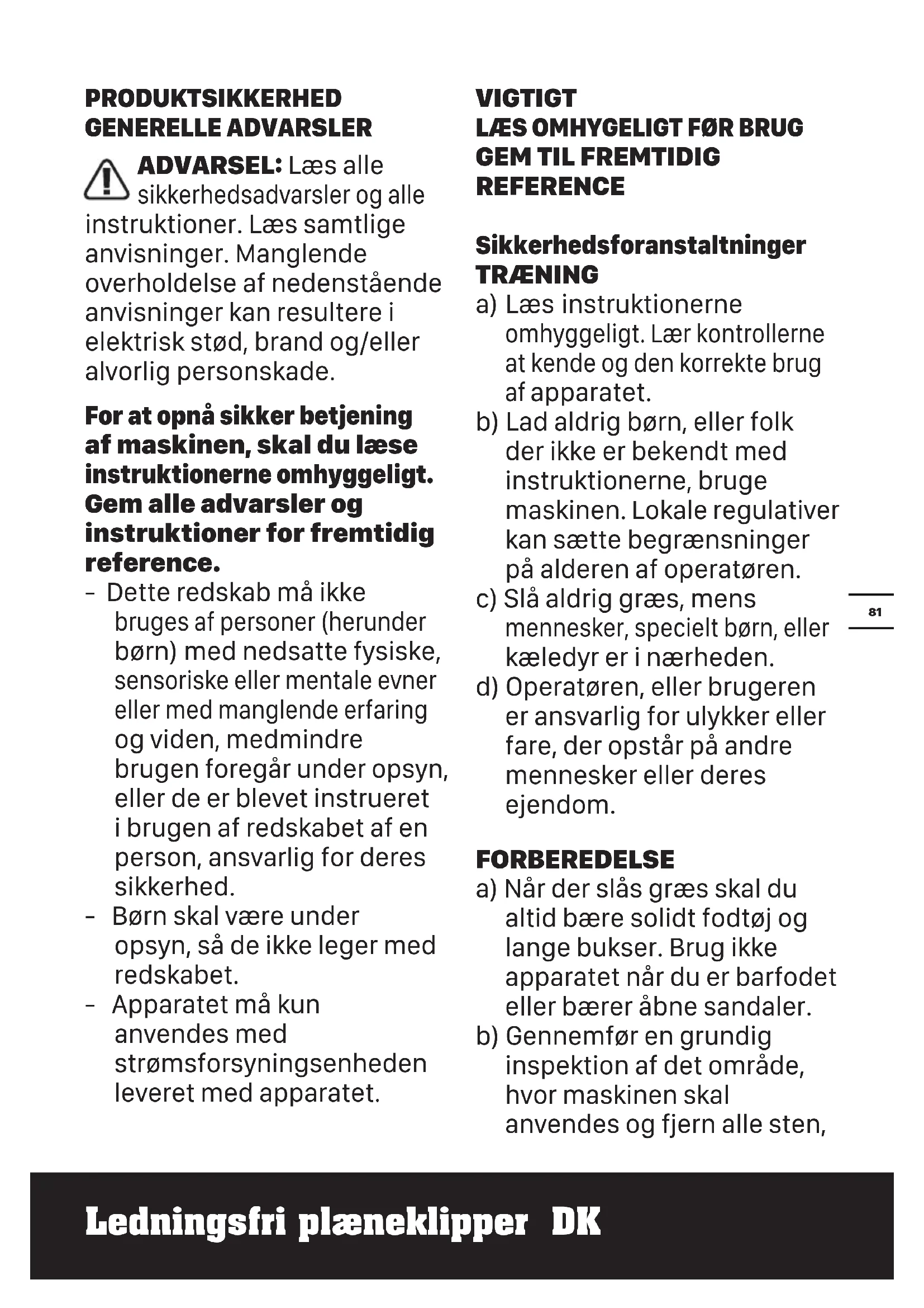 apparatet. b) Lad aldrig børn, eller folk der ikke er bekendt med instruktionerne, bruge maskinen. Lokale regulativer kan sætte begrænsninger på alderen af operatøren. c) Slå aldrig græs, mens mennesker, specielt børn, eller kæledyr er i nærheden. d) Operatøren, eller brugeren er ansvarlig for ulykker eller fare, der opstår på andre mennesker eller deres ejendom. FORBEREDELSE a) Når der slås græs skal du altid bære solidt fodtøj og lange bukser. Brug ikke apparatet når du er barfodet eller bærer åbne sandaler. b) Gennemfør en grundig inspektion af det område, hvor maskinen skal anvendes og fjern alle sten,82 Ledningsfri plæneklipper DK pinde, tråd, ben, og andre fremmedlegemer. c) Før brug skal du altid udføre en visuel inspektion for at se om bladene, bladboltene og skæreenheden ikke er slidt eller beskadiget. Udskift slidte eller beskadigede blade og bolte i sæt, for at bevare balancen; Udskift beskadigede og ulæselige skilter. DRIFT a) Slå kun græs i dagslys eller i god kunstigt lys. b)Undgå at bruge plæneklipperen i vådt græs, hvis det er muligt. c) Hold altid dit fodfæste på hældninger. d)Gå, løb aldrig; e) Ved brug af roterende maskiner på hjul, skal der slås på tværs af hældninger, aldrig op og ned. f) Udvis ekstrem forsigtighed, når du ændrer retning på hældninger. g)Slå ikke på ekstreme hældninger. h)Udvis ekstrem forsigtighed når du bakker eller trækker plæneklipperen i mod dig.