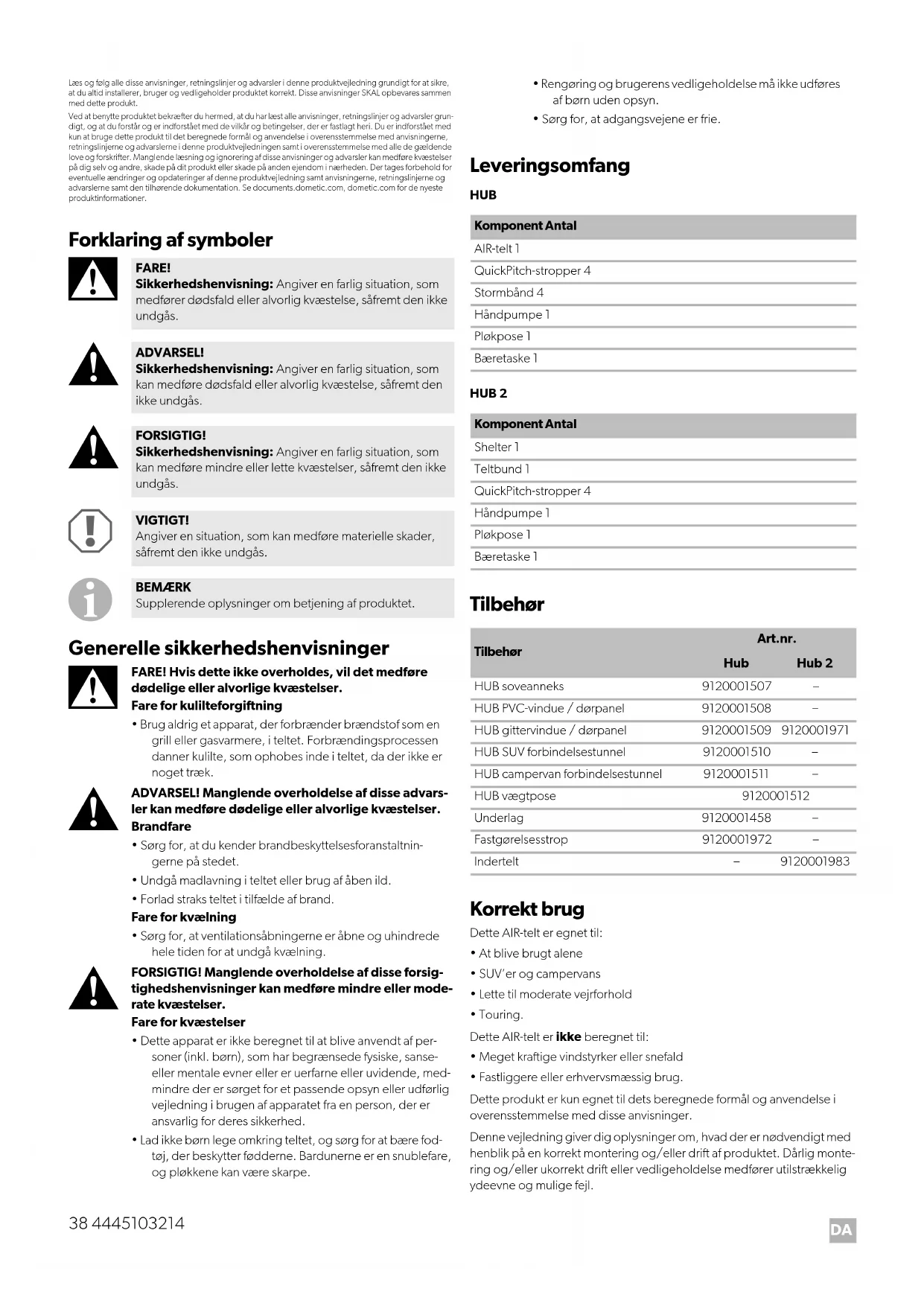 - Fastliggere eller erhvervsmæssig brug. Dette produkt er kun egnet til dets beregnede formål og anvendelse i overensstemmelse med disse anvisninger. Denne vejledning giver dig oplysninger om, hvad der er nødvendigt med henblik på en korrekt montering og/eller drift af produktet. Dårlig monte- ring og/eller ukorrekt drift eller vedligeholdelse medfører utilstrækkelig ydeevne og mulige fejl. FARE! Sikkerhedshenvisning: Angiver en farlig situation, som medfører dødsfald eller alvorlig kvæstelse, såfremt den ikke undgås. ADVARSEL! Sikkerhedshenvisning: Angiver en farlig situation, som kan medføre dødsfald eller alvorlig kvæstelse, såfremt den ikke undgås. FORSIGTIG! Sikkerhedshenvisning: Angiver en farlig situation, som kan medføre mindre eller lette kvæstelser, såfremt den ikke undgås. VIGTIGT! Angiver en situation, som kan medføre materielle skader, såfremt den ikke undgås. BEMÆRK Supplerende oplysninger om betjening af produktet. Komponent Antal AIR-telt 1 QuickPitch-stropper 4 Stormbånd 4 Håndpumpe 1 Pløkpose 1 Bæretaske 1 Komponent Antal Shelter 1 Teltbund 1 QuickPitch-stropper 4 Håndpumpe 1 Pløkpose 1 Bæretaske 1 Tilbehør Art.nr. Hub Hub 2 HUB soveanneks 9120001507 – HUB PVC-vindue / dørpanel 9120001508 – HUB gittervindue / dørpanel 9120001509 9120001971 HUB SUV forbindelsestunnel 9120001510 – HUB campervan forbindelsestunnel 9120001511 – HUB vægtpose 9120001512 Underlag 9120001458 – Fastgørelsesstrop 9120001972 – Indertelt – 9120001983DA