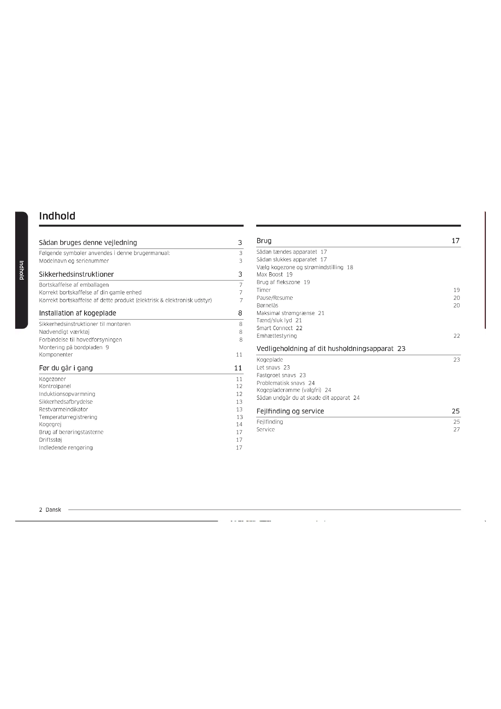 - (opłata według taryfy operatora) http://www.samsung.com/pl/ support/ ROMANIA 0800872678 - Apel gratuit *8000 - Apel tarifat în reţea Program Call Center Luni - Vineri: 9 AM - 6 PM www.samsung.com/ro/support SERBIA 011 321 6899 www.samsung.com/rs/support SLOVAKIA 0800 - SAMSUNG (0800-726 786) www.samsung.com/sk/support LITHUANIA 8-800-77777 www.samsung.com/lt/support LATVIA 8000-7267 www.samsung.com/lv/support ESTONIA 800-7267 www.samsung.com/ee/support SLOVENIA 080 697 267 (brezplačna številka) www.samsung.com/si/support KOSOVO 038 40 30 90 www.samsung.com/support SPØRSMÅL ELLER KOMMENTARER?Induktionskogeplade Brugermanual NZ64B5067Y**2 Dansk Indhold Indhold Brug 17 Sådan tændes apparatet 17 Sådan slukkes apparatet 17 Vælg kogezone og strømindstilling 18 Max Boost 19 Brug af ekszone 19 Timer 19 Pause/Resume 20 Børnelås 20 Maksimal strømgrænse 21 Tænd/sluk lyd 21 Smart Connect 22 Emhættestyring 22 Vedligeholdning af dit husholdningsapparat 23 Kogeplade 23 Let snavs 23 Fastgroet snavs 23 Problematisk snavs 24 Kogepladeramme (valgfri) 24 Sådan undgår du at skade dit apparat 24 Fejlnding og service 25 Fejlnding 25 Service 27 Indhold Sådan bruges denne vejledning 3 Følgende symboler anvendes i denne brugermanual: 3 Modelnavn og serienummer 3 Sikkerhedsinstruktioner 3 Bortskaffelse af emballagen 7 Korrekt bortskaffelse af din gamle enhed 7 Korrekt bortskaffelse af dette produkt (elektrisk & elektronisk udstyr) 7 Installation af kogeplade 8 Sikkerhedsinstruktioner til montøren 8 Nødvendigt værktøj 8 Forbindelse til hovedforsyningen 8 Montering på bordpladen 9 Komponenter 11 Før du går i gang 11 Kogezoner 11 Kontrolpanel 12 Induktionsopvarmning 12 Sikkerhedsafbrydelse 13 Restvarmeindikator 13 Temperaturregistrering 13 Kogegrej 14 Brug af berøringstasterne 17 Driftsstøj 17 Indledende rengøring 17Dansk 3 Sådan bruges denne vejledning Sådan bruges denne vejledning Tag et øjeblik til at læse denne brugermanual, og vær særligt opmærksom på sikkerhedsoplysningerne i det næste afsnit, før du bruger dit apparat. Behold denne vejledning til senere brug. Husk at give brugermanualen til den nye ejer, hvis apparatet skifter ejer. Følgende symboler anvendes i denne brugermanual: ADVARSEL Farer eller usikker praksis, der kan føre til alvorlig personskade eller dødsfald. FORSIGTIG Farer eller usikker praksis, der kunne føre til mindre personskade eller ejendomsskade. FORSIGTIG Følg disse grundlæggende sikkerhedsforholdsregler for at reducere risikoen for brand, eksplosion, elektrisk stød eller personskade, når du bruger din kogeplade. BEMÆRK Nyttige tips, anbefalinger eller oplysninger, der hjælper brugere med at håndtere produktet. Modelnavn og serienummer Både modelnavnet og serienummeret er mærket under kogepladens bund. Skriv oplysningerne ned til senere brug, eller fastgør det ekstra produktmærke (der er placeret oven på produktet) til denne side. Modelnavn Serienummer Sikkerhedsinstruktioner De sikkerhedsmæssige aspekter af dette husholdningsapparat overholder alle accepterede tekniske og sikkerhedsmæssige standarder. Dog mener vi som fabrikanter også, at det er vores ansvar at gøre dig bekendt med de følgende sikkerhedsinstruktioner. ADVARSEL Dette husholdningsapparat er ikke beregnet til brug af personer (inklusiv børn) med reducerede fysiske, sensoriske eller mentale evner eller mangel på erfaring eller viden, medmindre de er under opsyn eller har fået vejledning i brugen af apparatet af en person, der er ansvarlig for deres sikkerhed. Børn skal være under opsyn for at sikre, at de ikke leger med apparatet. Dette apparat kan benyttes af børn fra 8 år og derover og personer med reducerede fysiske, sensoriske og mentale evner eller mangel på erfaring eller viden, hvis de er blevet korrekt vejledt eller instrueret i apparatets brug på en sikker måde og forstår farerne ved dets brug. Børn må ikke lege med apparatet. Rengøring og vedligeholdelse må ikke udføres af børn uden opsyn. Apparatets afbrydelsesmetode skal være indarbejdet i den faste ledningsførelse i overensstemmelse med de regler, der gælder for ledningsførelse.4 Dansk Sikkerhedsinstruktioner Sikkerhedsinstruktioner FORSIGTIG: Madlavningsprocessen skal foregå under opsyn. En kortvarig kogeproces skal være under kontinuerligt opsyn. Apparatet må ikke installeres bag en dekorativ dør for at undgå overophedning. ADVARSEL: Apparatet og dets tilgængelige dele kan blive varme under brug. Der skal udvises omhu for ikke at berøre varmeelementerne. Børn under 8 år skal holdes væk fra apparatet, medmindre de er under kontinuerligt opsyn. ADVARSEL: Madlavning uden opsyn indeholdende fedtstoffer eller olie kan være farligt og resultere i brand. Prøv ALDRIG at slukke for en ild med vand, men sluk for apparatet og dæk ammen til med eksempelvis et låg eller brandtæppe. ADVARSEL: Fare for brand: Opbevar ikke elementer på kogeoveraden. ADVARSEL: Brug kun kogepladeværn, der er designet af fabrikanten af madlavningsapparatet, eller som er indikeret som passende af fabrikanten i brugsinstruktionerne, eller som er indarbejdet i apparatet. Brug af upassende værn kan forårsage uheld. Overaderne bliver varme under brug. Dette apparat skal kunne afbrydes fra elforsyningen efter installation. Afbrydelsen kan opnås ved at have et tilgængeligt stik eller ved at indarbejde en stikkontakt i overensstemmelse med de gældende regler for ledningsførelse. Hvis strømforsyningen skades, skal den erstattes af fabrikanten, fabrikantens serviceagent eller tilsvarende kvalicerede personer for at undgå farer. Metoden til fastgørelse må ikke afhænge af klæbemidler, da disse ikke anses som værende pålidelige til fastgørelse. ADVARSEL: Hvis overaden er revnet, skal der slukkes for apparatet for at undgå risiko for elektrisk stød. Apparatet bliver varmt under brug. Der skal udvises omhu for ikke at berøre varmeelementerne i kogepladen. ADVARSEL: Tilgængelige dele kan bl