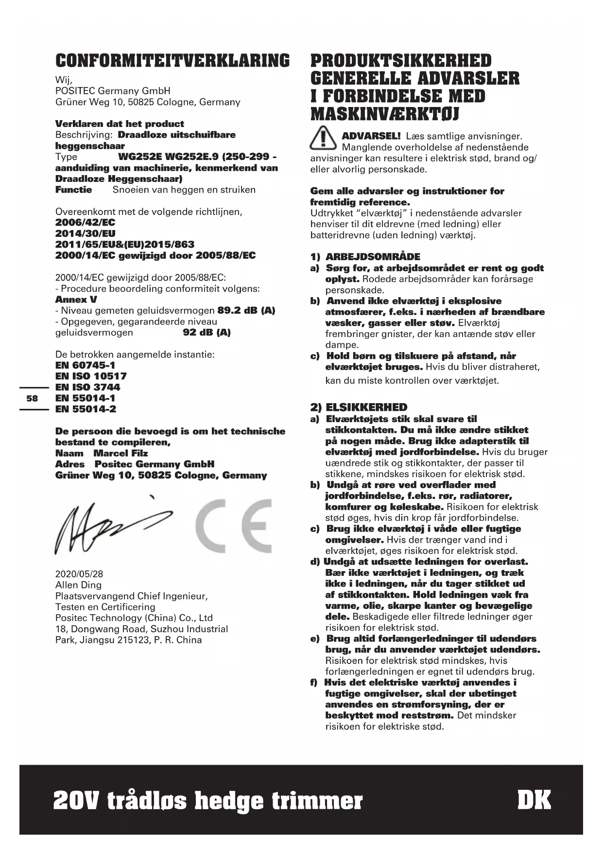 negative (-) tegn på batteriet, og sørg for, at de bruges korrekt. SYMBOLER Advarsel For at undgå risikoen for personskader skal brugeren læse brugervejledningen Bær høreværn Bær øjenværn Bær støvmaske Iført en beskyttende hætte Beskyttelsessko Hold en tilstrækkelig afstand fra netledningen Hold dig væk fra tilskuere Hold hænderne væk Fjern batteriet før du udfører justeringer, service eller vedligeholdelse. Lithium-ion-batteri.. Dette produkt er markeret med symbolet “samlet separat” med alle batteripakker og batteripakker. Genanvend derefter eller fjern det for at reducere påvirkningen på miljøet. Batteripakken indeholder skadelige stoffer, der kan være skadelige for miljøet og menneskers sundhed. udsættes for regn Hvis det ikke håndteres korrekt, kan batteriet muligvis komme ind i vandcyklussen, hvilket kan forårsage skade på økosystemet. Bortskaf ikke brugte batterier som usorteret kommunalt affald.62 20V trådløs hedge trimmer