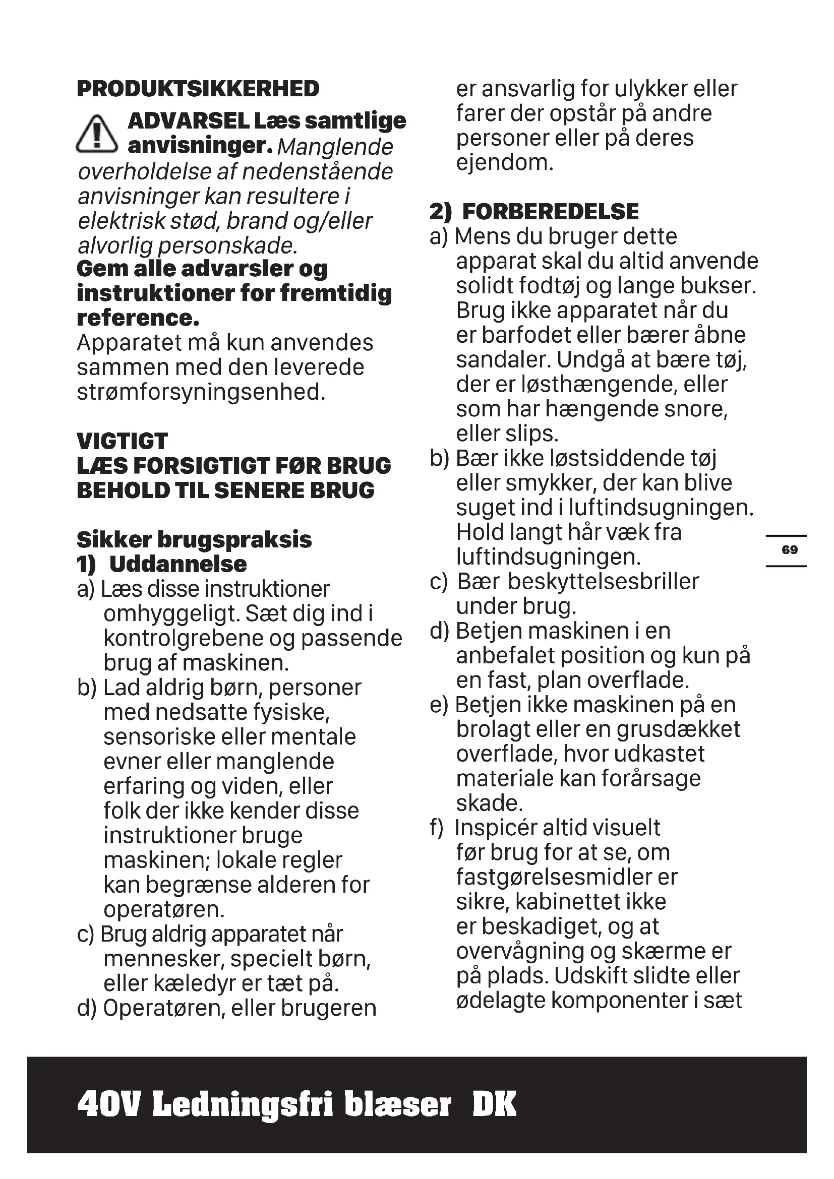 a) Læs disse instruktioner omhyggeligt. Sæt dig ind i kontrolgrebene og passende brug af maskinen. b) Lad aldrig børn, personer med nedsatte fysiske, sensoriske eller mentale evner eller manglende erfaring og viden, eller folk der ikke kender disse instruktioner bruge maskinen; lokale regler kan begrænse alderen for operatøren. c) Brug aldrig apparatet når mennesker, specielt børn, eller kæledyr er tæt på. d) Operatøren, eller brugeren er ansvarlig for ulykker eller farer der opstår på andre personer eller på deres ejendom.