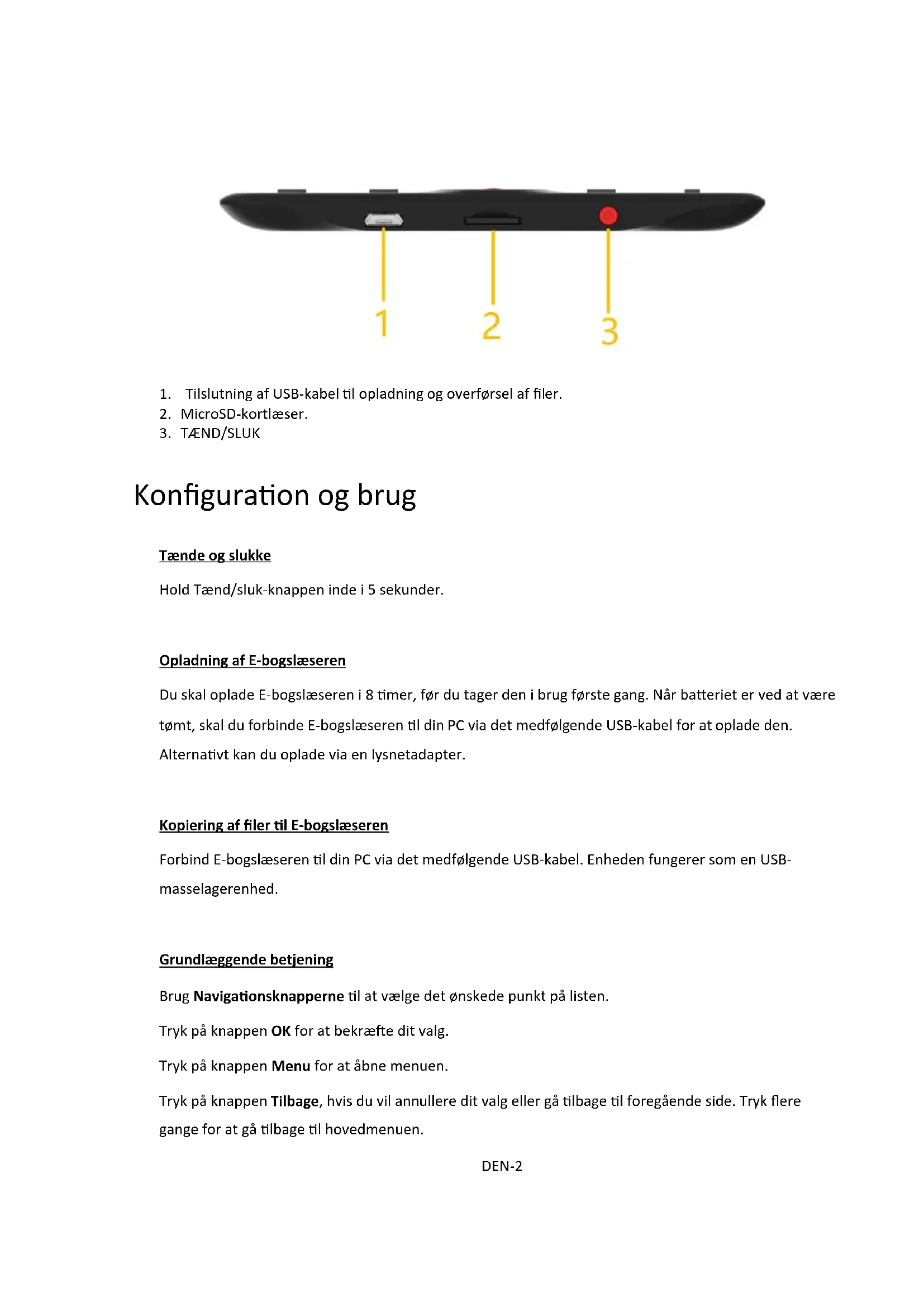 Konfiguration og brug Tænde og slukke Hold Tænd/sluk-knappen inde i 5 sekunder. Opladning af E-bogslæseren Du skal oplade E-bogslæseren i 8 timer, før du tager den i brug første gang. Når batteriet er ved at være tømt, skal du forbinde E-bogslæseren til din PC via det medfølgende USB-kabel for at oplade den. Alternativt kan du oplade via en lysnetadapter. Kopiering af filer til E-bogslæseren Forbind E-bogslæseren til din PC via det medfølgende USB-kabel. Enheden fungerer som en USB- masselagerenhed. Grundlæggende betjening Brug Navigationsknapperne til at vælge det ønskede punkt på listen. Tryk på knappen OK for at bekræfte dit valg. Tryk på knappen Menu for at åbne menuen. Tryk på knappen Tilbage, hvis du vil annullere dit valg eller gå tilbage til foregående side. Tryk flere gange for at gå tilbage til hovedmenuen. DEN-2Startskærm De tre senest åbnede e-bøger vises i afsnittet med senest læste. De fire senest tilføjede e-bøger vises i afsnittet med nye tilføjelser. Bibliotek Åbn afsnittet Bibliotek for at vise alle e-bøger i læseren (både i den interne hukommelse og på et eventuelt isat microSD-kort). Filformatet vises til højre for titlen. Brugeren kan få vist listen med sine foretrukne e-bøger i undermenuen til biblioteket og søge efter bøger, sortere efter titel/forfatter/senest læst/senest tilføjet samt vælge, hvordan filerne vises (som liste eller som miniature af omslag).