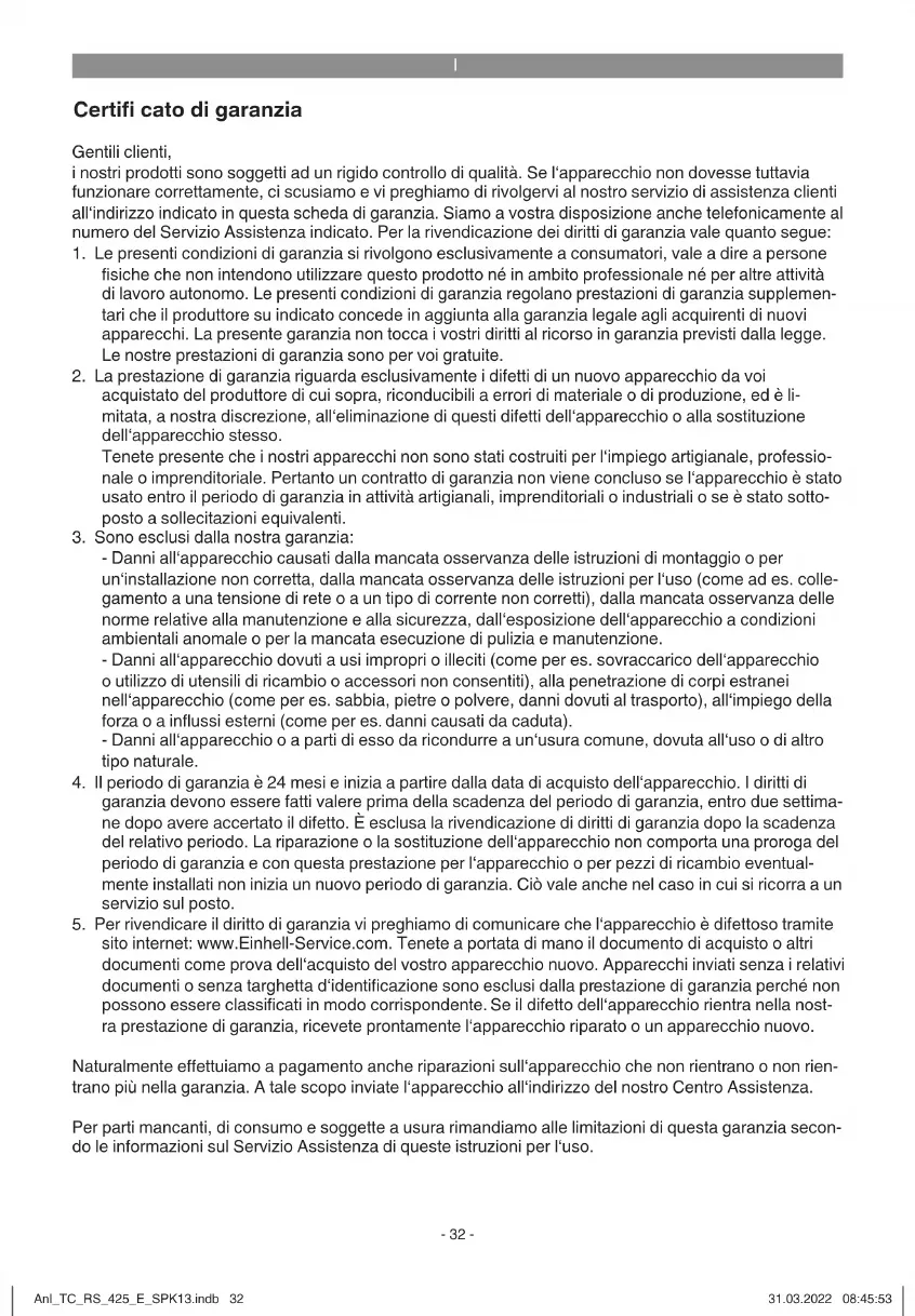 www.Einhell-Service.com. Sørg for at have købskvitteringen eller anden form for dokumentation af købet af det nye apparat ved hånden. Apparater, der sendes ind uden passende dokumentation el- ler uden typeskilt, er udelukket fra garantiydelsen på grund af manglende identifi cering. Er defekten omfattet af garantien, vil produktet omgående blive repareret og returneret, eller du vil modtage et helt nyt. Mod betaling udbedrer vi naturligvis også gerne defekter på produktet, som ikke/ikke længere er omfat- tet af garantien. Du skal blot indsende produktet til vores serviceadresse. Hvad angår slid- og forbrugsdele samt manglende dele henviser vi til garantiens indskrænkninger i hen- hold til serviceinformationerne i nærværende betjeningsvejledning. Anl_TC_RS_425_E_SPK13.indb 39Anl_TC_RS_425_E_SPK13.indb 39 31.03.2022 08:45:5631.03.2022 08:45:56S