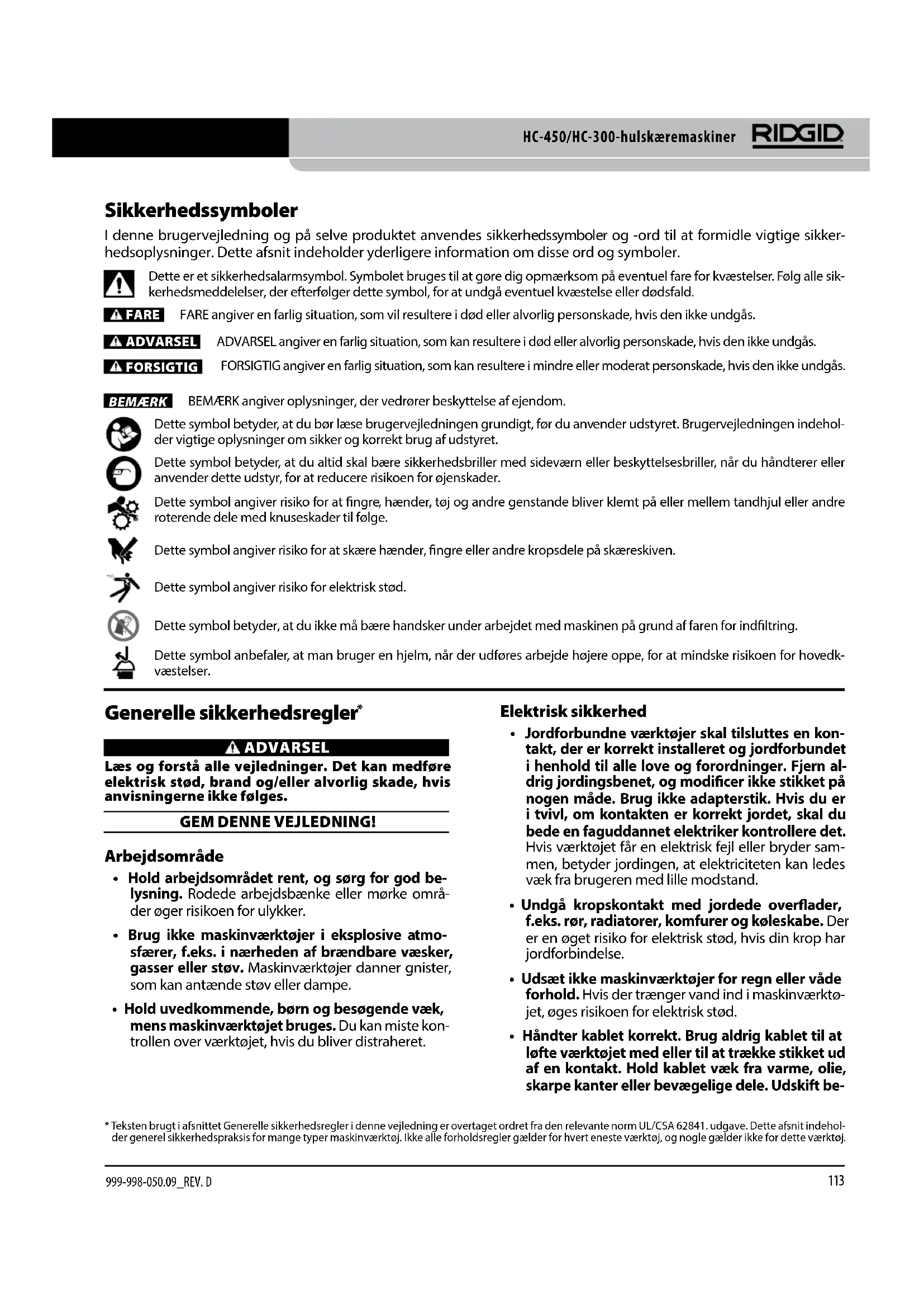 - Eventuelle andre forhold, der kan forhindre sikker og normal funktion. Hvis der konstateres problemer, må hulskæremaski- nen ikke benyttes, før problemerne er afhjulpet. Figur 4A – HC-450-advarselsmærkaterFigur 4B – HC-300-advarselsmærkater118 HC-450/HC-300-hulskæremaskiner 999-998-050.09_REV. D 4. Kontrollér dornen, hulsaven og borene, der skal bruges med hulskæremaskinen, for tegn på slid, deformering, brud eller andre skader. Du må ikke bruge sløve eller beskadigede skæreværktøjer. Sløve eller beskadigede skæreværktøjer betyder, at der skal bruges mere kraft til at skære, at kvaliteten af arbejdet forringes, og at ri-sikoen for skader øges. Sørg for at have tørre hænder, og sæt ledningen i. Kontrollér, om fejlstrømsafbryderen i den elektriske ledning fungerer korrekt. Når testknappen trykkes ind, skal nulstillingsknap- pen springe ud. Aktivér igen ved at trykke på nulstillings-knappen. Hvis fejlstrømsafbryderen ikke fungerer korrekt, skal du trække ledningen ud og undlade at anvende skære-maskinen, indtil fejlstrømsafbryderen er blevet repareret. 6. Stil hulskæremaskinen på en stabil overade, og kon-trollér, at maskinen fungerer korrekt. Hold afstand til patronen. Sæt ON/OFF-kontakten i positionen ON. Mo-toren skal starte og patronen dreje mod uret, når den betragtes fra patronenden. Kontrollér, om maskinen er fejljusteret, binder, har mislyde eller for andre unormale forhold. Sæt ON/OFF-kontakten i positionen OFF. Hvis der afsløres problemer, skal maskinen repareres, før den bruges. 7. Når eftersynet er fuldført, skal du trække stikket ud med tørre hænder. Klargøring af maskine og arbejdsområde ADVARSEL Opsæt hulskæremaskinen og arbejdsområdet i henhold til disse procedurer for at reducere risiko-en for personskade fra elektrisk stød, indfiltring, knuseskader og lignende samt forhindre værk-tøjsbeskadigelse.Fastgør hulskæremaskinen til røret korrekt. For-kert fastgjorte hulskæremaskiner kan glide og falde ned og forårsage slag eller knuseskader.Brug ikke maskinen på varme rør. Når der skæres i et eksisterende system, skal røret være tømt og trykket taget af, inden der skæres. Dermed redu-ceres risikoen for elektriske stød og andre alvor-lige skader.Når der arbejdes højere oppe, skal alt personale benytte hjelm og holde sig på afstand fra området nedenfor. Dermed reduceres risikoen for alvorlig skade i tilfælde af, at der falder udstyr eller andre genstande ned. 1. Kontrollér arbejdsområdet for: