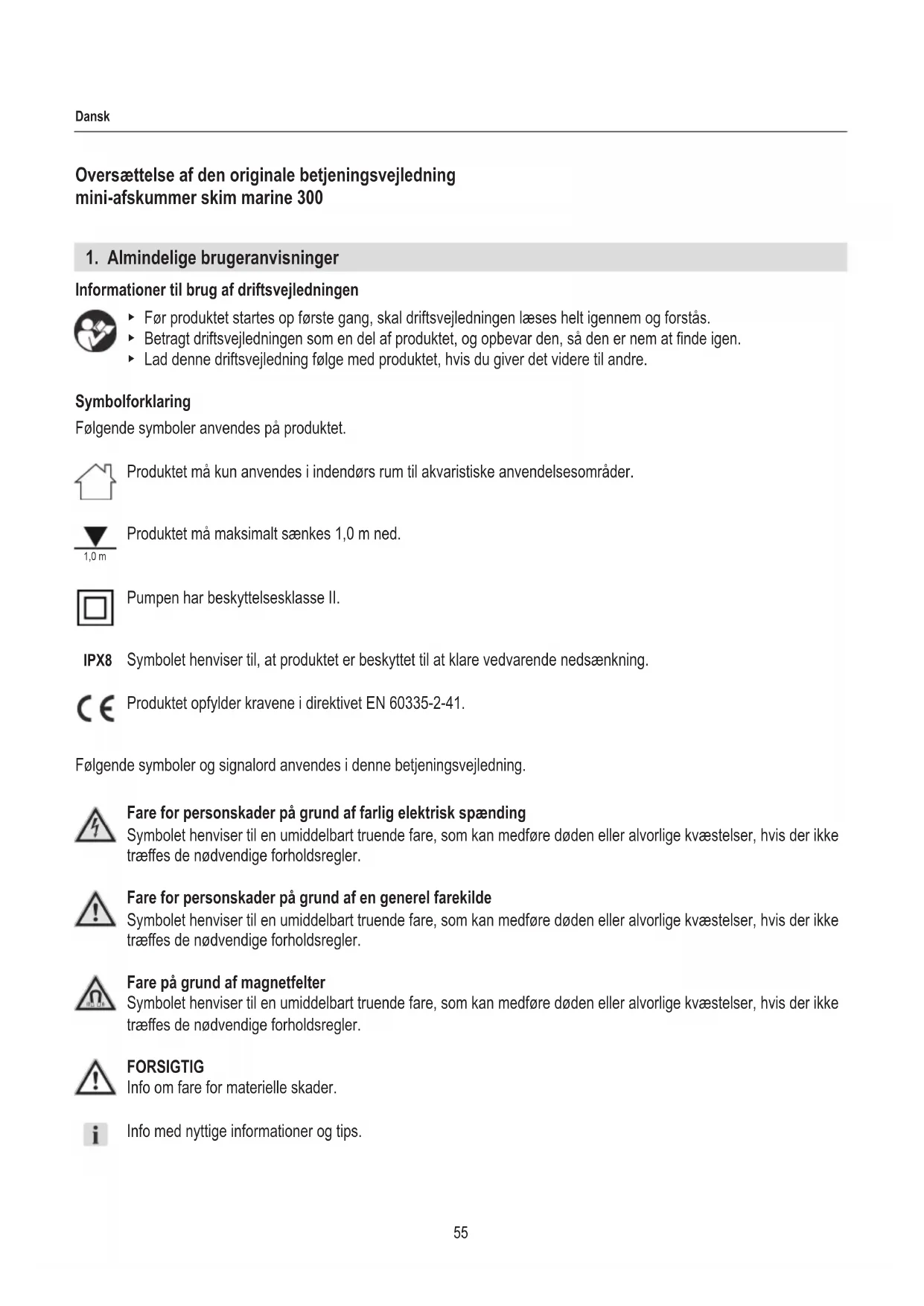 Informationer til brug af driftsvejledningen ▶ Før produktet startes op første gang, skal driftsvejledningen læses helt igennem og forstås. ▶ Betragt driftsvejledningen som en del af produktet, og opbevar den, så den er nem at nde igen. ▶ Lad denne driftsvejledning følge med produktet, hvis du giver det videre til andre. Symbolforklaring Følgende symboler anvendes på produktet. Produktet må kun anvendes i indendørs rum til akvaristiske anvendelsesområder. Produktet må maksimalt sænkes 1,0 m ned. Pumpen har beskyttelsesklasse II. Symbolet henviser til, at produktet er beskyttet til at klare vedvarende nedsænkning. Produktet opfylder kravene i direktivet EN 60335-2-41. Følgende symboler og signalord anvendes i denne betjeningsvejledning. Fare for personskader på grund af farlig elektrisk spænding Symbolet henviser til en umiddelbart truende fare, som kan medføre døden eller alvorlige kvæstelser, hvis der ikke træes de nødvendige forholdsregler. Fare for personskader på grund af en generel farekilde Symbolet henviser til en umiddelbart truende fare, som kan medføre døden eller alvorlige kvæstelser, hvis der ikke træes de nødvendige forholdsregler. Fare på grund af magnetfelter Symbolet henviser til en umiddelbart truende fare, som kan medføre døden eller alvorlige kvæstelser, hvis der ikke træes de nødvendige forholdsregler. FORSIGTIG Info om fare for materielle skader. Info med nyttige informationer og tips. 1,0 m IPX856 Dansk Henviser til en gur, her henvisning til gur A Du bliver bedt om en handling.