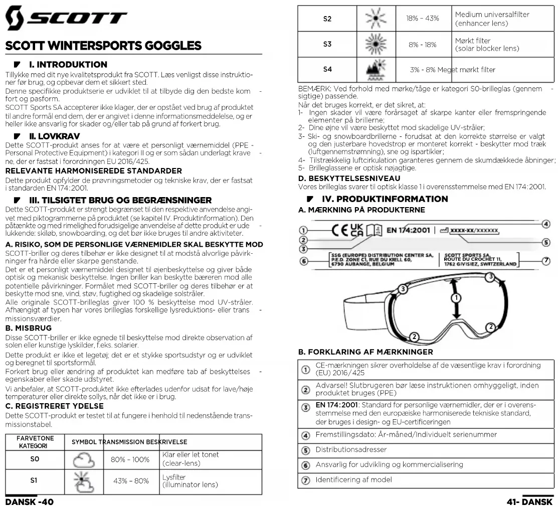 lukkende: skiløb, snowboarding, og det bør ikke bruges til andre aktiviteter. A. RISIKO, SOM DE PERSONLIGE VÆRNEMIDLER SKAL BESKYTTE MOD SCOTT-briller og deres tilbehør er ikke designet til at modstå alvorlige påvirk- ninger fra hårde eller skarpe genstande. Det er et personligt værnemiddel designet til øjenbeskyttelse og giver både optisk og mekanisk beskyttelse. Ingen briller kan beskytte bæreren mod alle potentielle påvirkninger. Formålet med SCOTT-briller og deres tilbehør er at beskytte mod sne, vind, støv, fugtighed og skadelige solstråler. Alle originale SCOTT-brilleglas giver 100 % beskyttelse mod UV-stråler. Afhængigt af typen har vores brilleglas forskellige lysreduktions- eller trans