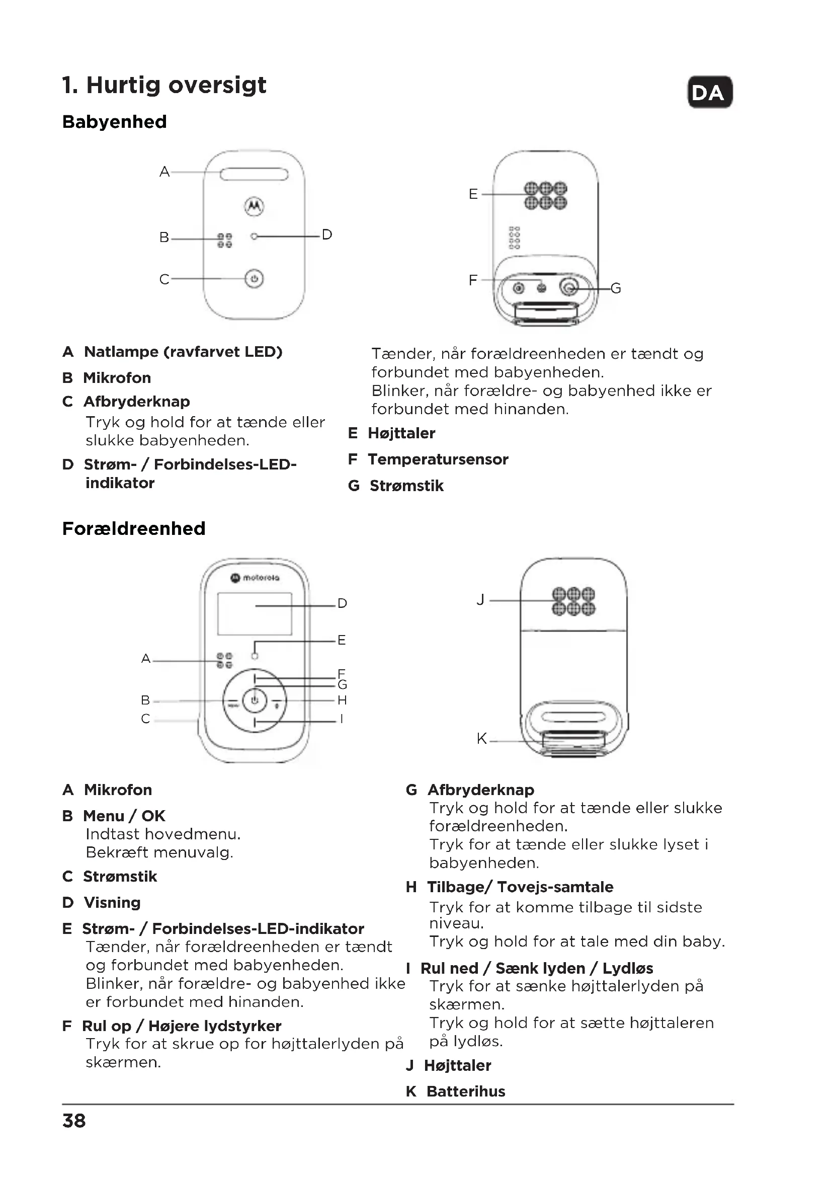 Babyenhed A Natlampe (ravfarvet LED) B Mikrofon C Afbryderknap Tryk og hold for at tænde eller slukke babyenheden. D Strøm- / Forbindelses-LED- indikator Tænder, når forældreenheden er tændt og forbundet med babyenheden. Blinker, når forældre- og babyenhed ikke er forbundet med hinanden. E Højttaler F Temperatursensor G Strømstik Forældreenhed A Mikrofon B Menu / OK Indtast hovedmenu. Bekræft menuvalg. C Strømstik D Visning E Strøm- / Forbindelses-LED-indikator Tænder, når forældreenheden er tændt og forbundet med babyenheden. Blinker, når forældre- og babyenhed ikke er forbundet med hinanden. F Rul op / Højere lydstyrker Tryk for at skrue op for højttalerlyden på skærmen.