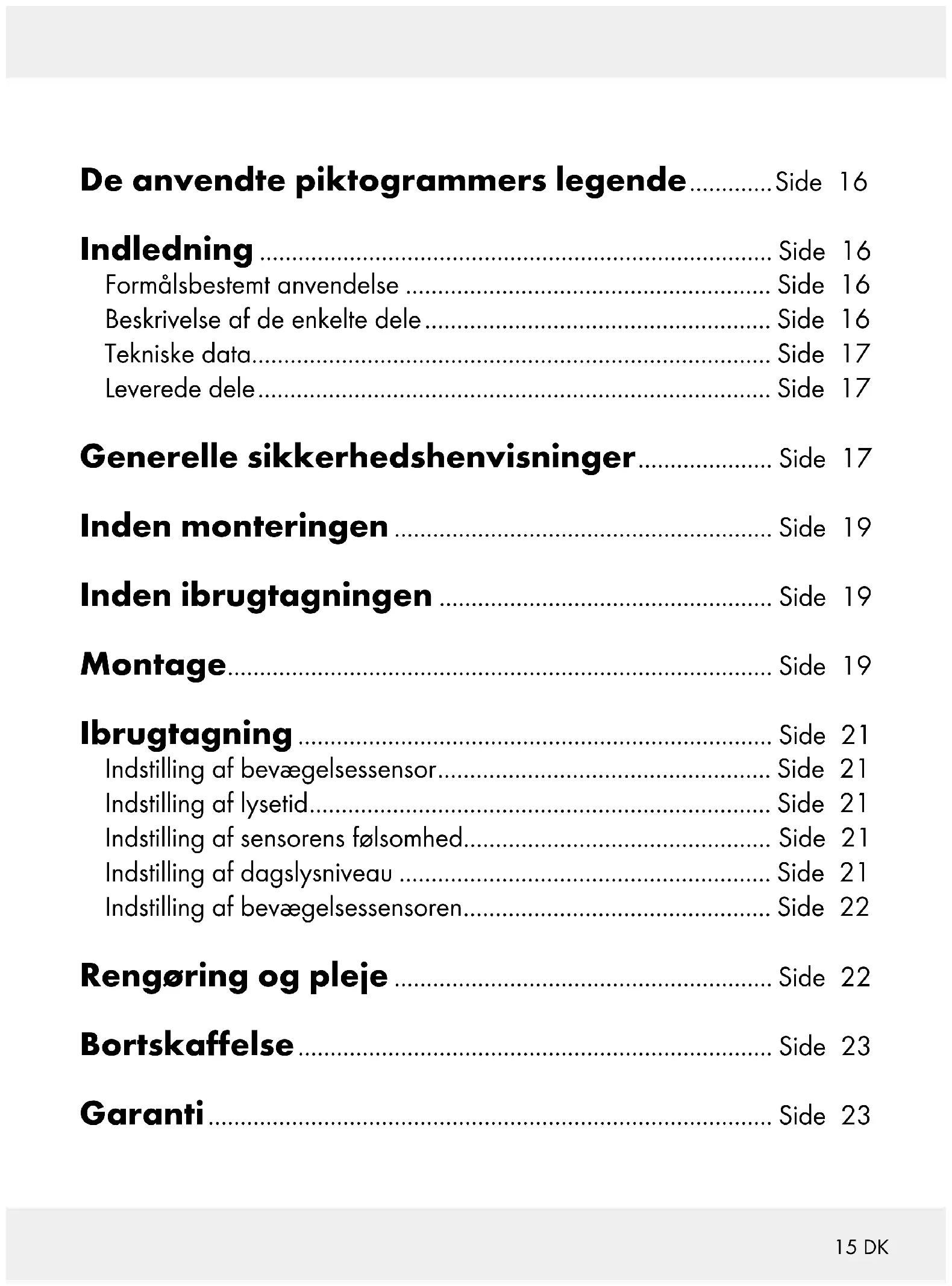 langsom i urets retning, indtil den reagerer påbevægelse i registreringsområdet. Rengøring og pleje Fjern sikringen i sikringskassen inden rengøringen eller sluk for sikkerhedskontakten. Dyk produktet aldrig i vand eller andre væsker. I modsat fald kan produktet tage skade. Rengør produktet med en fnugfri, let fugtet klud og mildt rengø- ringsmiddel. Indsæt sikringen efter rengørin- gen og før ibrugtagningen og tænd for effektafbryderen.23 DK Bortskaffelse Indpakningen består af miljøvenlige materialer, som De kan bortskaffe over de lokale genbrugssteder. Det grønne miljømærke gælder ikke for Tyskland.