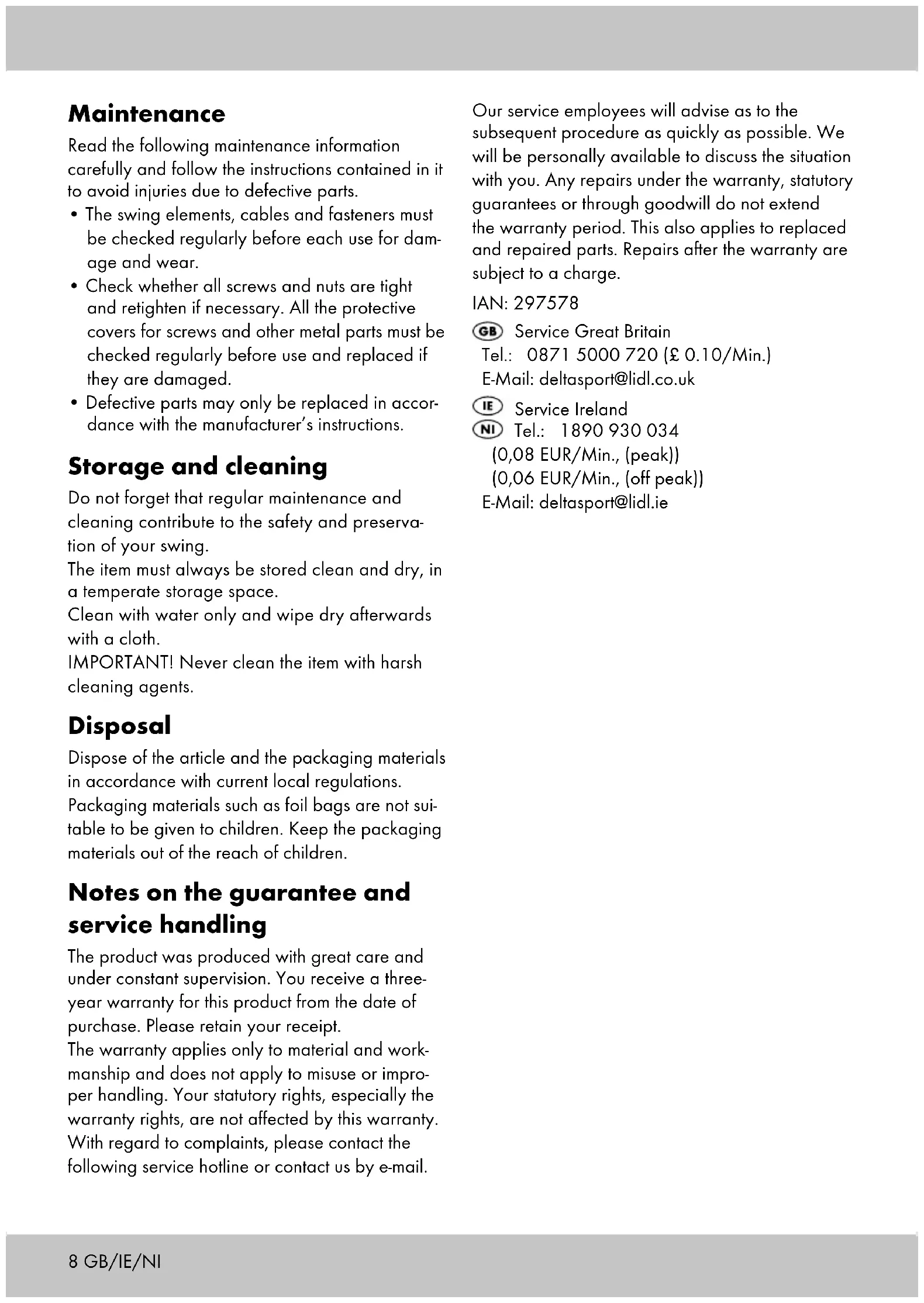 - Defekte dele må kun udskiftes i henhold til producentens anvisninger. Opbevaring, rengøring Glem ikke, at regelmæssig vedligeholdelse og rengøring bidrager til produktets sikkerhed og holdbarhed. Opbevar altid produktet tørt og rent i et tempere- ret lokale. Rengør kun med vand, og tør efter med et viskestykke. VIGTIGT! Må aldrig rengøres med skarpe rengø- ringsmidler. Henvisninger vedr. bortskaffelse Bortskaf artikel og emballage i overensstemmelse med lokalt gældende forskrifter. Emballagema- terialer som f.eks. plastposer hører ikke hjemme i børnehænder. Opbevar emballagen utilgængeligt for børn. Oplysninger om garanti og servicehåndtering Produktet er fremstillet med største omhu og under vedvarende kontrol. Der ydes en garanti på tre år fra købsdatoen på dette produkt. Opbevar venligst kvitteringen fra købet. Garantien gælder kun for materiale- og fabrikati- onsfejl og bortfalder ved misbrug eller uhensigts- mæssig anvendelse. Deres lovpligtige rettigheder, særligt garantikrav, begrænses ikke af denne garanti. Ved eventuelle klager bedes du henvende dig til nedenstående service-hotline eller tage kontakt til os via e-mail. Medarbejderne i vores kundetjeneste vil så aftale den videre fremgangsmåde med dig. Vi vil under alle omstændigheder rådgive dig personlig. Garantiperioden forlænges ikke ved eventuelle reparationer inden for garantien eller ved kulance. Dette gælder også for udskiftede og reparerede dele. Efter udløb af garantien er forefaldende reparationer forbundet med omkostninger. IAN: 297578 Service Danmark Tel.: 32 710005 E-Mail: deltasport@lidl.dk12 FR/BE Félicitations ! Vous avez acquis un produit de haute qualité. Ap- prenez à connaître le produit avant sa première utilisation. Lisez pour cela attentivement la notice d’utilisation suivante. N’utilisez le produit que comme décrit et pour les zones d’application indiquées. Veuillez conserver cette notice d’utilisation. Trans- mettez tous les documents en cas de cession du produit à une tierce personne. Étendue de la livraison (fig. A) 1 siège (1) 1 dossier (2) 1 protection avant (3) 2 vis de blocage (4) 10 clip (5) 10 vis (6) 1 notice d’utilisation Caractéristiques techniques Longueur des cordes : env. 160 cm Charge maximale de l’article : 50 kg Date de fabrication (mois/année) : 03/2018 max. 60° Maximale Auslenkung 60° Vorsicht! Ein zu kräftiges Anschieben des Schaukelsitzes über die vorgeschlagene maximale Auslenkung (siehe Abbildung in der Bedienungsanleitung) kann dazu führen, dass der Sitz kippt und das Kind herausfällt! Déviation maximale : 60° Utilisation conforme à sa desti- nation L’article a été conçu comme jouet destiné à un usage privé pour les enfants de 6 mois à 8 ans. L’article ne doit pas être utilisé dans des infrastruc- tures publics comme des aires de jeux, les écoles etc. Consignes de sécurité Risque de blessure !