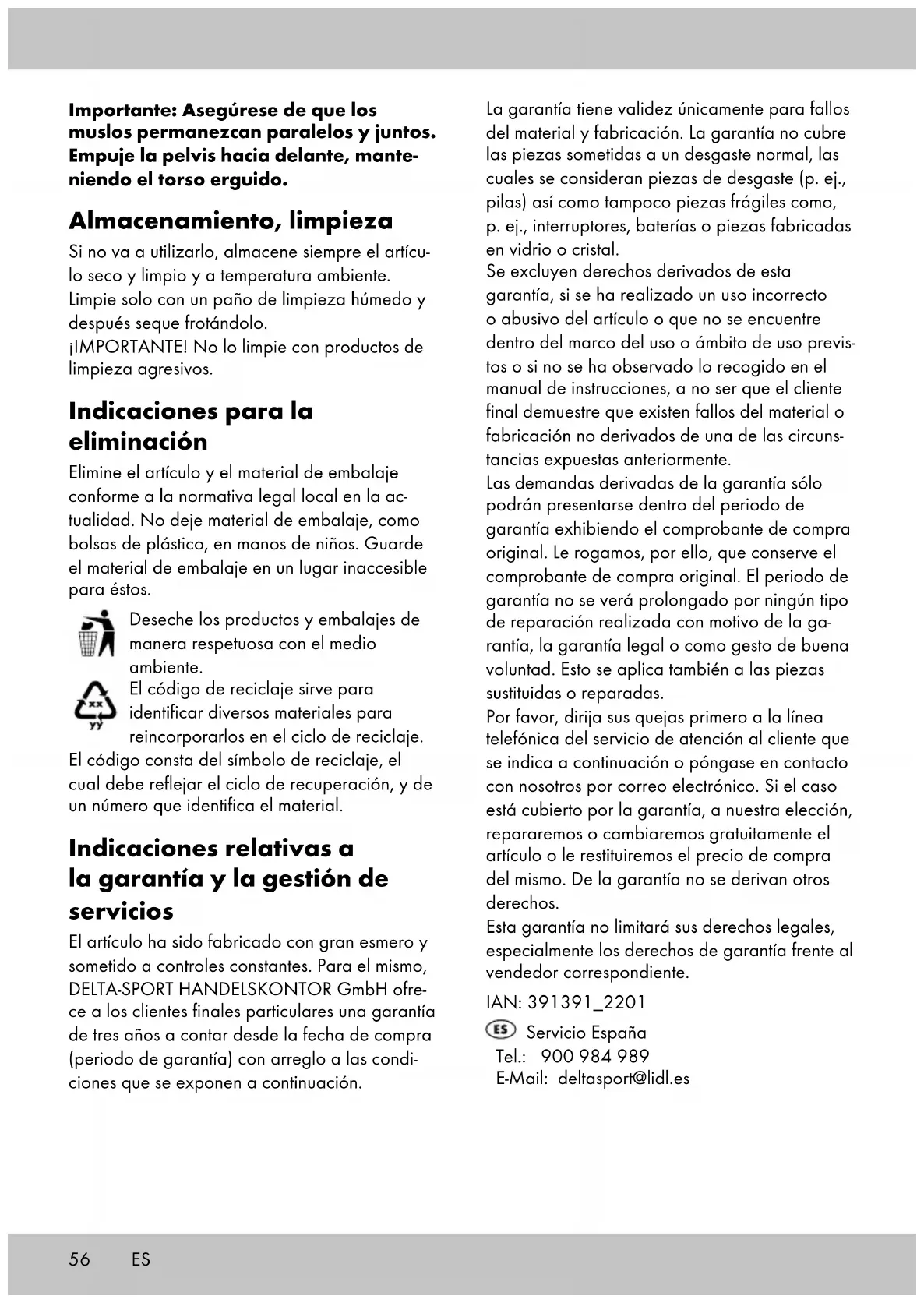 Vigtigt: Sørg for, at holde lårene paral- lelle. Skyd bækkenet fremad, og hold overkroppen oprejst. Opbevaring, rengøring Opbevar altid artiklen tør og ren ved stuetempe- ratur, når den ikke er i brug. Rengør kun med en fugtig klud, og tør af bag- efter. VIGTIGT! Må aldrig rengøres med skrappe rengøringsmidler. Henvisninger vedr. bortskaffelse Bortskaf artikel og emballage i overensstem- melse med lokalt gældende forskrifter. Embal- lagematerialer som f.eks. plastposer hører ikke hjemme i børnehænder. Opbevar emballagen utilgængeligt for børn. Bortskaf produkter og emballage miljørigtigt. Genbrugskoden anvendes til mærkning af forskellige materialer med henblik på genvinding. Koden består af genbrugs- symbolet – som afspejler genvindingskredsløbet – og et nummer, der kendetegner materialet. Oplysninger om garanti og servicehåndtering Varen er fremstillet med største omhu og under løbende kontrol. DELTA-SPORT HANDELS- KONTOR GmbH yder private slutkunder tre års garanti på varen fra købsdato (Garantifrist) i henhold til følgende bestemmelser. Garantien gælder kun for materiale- og fremstillingsfejl. Garantien omfatter ikke dele, der er udsat for normal slid og derfor skal betragtes som sliddele (f.eks. batterier) og ikke skrøbelige dele, f.eks. kontakter, genopladelige batterier eller dele, der er fremstillet af glas. Garantien kan ikke gøres gældende, hvis varen er blevet anvendt ukorrekt eller uagtsomt eller til andre formål end det tilsigtede eller i det tilsigtede omfang. Garantien bortfalder ligeledes ved manglende overholdelse af anvisningerne i betjeningsvejledningen. Kunden skal kunne påvise, at der er tale om materiale- eller fremstil- lingsfejl og ikke fejl som følge af ovenstående omstændigheder. Garantien kan kun gøres gældende i garanti- perioden mod fremvisning af original kvittering. Gem derfor den originale kvittering Garantipe- rioden forlænges ikke i tilfælde af reparation i henhold til garantien, den lovpligtige garanti eller pr. kulance. Dette gælder også for udskifte- de og reparerede dele. I tilfælde af klager er det muligt at kontakte nedenstående servicelinje eller kontakte os pr. e-mail. Ved garantisager vil vi efter eget skøn reparere varen uden beregning, ombytte varen eller refundere købsprisen. Der er ingen yderli- gere rettigheder under garantien. Dine lovmæssige rettigheder, herunder navnlig garantikrav over for sælger, indskrænkes ikke som følge af denne garanti. IAN: 391391_2201 Service Danmark Tel.: 32 710005 E-Mail: deltasport@lidl.dk62 Congratulazioni! Avete acquistato un articolo di alta qualità. Con- sigliamo di familiarizzare con l’articolo prima di cominciare ad utilizzarlo. Leggere attentamente le seguenti istruzioni d’uso. Utilizzare l’articolo solo nel modo descritto e per gli ambiti di applicazione indicati. Conservare accuratamente queste istruzioni d’uso. In caso di trasferimento dell’articolo a terzi, consegnare tutti i documenti insieme all’articolo. Contenuto della fornitura 1 x peso kettlebell 1 x istruzioni d’uso 1 x brevi istruzioni Dati tecnici KK-11471: ca. 4 kg KK-11472: ca. 6 kg KK-11473: ca. 8 kg Data di produzione (mese/anno): 06/2022 Uso conforme alla destinazione Questo articolo è stato sviluppato quale dispositivo di allenamento per tutto il corpo. L’articolo è concepito per l’uso in ambito privato e non è adatto a scopo medico, terapeutico né commerciale. Indicazioni di sicurezza Pericolo di morte!