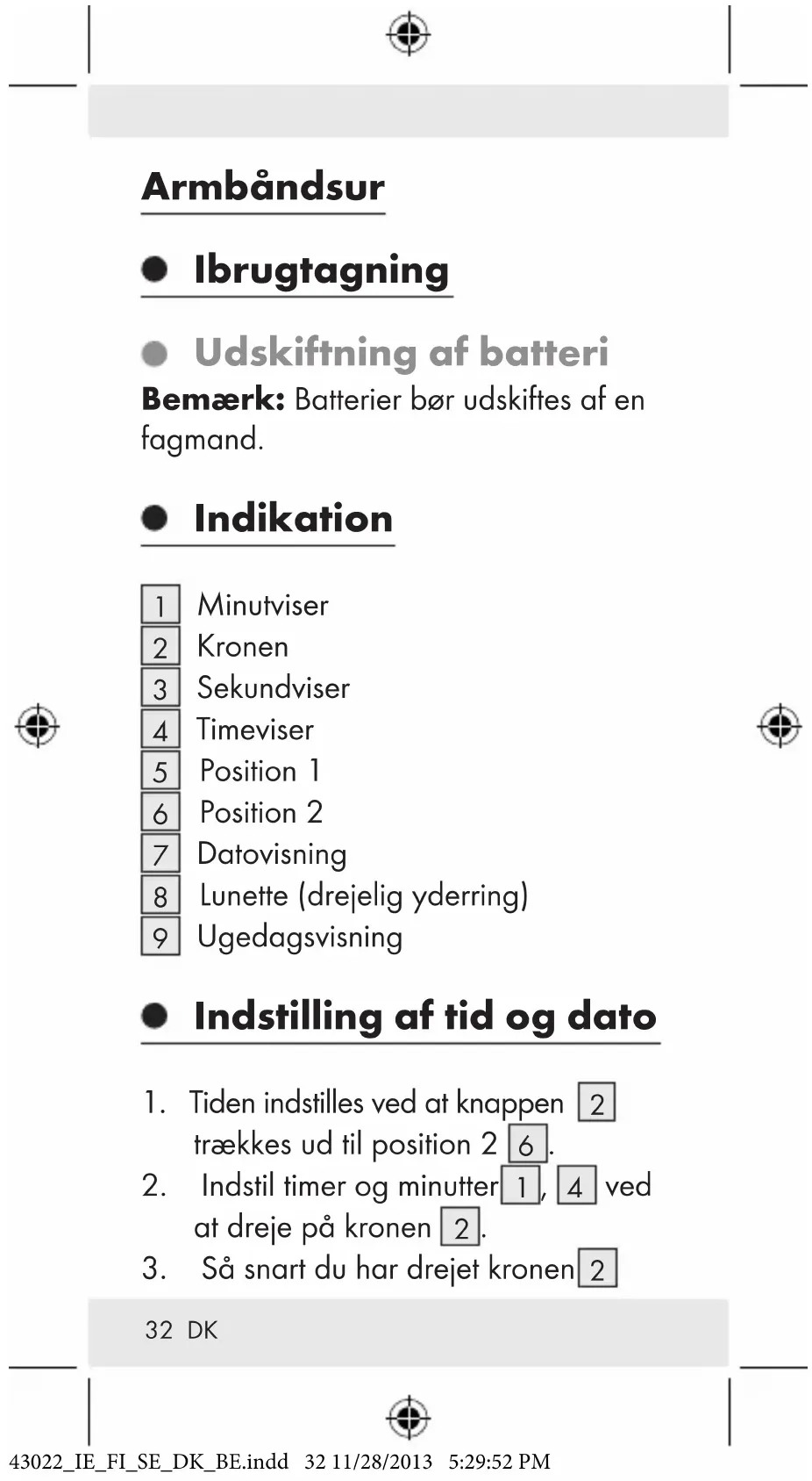 Miljøskader på grund af forkert bortskaffelse af batterier! Batterier må ikke bortskaffes med husholdningsaffald. De kan indeholde giftige tungmetaller og er underlagt behandling af miljøskadelig affald. De kemiske symboler for tungmetaller er følgende: Cd = kadmium, Hg = kviksølv, Pb = bly. Aflever derfor brugte batterier på Deres kommunale opsamlingsplads. GARANTI Apparatet er produceret omhyggeligt efter strenge kvalitetskrav og inden levering afprøvet samvittighedsfuldt. Hvis der forekommer mangler ved dette produkt, har du juridiske rettigheder over for sælgeren af dette produkt. Disse juridiske rettigheder indskrænkes ikke af vores garanti, der beskrives i det følgende. Du får 3 års garanti fra købsdatoen på dette apparat. Garantifristen begynder 43022_IE_FI_SE_DK_BE.indd 37 11/28/2013 5:29:52 PM38 DK med købsdatoen. Opbevar den originale kassebon på et sikkert sted. Denne kassebon behøves som dokumentation for købet. Hvis der inden for tre år fra købsdatoen for dette produkt opstår en materiale- eller fabrikationsfejl, bliver produktet repareret eller erstattet - efter vores valg - af os uden omkostninger for dig. Garantien bortfalder, hvis apparatet bliver beskadiget eller ikke anvendes eller vedligeholdes korrekt. Garantien gælder for materiale- eller fabrikationsfejl. Denne garanti dækker ikke produktdele, som er udsat for normalt slid og derfor kan betragtes som normale sliddele (f.eks. batterier) eller ved skader på skrøbelige dele; f.eks. kontakter, akkumulatorer som er fremstillet i glas. Formindskelsen af vandtætheden er ligeledes ikke dækket af garantien. Vandtæthedens tilstand er heller ikke nogen varig egenskab og bør derfor 43022_IE_FI_SE_DK_BE.indd 38 11/28/2013 5:29:52 PM39 DK regelmæssigt vedligeholdes. Vær venligst opmærksom på at ved åbning og reparation af Deres ur gennem personer som ikke er autoriseret hertil, så ophører Deres garantikrav. 43022_IE_FI_SE_DK_BE.indd 39 11/28/2013 5:29:52 PM40 FR/BE Montre
