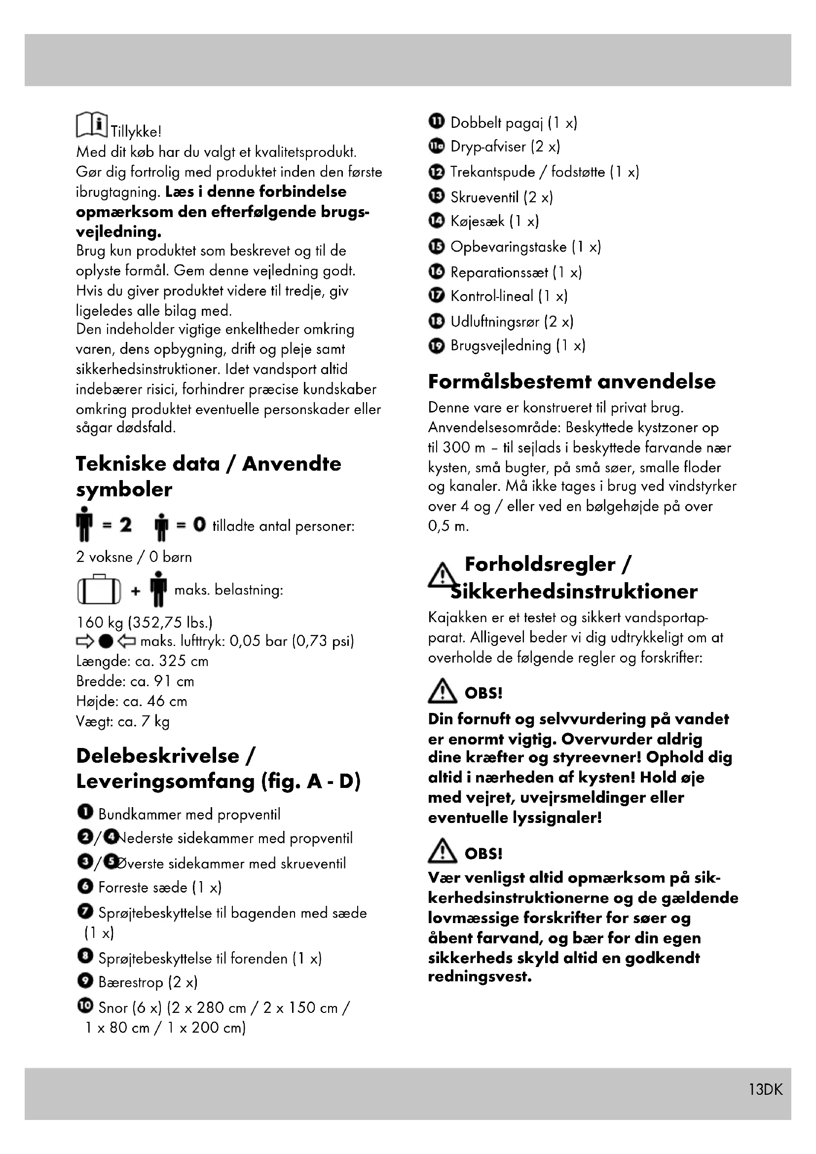 - 3 års garanti Overholder kravene i ISO 6185-1, kategori III, type B13DK Tillykke! Med dit køb har du valgt et kvalitetsprodukt. Gør dig fortrolig med produktet inden den første ibrugtagning. Læs i denne forbindelse opmærksom den efterfølgende brugs- vejledning. Brug kun produktet som beskrevet og til de oplyste formål. Gem denne vejledning godt. Hvis du giver produktet videre til tredje, giv ligeledes alle bilag med. Den indeholder vigtige enkeltheder omkring varen, dens opbygning, drift og pleje samt sikkerhedsinstruktioner. Idet vandsport altid indebærer risici, forhindrer præcise kundskaber omkring produktet eventuelle personskader eller sågar dødsfald. Tekniske data / Anvendte symboler tilladte antal personer: 2 voksne / 0 børn maks. belastning: 160 kg (352,75 lbs.) maks. lufttryk: 0,05 bar (0,73 psi) Længde: ca. 325 cm Bredde: ca. 91 cm Højde: ca. 46 cm Vægt: ca. 7 kg Delebeskrivelse / Leveringsomfang (fig. A - D) Bundkammer med propventil / Nederste sidekammer med propventil / Øverste sidekammer med skrueventil Forreste sæde (1 x) Sprøjtebeskyttelse til bagenden med sæde (1 x) Sprøjtebeskyttelse til forenden (1 x) Bærestrop (2 x) Snor (6 x) (2 x 280 cm / 2 x 150 cm / 1 x 80 cm / 1 x 200 cm) Dobbelt pagaj (1 x) Dryp-afviser (2 x) Trekantspude / fodstøtte (1 x) Skrueventil (2 x) Køjesæk (1 x) Opbevaringstaske (1 x) Reparationssæt (1 x) Kontrol-lineal (1 x) Udluftningsrør (2 x) Brugsvejledning (1 x) Formålsbestemt anvendelse Denne vare er konstrueret til privat brug. Anvendelsesområde: Beskyttede kystzoner op til 300 m – til sejlads i beskyttede farvande nær kysten, små bugter, på små søer, smalle floder og kanaler. Må ikke tages i brug ved vindstyrker over 4 og / eller ved en bølgehøjde på over 0,5 m. Forholdsregler / Sikkerhedsinstruktioner Kajakken er et testet og sikkert vandsportap- parat. Alligevel beder vi dig udtrykkeligt om at overholde de følgende regler og forskrifter: OBS! Din fornuft og selvvurdering på vandet er enormt vigtig. Overvurder aldrig dine kræfter og styreevner! Ophold dig altid i nærheden af kysten! Hold øje med vejret, uvejrsmeldinger eller eventuelle lyssignaler! OBS! Vær venligst altid opmærksom på sik- kerhedsinstruktionerne og de gældende lovmæssige forskrifter for søer og åbent farvand, og bær for din egen sikkerheds skyld altid en godkendt redningsvest.14 DK ADVARSEL! Kvælningsfare for børn! Lad aldrig dine børn lege med emballagen eller varen uden opsyn. ADVARSEL! Hvis en person går over bord skal genindstigningen finde sted over boven eller agterenden, idet der er stor fare for at båden kæntrer, hvis man forsøger at stige ind igen fra siden. Fare for personskader! Vær forsigtigt ved fralandsvind! Vær forsigtig ved fralandsstrøm! p. 18
