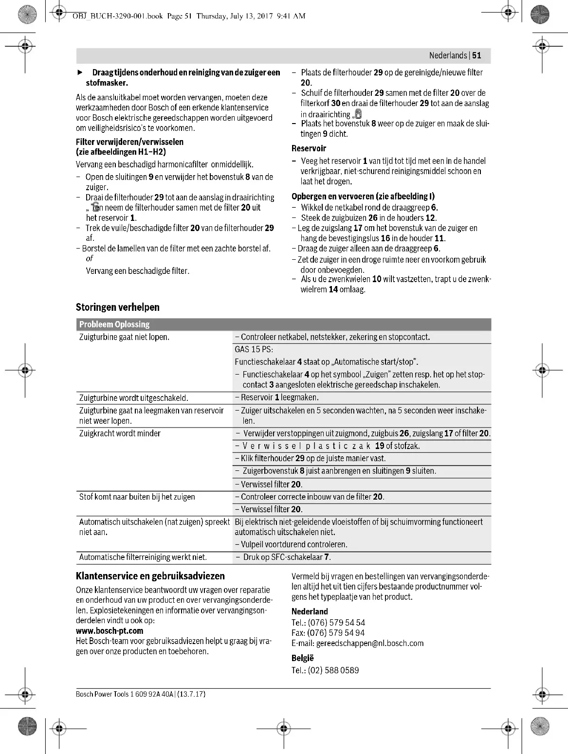 – Schuif de filterhouder 29 samen met de filter 20 over de filterkorf 30 en draai de filterhouder 29 tot aan de aanslag in draairichting „ ”. – Plaats het bovenstuk 8 weer op de zuiger en maak de slui- tingen 9 dicht. Reservoir – Veeg het reservoir 1 van tijd tot tijd met een in de handel verkrijgbaar, niet-schurend reinigingsmiddel schoon en laat het drogen. Opbergen en vervoeren (zie afbeelding I) – Wikkel de netkabel rond de draaggreep 6. – Steek de zuigbuizen 26 in de houders 12. – Leg de zuigslang 17 om het bovenstuk van de zuiger en hang de bevestigingslus 16 in de houder 11. – Draag de zuiger alleen aan de draaggreep 6. – Zet de zuiger in een droge ruimte neer en voorkom gebruik door onbevoegden. –Als u de zwenkwielen 10 wilt vastzetten, trapt u de zwenk- wielrem 14 omlaag. Storingen verhelpen Klantenservice en gebruiksadviezen Onze klantenservice beantwoordt uw vragen over reparatie en onderhoud van uw product en over vervangingsonderde- len. Explosietekeningen en informatie over vervangingson- derdelen vindt u ook op: www.bosch-pt.com Het Bosch-team voor gebruiksadviezen helpt u graag bij vra- gen over onze producten en toebehoren. Vermeld bij vragen en bestellingen van vervangingsonderde- len altijd het uit tien cijfers bestaande productnummer vol- gens het typeplaatje van het product. Nederland Tel.: (076) 579 54 54 Fax: (076) 579 54 94 E-mail: gereedschappen@nl.bosch.com België Tel.: (02) 588 0589 Probleem Oplossing Zuigturbine gaat niet lopen. – Controleer netkabel, netstekker, zekering en stopcontact. GAS 15 PS: Functieschakelaar 4 staat op „Automatische start/stop”. –Functieschakelaar 4 op het symbool „Zuigen” zetten resp. het op het stop- contact 3 aangesloten elektrische gereedschap inschakelen. Zuigturbine wordt uitgeschakeld. – Reservoir 1 leegmaken. Zuigturbine gaat na leegmaken van reservoir niet weer lopen. – Zuiger uitschakelen en 5 seconden wachten, na 5 seconden weer inschake- len. Zuigkracht wordt minder – Verwijder verstoppingen uit zuigmond, zuigbuis 26, zuigslang 17 of filter 20. –Verwissel plastic zak 19 of stofzak. – Klik filterhouder 29 op de juiste manier vast. –Zuigerbovenstuk 8 juist aanbrengen en sluitingen 9 sluiten. – Verwissel filter 20. Stof komt naar buiten bij het zuigen – Controleer correcte inbouw van de filter 20. – Verwissel filter 20. Automatisch uitschakelen (nat zuigen) spreekt niet aan. Bij elektrisch niet-geleidende vloeistoffen of bij schuimvorming functioneert automatisch uitschakelen niet. – Vulpeil voortdurend controleren. Automatische filterreiniging werkt niet. –Druk op SFC-schakelaar 7. OBJ_BUCH-3290-001.book Page 51 Thursday, July 13, 2017 9:41 AM52 | Dansk 1 609 92A 40A | (13.7.17) Bosch Power ToolsFax: (02) 588 0595E-mail: outillage.gereedschap@be.bosch.com Afvalverwijdering Zuiger, toebehoren en verpakkingen dienen op een voor het milieu verantwoorde wijze te worden gerecycled.Gooi de zuiger niet bij het huisvuil.Wijzigingen voorbehouden. Dansk Sikkerhedsinstrukser Læs alle sikkerhedsinstrukser og anvisninger. I tilfælde af manglende overholdelse af sikker-hedsinstrukserne og anvisningerne er der risiko for elektrisk stød, brand og/eller alvorlige kvæ-stelser.Disse instrukser bør opbevares til senere brug. Denne støvsuger er ikke beregnet til at blive betjent af børn eller per- soner med begrænsede fysiske, sensoriske eller mentale evner el- ler manglende erfaring og viden. I modsats fald er der risiko for fejlbe- tjening og personskader. Hold børn under opsyn. Derved sik- res det, at børn ikke bruger støvsuge- ren som legetøj. Opsug ikke sundhedsfarlige stoffer som f.eks. bøgetræs- eller egetræs-støv, stenstøv og asbest. Disse stoffer gælder som kræft-fremkaldende.Indhent information om de gældende regler/love vedr. håndtering af sundhedsfarligt støv i dit land.Brug kun støvsugeren, hvis du har modtaget tilstrækkelige informatio-ner om brugen af den. En grundig instruktion reducerer risi-koen for forkert betjening og skader.Sugeren er egnet til at opsuge tørre stoffer; træffes egnede foranstaltnin-ger, er den også egnet til at opsuge væsker. Indtrængning af væske øger risikoen for at få elektrisk stød. Brug ikke sugeren til at opsuge brændbare eller eksplo-sive væsker som f.eks. benzin, olie, alkohol eller opløs-ningsmidler. Opsug ikke varmt eller brændende støv. Brug ikke sugeren i eksplosionsfarlige rum. Støv, dam-pe eller væsker kan antændes eller eksplodere.Brug kun stikdåsen til de formål, der er fastlagt i betjeningsvejledningen.Sluk straks for sugeren, så snart skum eller vand strømmer ud og tøm behol-deren. Ellers kan sugeren blive beskadiget.Sørg for, at sugeren ikke udsættes for regn eller fugtighed. Indtrængning af vand i sugerens overdel øger risikoen for elektrisk stød.Sugeren må kun opbevares i indvendige rum. Rengør svømmeren med regelmæssige mellemrum og kontrollér, om den er be-skadiget. Ellers kan funktionen forringes. Hvis det ikke kan undgås at bruge sugeren i fugtige om-givelser, skal der bruges et HFI-relæ. Brug af et HFI-relæ reducerer risikoen for at få elektrisk stød. Tilslut sugeren til et korrekt jordforbundet strømnet. Stikdåse og forlængerledning skal være forsynet med en funktionsdygtig jordledning. Kontrollér altid suger, kabel og stik før brug. Anvend ikke sugeren, hvis den er beskadiget. Forsøg ikke at åb-ne sugeren og sørg for, at den kun repareres af kvalifi-cerede fagfolk, og at der kun benyttes originale reser-vedele. Beskadigede sugere, kabler og stik øger risikoen for elektrisk stød. Und gå at køre hen over eller klemme ledningen. Træk ikke i ledningen for at trække stikket ud af stikdåsen el- ler bevæge sugeren. Beskadigede ledninger øger risikoen for elektrisk stød. Træk stikket ud af stikkontakten, inden sugeren vedli-geholdes eller rengøres, indstillinger foretages på ma-skinen, der skiftes tilbehørsdele eller sugeren lægges fra. Disse sikkerhe