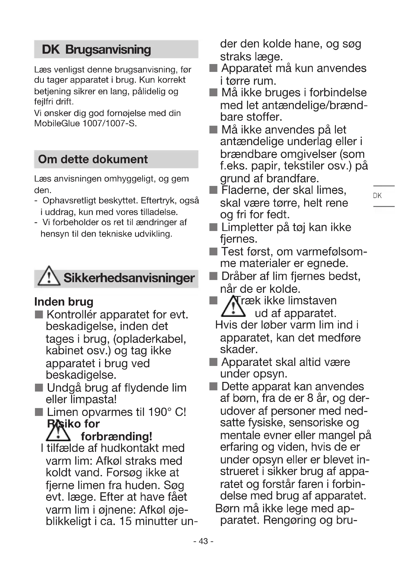 GARANTI TILLVERKAR ÅRS GARANTI TILLVERKAR ÅRS GARANTI Tillverkargaranti Tillverkargaranti STEINEL GmbH, Diesel-straße 80-84, 33442 Herzebrock-ClarholzAlla produkter från STEINEL uppfyller högsta kvalitetsanspråk. Av den anledningen tillhan-dahåller vi som tillverkare dig som slutkund gärna en garanti enligt nedanstående villkor:Garantin omfattar frihet från brister, som bevisligen beror på ett material- eller tillverk-ningsfel och omgående meddelas oss efter att det konstaterats och inom garantitiden. Garantin gäller för samtliga STEINEL-pro-dukter som köps och används i Tyskland, uteslutande STEINEL Professional-produk-terna.Du kan välja, om vi ska fullgöra garantin ge-nom en gratis reparation, gratis utbyte (evtl. genom en lik- eller mervärdig, nyare modell) eller genom ett tillgodohavande.Garantitiden för den STEINEL-produkt som du köpt är 3 år alltid från produktens inköpsdatum. Vi åtar oss transportkostnaderna för returs-ändningen men inte transportriskerna.Garantirättigheter, kostnadsfrihetDe tjänster som beskrivs här gäller utöver de lagliga garantianspråken - inklusive särskilda skyddsbestämmelser för konsumenterna - och begränsar eller ersätter inte dessa. Att utöva sina lagliga rättigheter vid brister är kostnadsfritt.- 43 - DK Brugsanvisning Læs venligst denne brugsanvisning, før du tager apparatet i brug. Kun korrekt betjening sikrer en lang, pålidelig og fejlfri drift. Vi ønsker dig god fornøjelse med din MobileGlue 1007/1007-S. Om dette dokument Læs anvisningen omhyggeligt, og gem den. - Ophavsretligt beskyttet. Eftertryk, også i uddrag, kun med vores tilladelse. - Vi forbeholder os ret til ændringer af hensyn til den tekniske udvikling. Inden brug Kontrollér apparatet for evt. beskadigelse, inden det tages i brug, (opladerkabel, kabinet osv.) og tag ikke apparatet i brug ved beskadigelse. Undgå brug af flydende lim eller limpasta! Limen opvarmes til 190° C! Risiko for forbrænding! I tilfælde af hudkontakt med varm lim: Afkøl straks med koldt vand. Forsøg ikke at fjerne limen fra huden. Søg evt. læge. Efter at have fået varm lim i øjnene: Afkøl øje- blikkeligt i ca. 15 minutter un- Sikkerhedsanvisninger der den kolde hane, og søg straks læge. Apparatet må kun anvendes i tørre rum. Må ikke bruges i forbindelse med let antændelige/brænd- bare stoffer. Må ikke anvendes på let antændelige underlag eller i brændbare omgivelser (som f.eks. papir, tekstiler osv.) på grund af brandfare. Fladerne, der skal limes, skal være tørre, helt rene og fri for fedt. Limpletter på tøj kan ikke fjernes. Test først, om varmefølsom- me materialer er egnede. Dråber af lim fjernes bedst, når de er kolde. Træk ikke limstaven ud af apparatet. Hvis der løber varm lim ind i apparatet, kan det medføre skader. Apparatet skal altid være under opsyn. Dette apparat kan anvendes af børn, fra de er 8 år, og der- udover af personer med ned- satte fysiske, sensoriske og mentale evner eller mangel på erfaring og viden, hvis de er under opsyn eller er blevet in- strueret i sikker brug af appa- ratet og forstår faren i forbin- delse med brug af apparatet. Børn må ikke lege med ap- paratet. Rengøring og bru- DK- 44 - gervedligeholdelse må kun udføres af børn, hvis de er under opsyn. Vi garanterer kun for en fejlfri funktion ved brug af originale STEINEL-limstave. USB-ladekabel Hold opladerkablet rent. Der er risiko for elektrisk stød på grund af tilsmudsning. Opbevar apparatet i tempe- raturområdet 0° C til 35° C. Oplad kun enheden med det medfølgende USB-opladerkabel (type 15.3841). Oplad ikke batterier fra tredjeparter. Ellers er der risiko for brand og eksplosion. Genopladeligt batteri Apparat og batteri må ikke åbnes. Risiko for kortslut- ning. Batteriet må ikke tages ud. Henvend dig til det sted, hvor du har købt apparatet, hvis der opstår problemer. Lithium-ion-batteriet kan altid oplades, uden at det påvirker levetiden. En afbrydelse af opladningen beskadiger ikke batteriet. Hvis apparatet ikke skal bruges i en længere periode, skal det opbevares med op- ladet batteri. Det forlænger lithium-ion-batteriets levetid. Tilsigtet brug Dette el-værktøj er kun beregnet til op- løsningsmiddelfri limning af hobbymate- rialer og dele inden for modelbyggeri. Ved ukorrekt brug eller be- skadigelse af batteriet kan der komme dampe eller elek- trolytvæske ud af batteriet. Sørg for frisk luft, og søg læ- ge i tilfælde af smerter. Dam- pene kan irritere luftvejene. Anvendelsesområde Batteridrevet limstift med lithium-ion- batteri. Den perfekte universallim til hob- byarbejde, dekoration og reparation. Velegnet til: Papir, pap, kork, træ, læder, tekstiler, plastik, keramik, skumplast, fliser ...- 45 - Beskrivelse USB-opladerkabel LED-display Stikkontakt til opladerkabel ON/OFF-knap Fremføringsaftrækker Limstav Funktion og betjening ■ Inden apparatet tages i brug første gang, skal det oplades helt (2-3 timer) for at øge batteriets levetid (se Opladning/anvendelse). ■ Stik limstaven ind i opvarmningska- nalen. ■ Ved første ibrugtagning er det nød- vendigt at fremføre limstaven flere gange for at fylde varmekammeret med lim. Det kan være nødvendigt at trykke bag på limstaven for at føre den helt frem. ■ For ikke at kunne tænde apparatet utilsigtet skal man holde knappen inde i ca. 2 sekunder. Den grønne LED blinker i 15 sekunder. ■ Tryk på fremføringen, og påfør limen på den ene side. ■ Tryk emnerne, der skal limes, hårdt sammen, og korriger ved behov. ■ Efter kort tid (ca. 2 minutter) kan sam- lingen belastes fuldt ud! ■ I forbindelse med store, lange emner anbefaler vi punktlimning. ■ Kan også problemfrit anvendes til f.eks. polystyrenskum. Her skal man dog sørge for at påføre den varme lim på underlaget og ikke på polystyren- skummet. ■ Til limning af tekstiler o.l. materialer anbefaler vi at påføre limen i striber. ■ Lad apparatet afkøle efter brug. Opladn