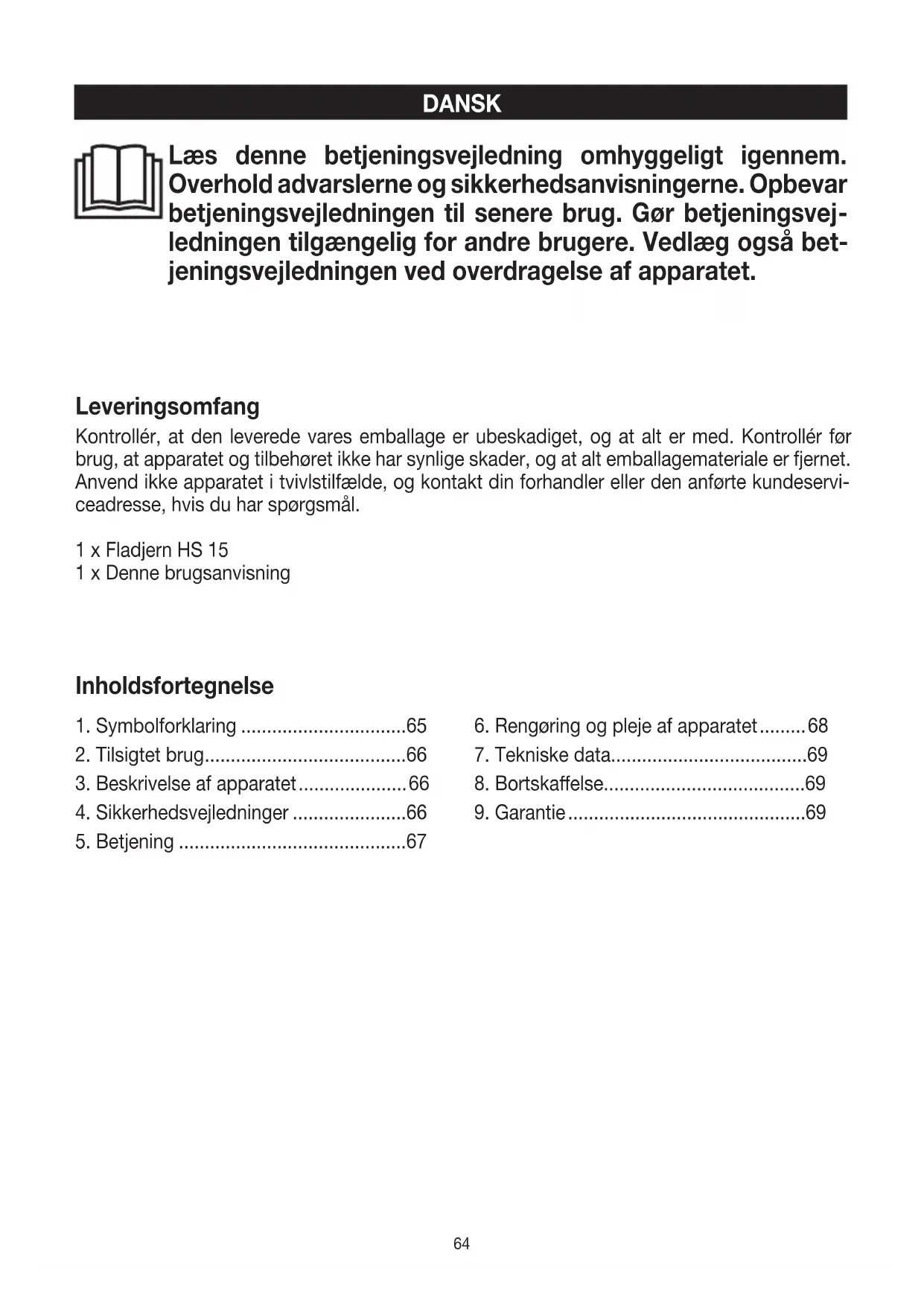 ledningen tilgængelig for andre brugere. Vedlæg også bet- jeningsvejledningen ved overdragelse af apparatet. Leveringsomfang Kontrollér, at den leverede vares emballage er ubeskadiget, og at alt er med. Kontrollér før brug, at apparatet og tilbehøret ikke har synlige skader, og at alt emballagemateriale er fjernet. Anvend ikke apparatet i tvivlstilfælde, og kontakt din forhandler eller den anførte kundeservi- ceadresse, hvis du har spørgsmål. 1 x Fladjern HS 15 1 x Denne brugsanvisning