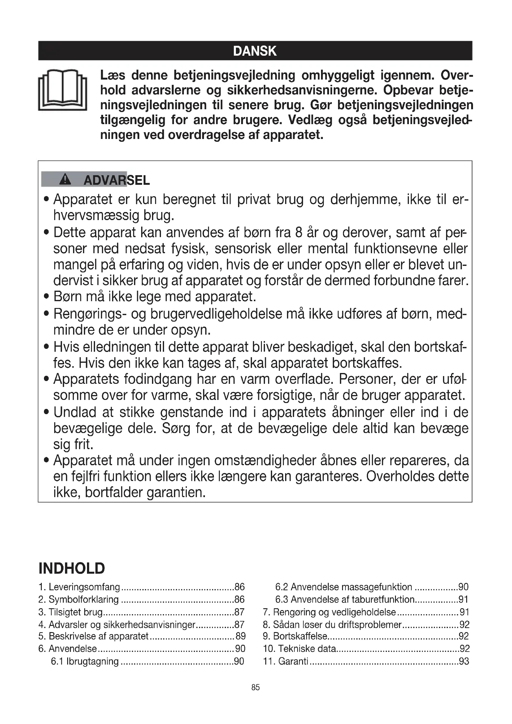 - Apparatet må under ingen omstændigheder åbnes eller repareres, da en fejlfri funktion ellers ikke længere kan garanteres. Overholdes dette ikke, bortfalder garantien. INDHOLD86
