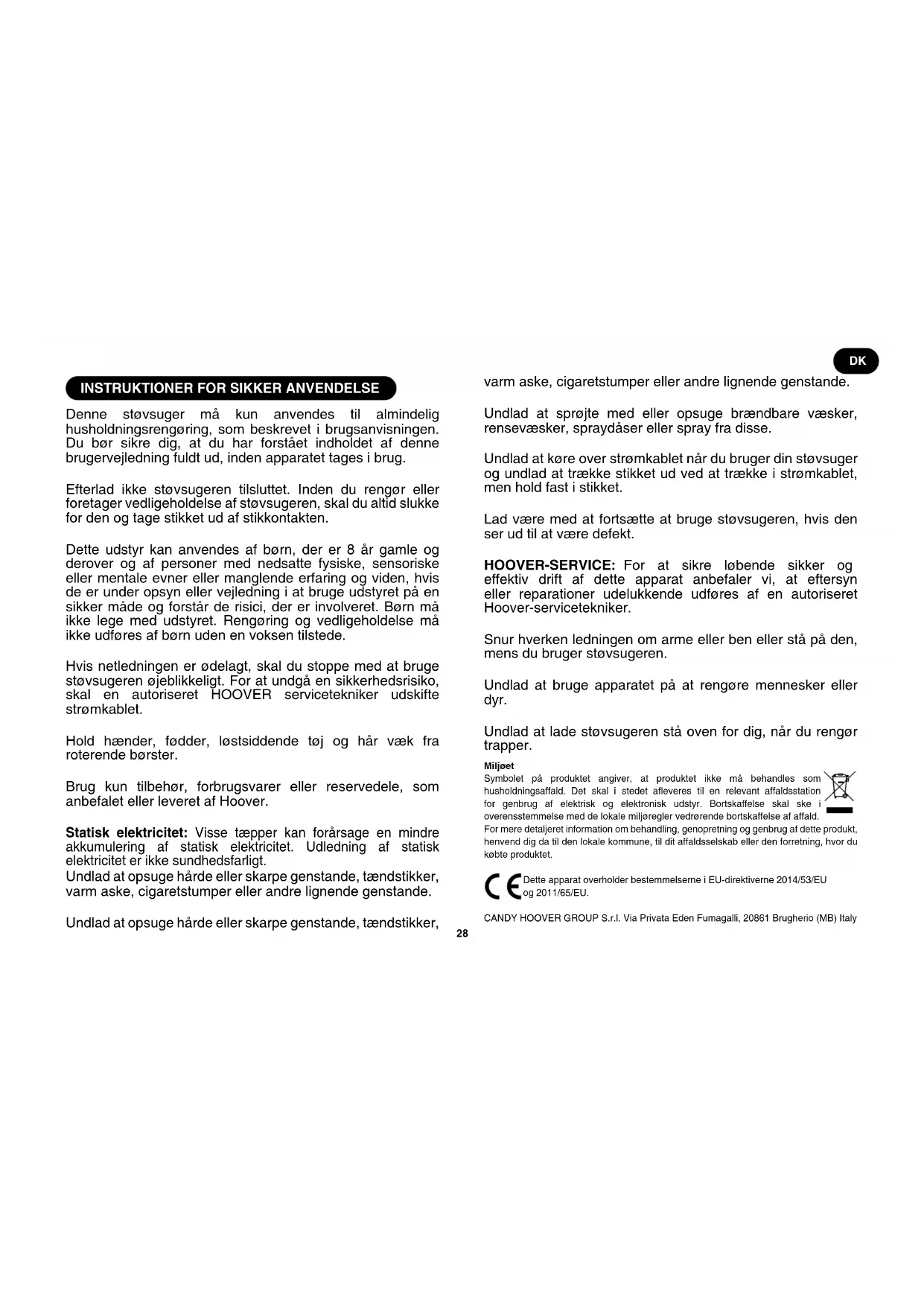 Denne støvsuger må kun anvendes til almindelig husholdningsrengøring, som beskrevet i brugsanvisningen. Du bør sikre dig, at du har forstået indholdet af denne brugervejledning fuldt ud, inden apparatet tages i brug. Efterlad ikke støvsugeren tilsluttet. Inden du rengør eller foretager vedligeholdelse af støvsugeren, skal du altid slukke for den og tage stikket ud af stikkontakten. Dette udstyr kan anvendes af børn, der er 8 år gamle og derover og af personer med nedsatte fysiske, sensoriske eller mentale evner eller manglende erfaring og viden, hvis de er under opsyn eller vejledning i at bruge udstyret på en sikker måde og forstår de risici, der er involveret. Børn må ikke lege med udstyret. Rengøring og vedligeholdelse må ikke udføres af børn uden en voksen tilstede. Hvis netledningen er ødelagt, skal du stoppe med at bruge støvsugeren øjeblikkeligt. For at undgå en sikkerhedsrisiko, skal en autoriseret HOOVER servicetekniker udskifte strømkablet. Hold hænder, fødder, løstsiddende tøj og hår væk fra roterende børster. Brug kun tilbehør, forbrugsvarer eller reservedele, som anbefalet eller leveret af Hoover. Statisk elektricitet: Visse tæpper kan forårsage en mindre akkumulering af statisk elektricitet. Udledning af statisk elektricitet er ikke sundhedsfarligt. Undlad at opsuge hårde eller skarpe genstande, tændstikker, varm aske, cigaretstumper eller andre lignende genstande. Undlad at opsuge hårde eller skarpe genstande, tændstikker, varm aske, cigaretstumper eller andre lignende genstande. Undlad at sprøjte med eller opsuge brændbare væsker, rensevæsker, spraydåser eller spray fra disse. Undlad at køre over strømkablet når du bruger din støvsuger og undlad at trække stikket ud ved at trække i strømkablet, men hold fast i stikket. Lad være med at fortsætte at bruge støvsugeren, hvis den ser ud til at være defekt. HOOVER-SERVICE: For at sikre løbende sikker og effektiv drift af dette apparat anbefaler vi, at eftersyn eller reparationer udelukkende udføres af en autoriseret Hoover-servicetekniker. Snur hverken ledningen om arme eller ben eller stå på den, mens du bruger støvsugeren. Undlad at bruge apparatet på at rengøre mennesker eller dyr. Undlad at lade støvsugeren stå oven for dig, når du rengør trapper. Miljøet Symbolet på produktet angiver, at produktet ikke må behandles som husholdningsaffald. Det skal i stedet aeveres til en relevant affaldsstation for genbrug af elektrisk og elektronisk udstyr. Bortskaffelse skal ske i overensstemmelse med de lokale miljøregler vedrørende bortskaffelse af affald. For mere detaljeret information om behandling, genopretning og genbrug af dette produkt, henvend dig da til den lokale kommune, til dit affaldsselskab eller den forretning, hvor du købte produktet. Dette apparat overholder bestemmelserne i EU-direktiverne 2014/53/EU og 2011/65/EU. CANDY HOOVER GROUP S.r.l. Via Privata Eden Fumagalli, 20861 Brugherio (MB) Italy DK29