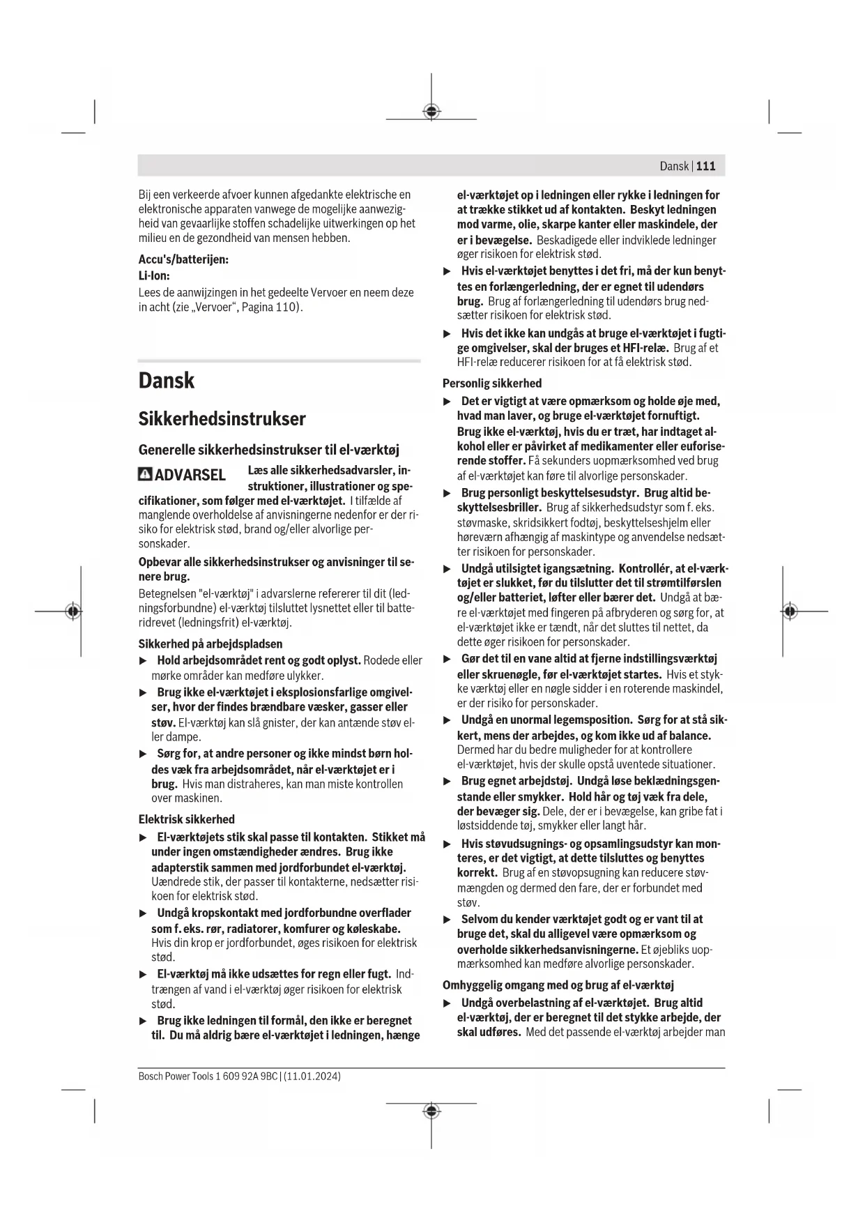 Målt ved 20−25°C med akkuProCORE18V 8.0Ah. B) afhængigt af den anvendte akku C) Begrænset ydelse ved temperaturer <0°C. Værdierne kan varierer afhængigt af produktet samt anvendelses- og miljøbetingelserne. Du kan finde flere oplysninger under www.bosch-professional.com/wac. Tilladte emnemål (maksimalt/minimalt): (se "Tilladte emnemål", Side121) Støjinformation Støjemissionsværdier fundet iht. ENIEC62841-3-9. El-værktøjets A‑vægtede støjniveau er typisk: Lydtrykniveau 97dB(A); lydeffektniveau 106dB(A). Usikkerhed K=3dB. Brug høreværn! Det støjemissionsniveau, der er angivet i nærværende in- struktioner, er blevet målt iht. en standardiseret målepro- ces, og kan bruges til at sammenligne el‑værktøjer. Det er også egnet til en foreløbig vurdering af støjemissionen. Den angivne støjemissionsværdi repræsenterer de væsentli- ge anvendelser af el‑værktøjet. Hvis el‑værktøjet dog anven- des til andre formål, med afvigende indsatsværktøj eller util- strækkelig vedligeholdelse, kan støjemissionsniveauet afvi- ge. Dette kan føre til en betydelig forøgelse af støjemissio- nen i hele arbejdstidsrummet. Til en nøjagtig vurdering af støjemissionen bør der også tages højde for de tider, i hvilke værktøjet er slukket eller godt nok kører, men rent faktisk ikke anvendes. Dette kan føre til en betydelig reduktion af støjemissionsniveauet i hele arbejdstidsrummet. Akku Bosch sælger også akku-værktøjer uden akku. Om der følger en akku med din leverance fremgår af emballagen. Opladning af akku u Brug kun de ladeaggregater, der fremgår af de tekni- ske data. Kun disse ladeaggregater er afstemt i forhold til den Li-ion-akku, der bruges på dit el-værktøj. Bemærk! Lithium-ion-akkuer udleveres delvis opladet på grund af internationale transportforskrifter. For at sikre at akkuen fungerer 100%, skal du oplade akkuen helt i op- laderen før første ibrugtagning. Isætning af akku Skub den opladede akkuind i akkuholderen, så den går hør- bart i indgreb. Udtagning af akku Akkuen tages ud ved at trykke på akku-oplåsningsknap- penog trække akkuen ud af el-værktøjet. Undgå brug af vold. Akkuen har to låsetrin, der forhindrer, at den falder ud, hvis du skulle komme til at trykke på akku-udløserknappenved et uheld. Så længe akkuen sidder i el-værktøjet, holdes den i position af en fjeder. Akku-ladetilstandsindikator Bemærk! Ikke alle akku-typer er udstyret med ladetilstands- indikator. De grønne lysdioder på akku-ladetilstandsindikatoren viser akkuens ladetilstand. Af sikkerhedsgrunde er det kun muligt at forespørge om ladetilstanden, når el-værktøjet er stands- et. Tryk på tasten til ladetilstandsindikatoren eller for at få vist ladetilstanden. Dette er også muligt, når akkuen er taget ud. Hvis ingen lysdioder lyser efter tryk på tasten til ladetilstand- sindikatoren, er akkuen defekt og skal udskiftes. Akku-type GBA 18V... LED Kapacitet Konstant lys 3× grøn 60–100% Konstant lys 2× grøn 30–60% Konstant lys 1× grøn 5–30% Blinkende lys 1× grøn 0–5% Akku-type ProCORE18V... LED Kapacitet Konstant lys 5× grøn 80–100% Konstant lys 4× grøn 60–80% 1 609 92A 9BC | (11.01.2024) Bosch Power ToolsDansk | 117 LED Kapacitet Konstant lys 3× grøn 40–60% Konstant lys 2× grøn 20–40% Konstant lys 1× grøn 5–20% Blinkende lys 1× grøn 0–5% Henvisninger til optimal håndtering af akkuen Beskyt akkuen mod fugtighed og vand. Opbevar kun akkuen i et temperaturområde fra −20°C til 50°C. Opbevar ikke akkuen i bilen f.eks. om sommeren. Rengør akkuens ventilationsåbninger en gang imellem med en blød, ren og tør pensel. Når driftstiden pr. opladning forkortes væsentligt, er det tegn på, at akkuerne er slidt op og skal udskiftes. Læs og overhold henvisningerne mht. bortskaffelse. Montering u Tag altid akkuen ud af el‑værktøjet, før der arbejdes på el‑værktøjet (f.eks. vedligeholdelse, værktøjsskift osv.) samt før det transporteres og lægges til opbeva- ring. Utilsigtet aktivering af start-stop-kontakten er for- bundet med kvæstelsesfare. Leveringsomfang Bemærk oversigten over leverancen i starten af brugsanvisningen. Kontrollér at alle dele, der nævnes i det følgende, er blevet leveret sammen med el-værktøjet, før det tages i brug første gang: – Kap-/geringssav med monteret savklinge – Klemhjul (45) – Indstillelig anslagsskinne (26) – Skruetvinge (41) – Unbrakonøgle/krydskærvsskruetrækker (43) – Støvpose (37) – Emneunderlag (24) (2stk.) Bemærk: Kontrollér el-værktøjet for eventuelle beskadigel- ser. Inden fortsat brug af el-værktøjet skal sikkerhedsanordnin- ger eller let beskadigede dele kontrolleres omhyggeligt for at konstatere, om værktøjet kan fungere rigtigt til de formål, det er beregnet til. Kontrollér, at de bevægelige dele funge- rer korrekt og ikke sidder fast, eller om delene er beskadiget. Alle dele skal være monteret rigtigt og alle betingelser op- fyldt for at sikre en fejlfri drift. Beskadigede beskyttelsesanordninger og dele skal repareres eller udskiftes korrekt på et anerkendt værksted. Montering af enkeltdele – Tag alle medleverede dele forsigtigt ud af emballagen. – Fjern al emballagen fra el-værktøjet og det medleverede tilbehør. – Sørg for, at el-værktøjet er i transportstilling, da dette let- ter arbejdet med montering af de medfølgende maskine- lementer. Montering af emneunderlag (se billedeA1) Emneunderlagene (24) kan anbringes til venstre, højre eller foran på el-værktøjet. Det fleksible monteringssystem giver mulighed for at gøre underlaget længere og bredere (se billedeG). – Sæt emneunderlagene (24) i holderne (47) på el-værktø- jet eller i holderne (48) på det ekstra emneunderlag. u Bær aldrig el-værktøjet i emneunderlagene. Brug kun transportanordningerne ved transport af el- værktøjet. Montering af klemhjul (se billedeA2) Klemhjulet (45) låser den indstillede lodrette geringsvinke