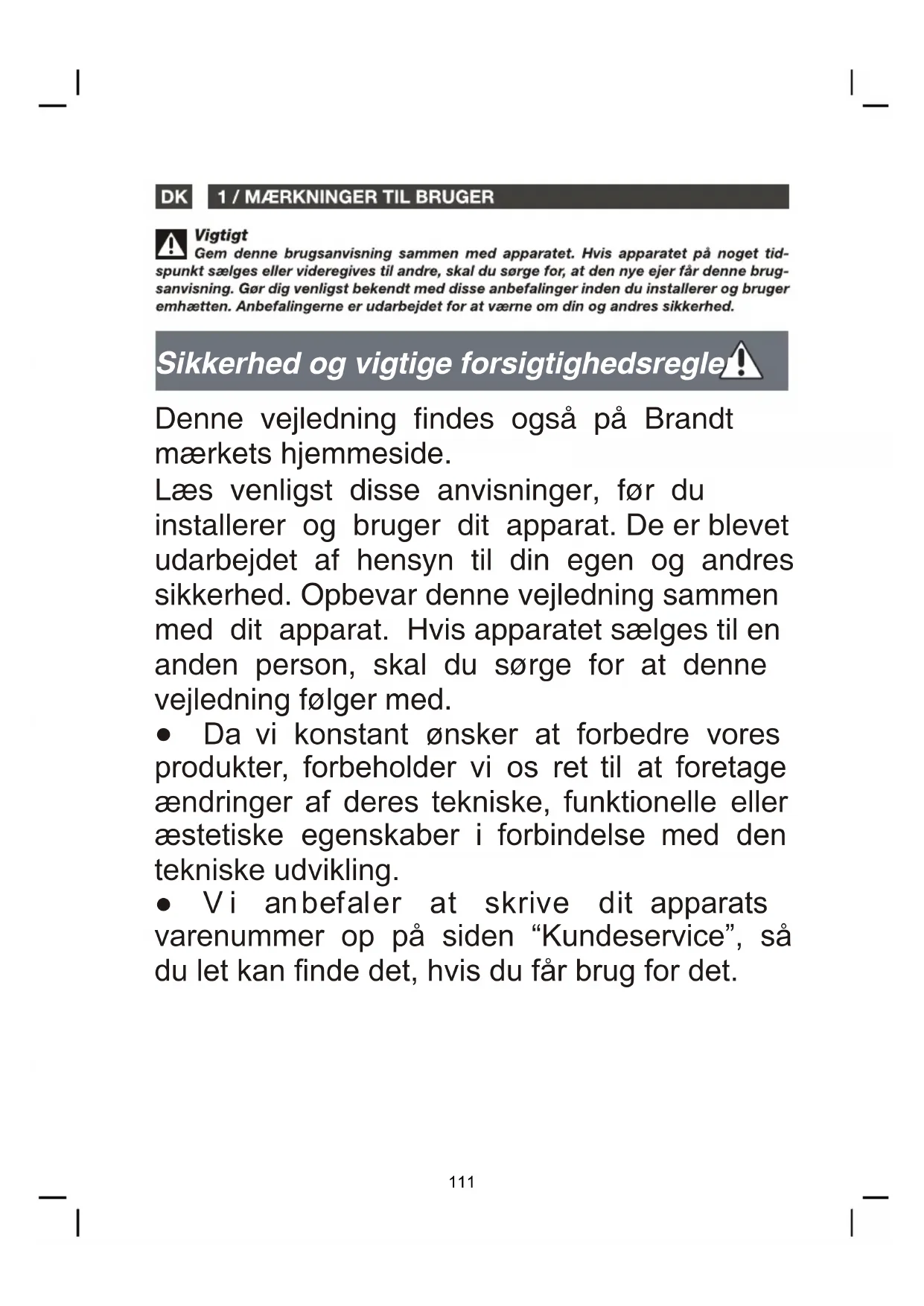 109Sikkerhed og vigtige forsigtighedsregler Denne vejledning findes også på Brandt mærkets hjemmeside. Læs venligst disse anvisninger, før du installerer og bruger dit apparat. De er blevet udarbejdet af hensyn til din egen og andres sikkerhed. Opbevar denne vejledning sammen med dit apparat. Hvis apparatet sælges til en anden person, skal du sørge for at denne vejledning følger med.